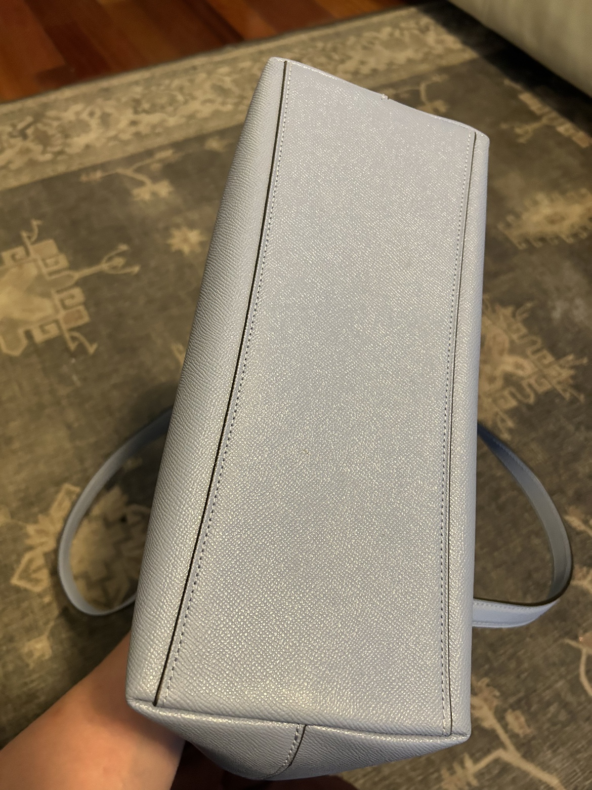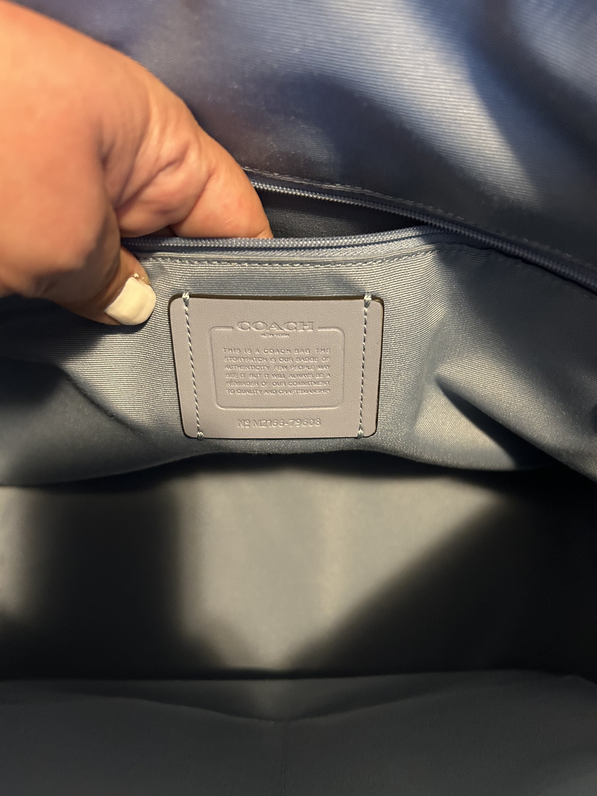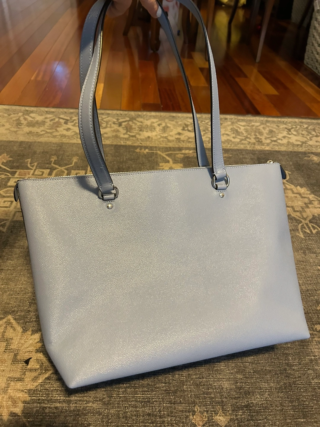 Beautiful coach bag - stands up just lovely on a table or desk - baby blue - pristine condition! Several pockets & zips Easily is placed on the shoulder & comfortably worn - 16” wide x 12” height can fit a laptop, or lunch, wallet, small portfolio excellent buy.