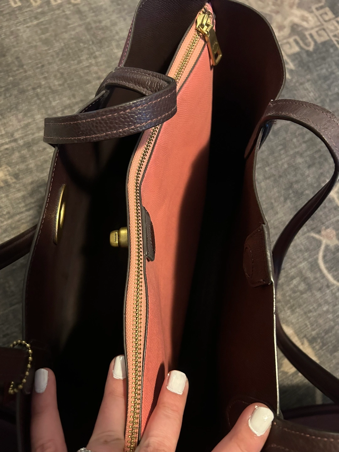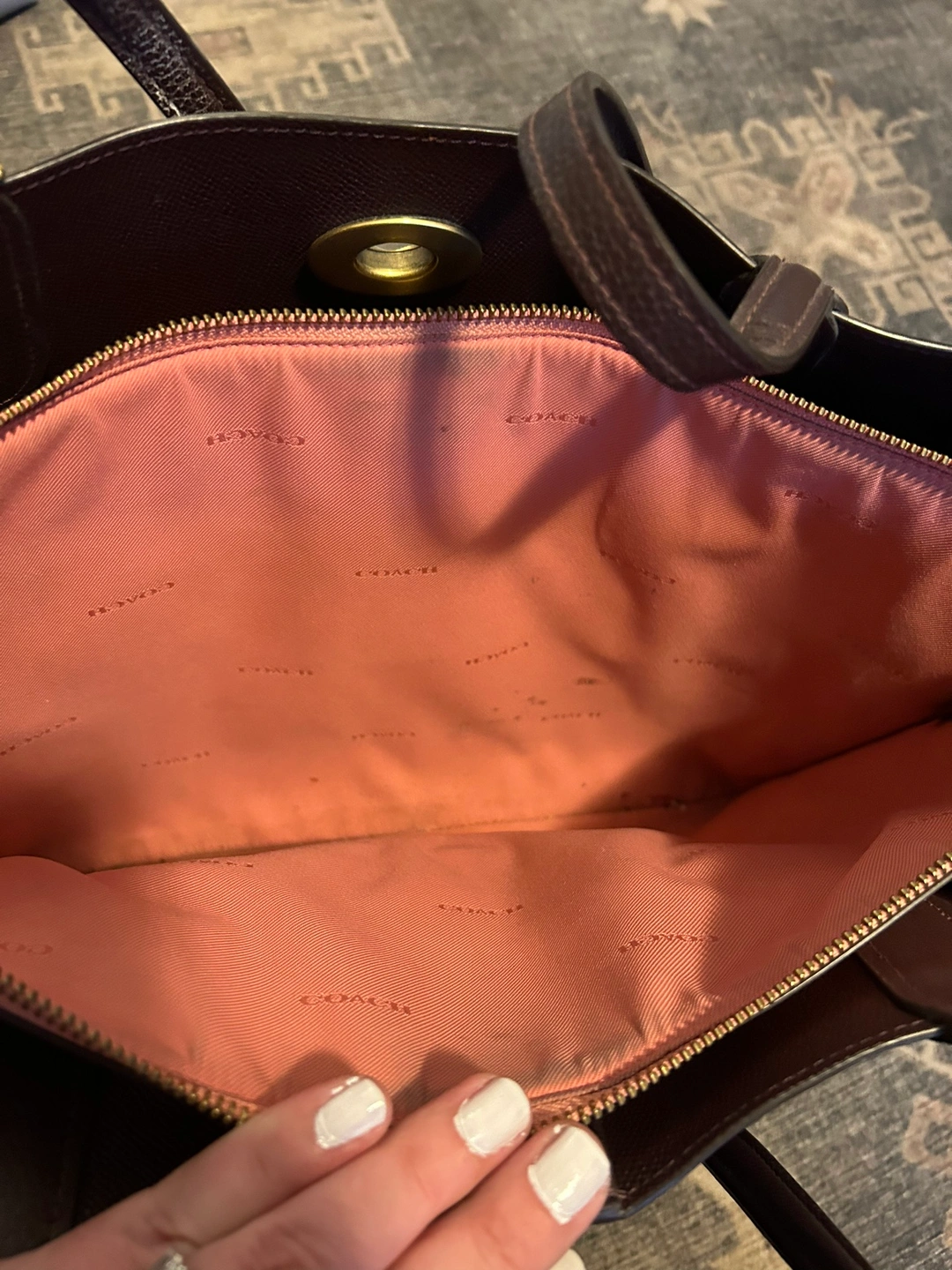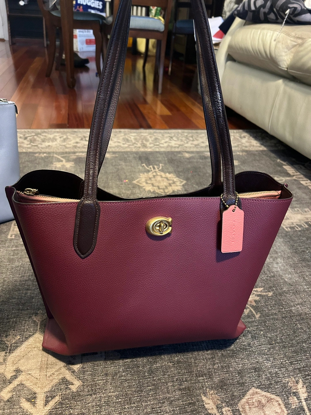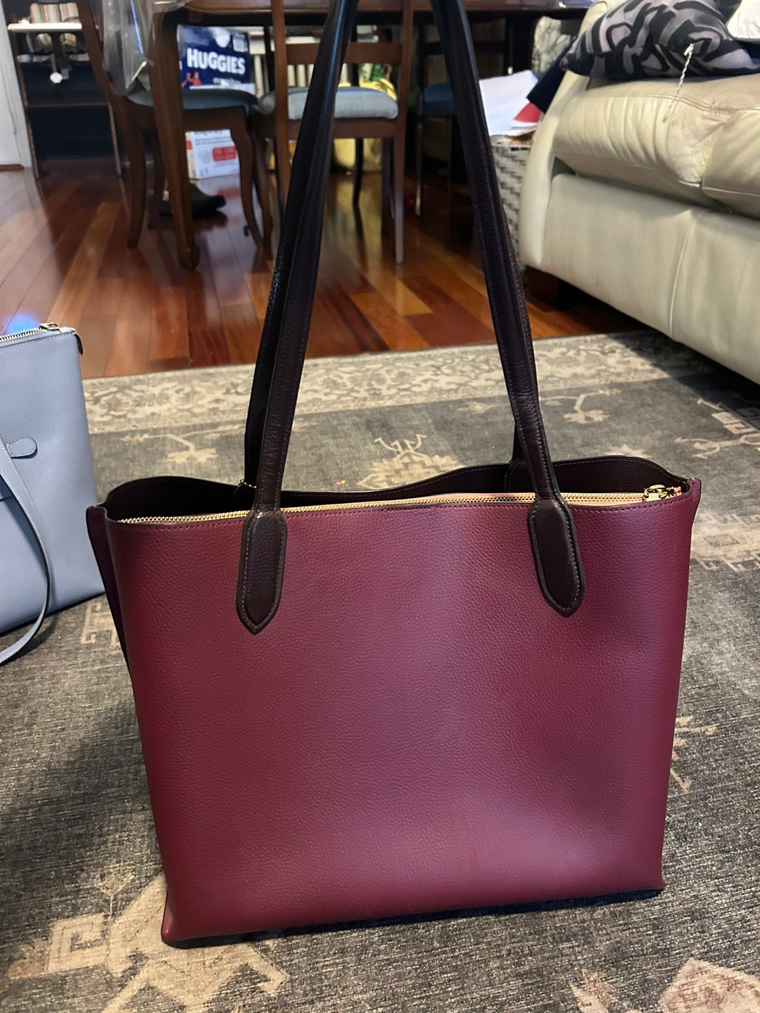 Beautiful burgundy maroon coach bag EUC 16” wide by 11” height - can fit a laptop in bag lunch wallet small portfolio - beautiful shoulder bag that sits comfortably on your shoulder - easy to put on and stays on your shoulder & easy take off shoulder. It’s a good buy !