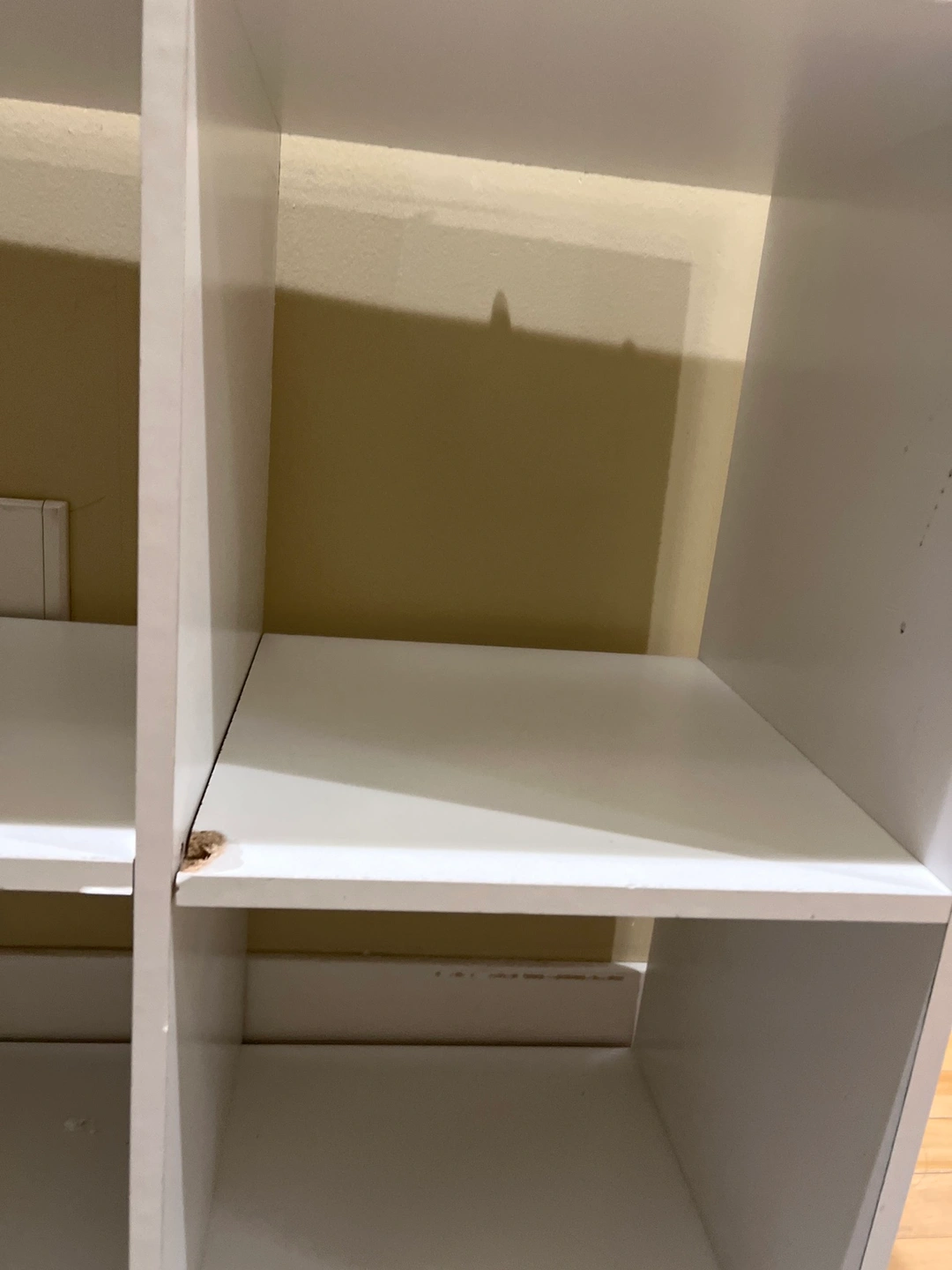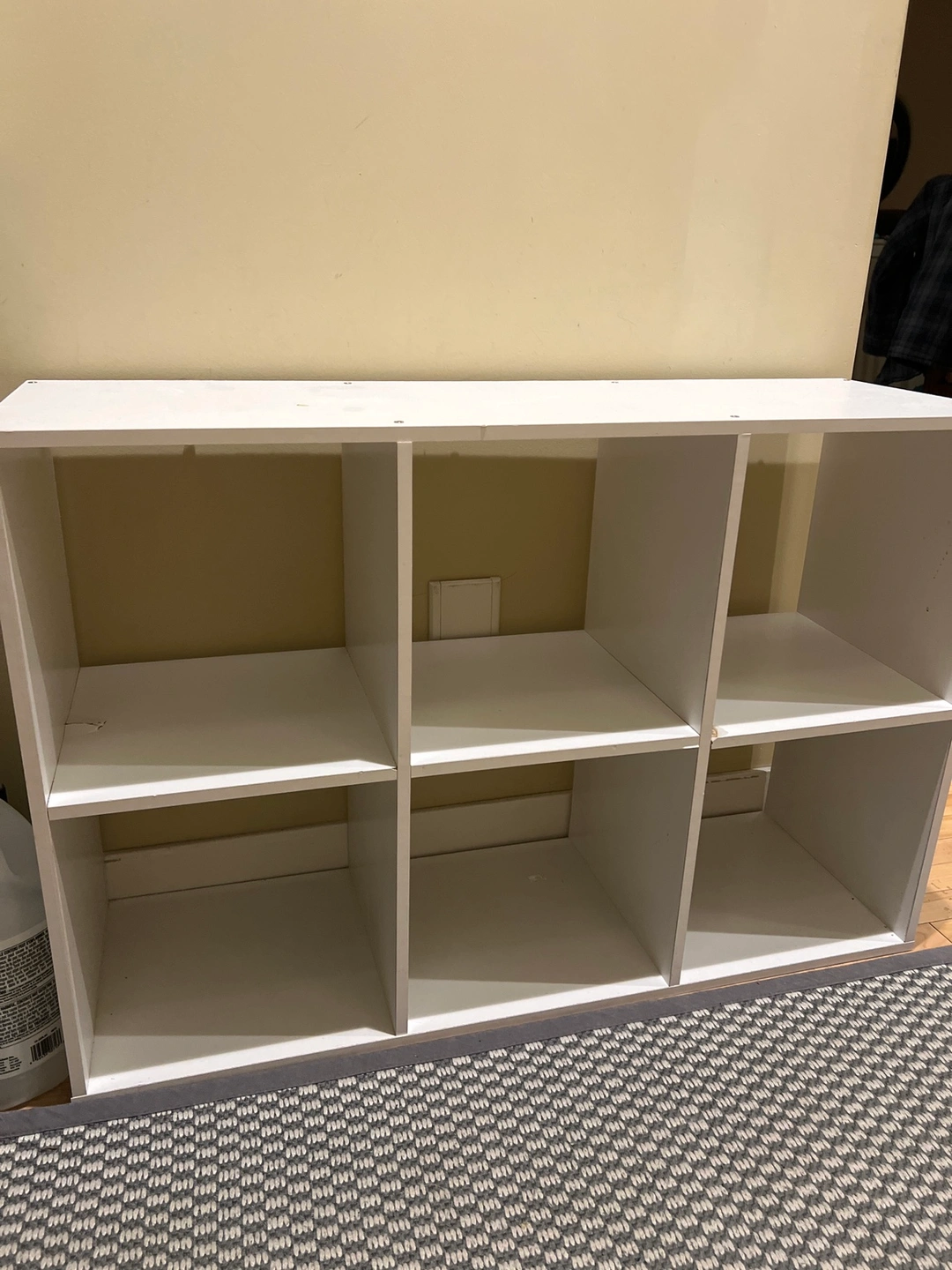 Little damage to the shelves, but perfectly usable and fixable. Also doubles as a bench to sit on, just don’t add too much weight. Perfect for storing little things, medium things, or random things.