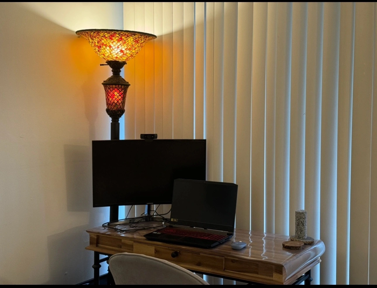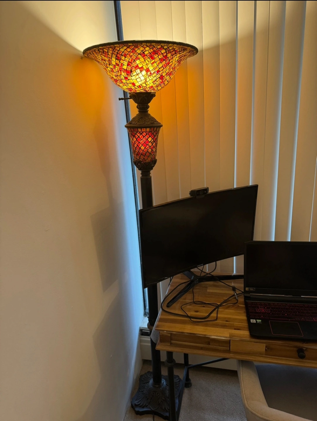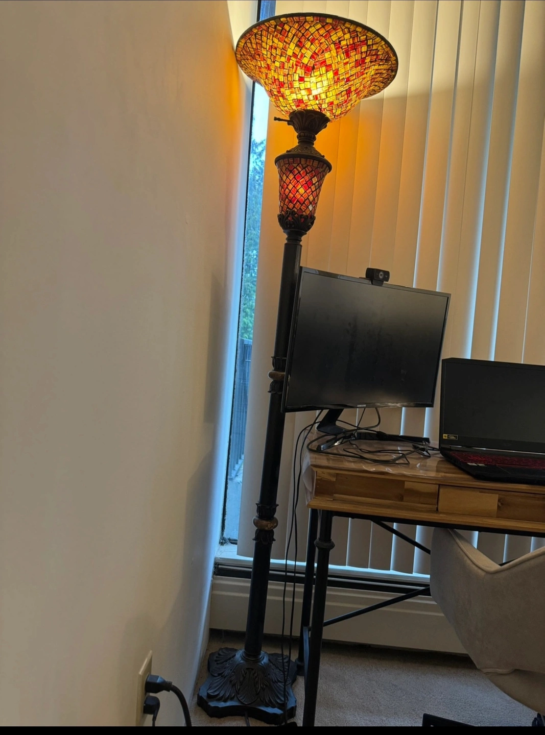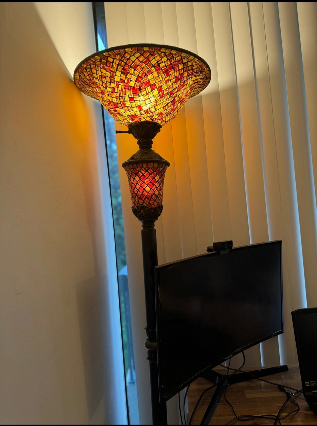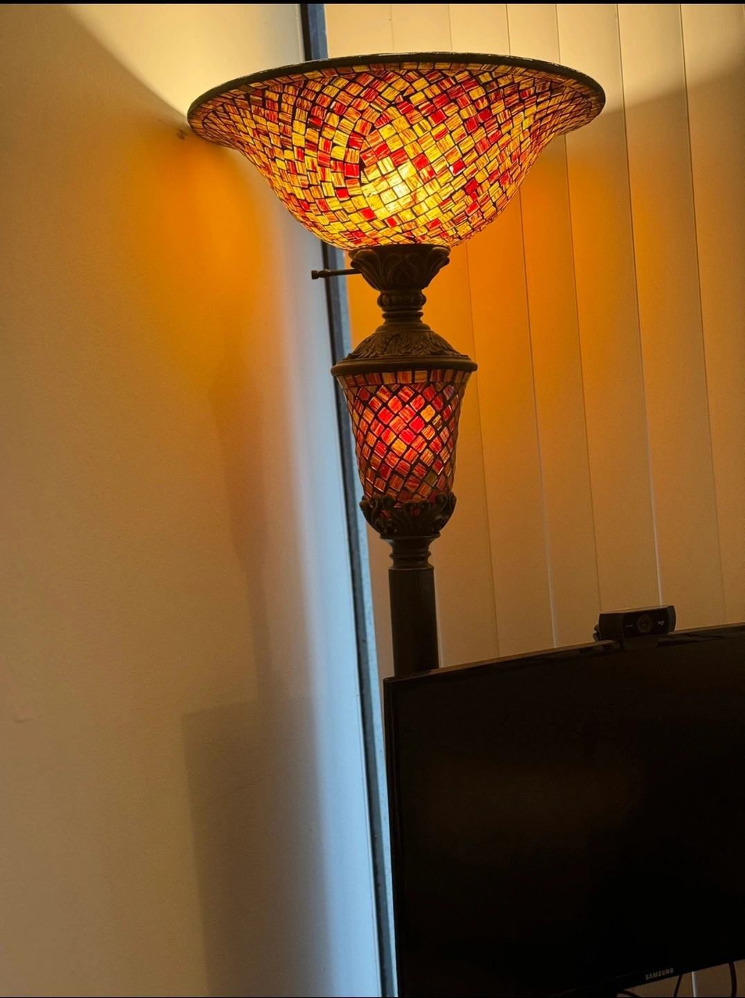 Brighten up your home with this stunning Tiffany style floor lamp. It's almost brand new and works flawlessly, adding a touch of elegance to any room. There are no scratches or cracks – it's in perfect condition! The lamp is very sturdy and well built.
