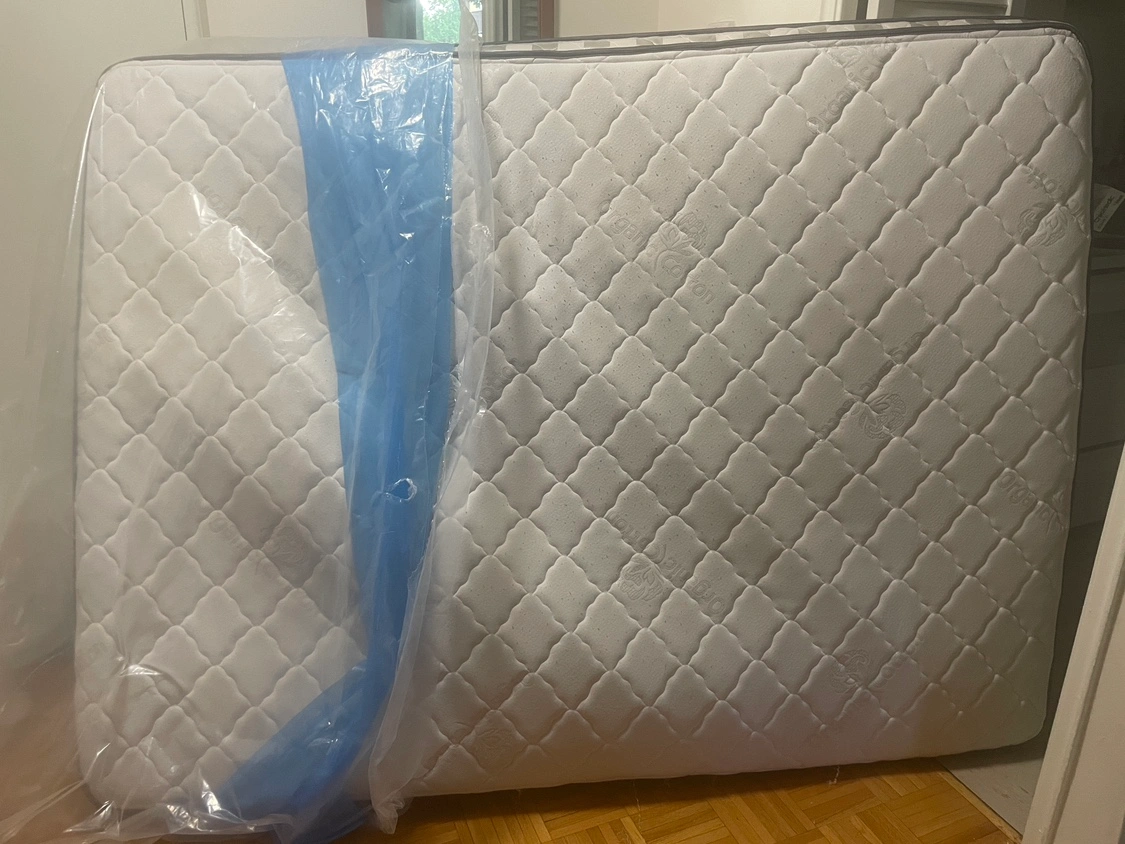Just purchased a new mattress. This was bought from the brick about 7 years ago. Had a mattress cover and sheet on it for the majority of its life. Still life left if you’re in need of a mattress. No stains but you can feel a few springs on the side.