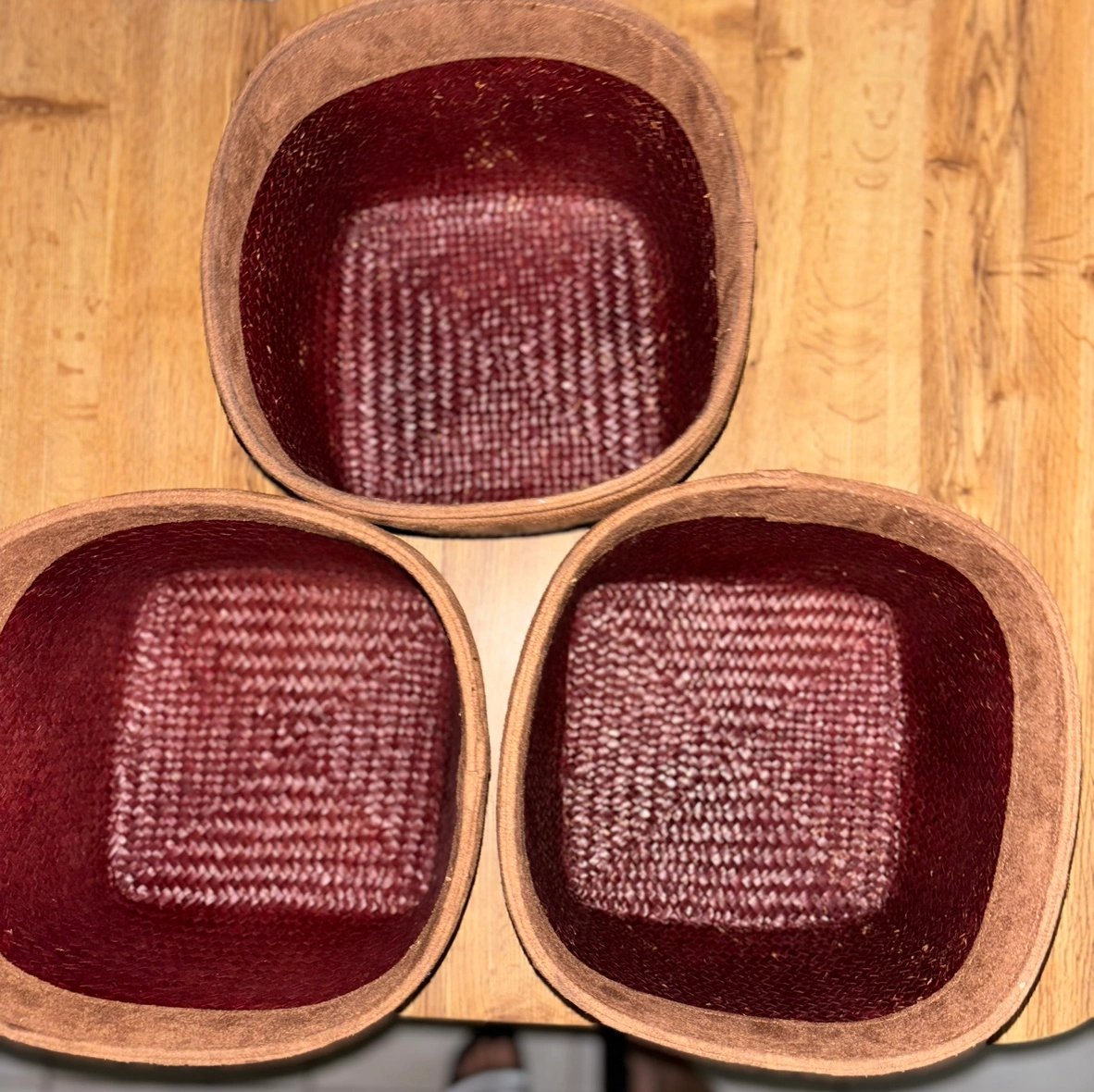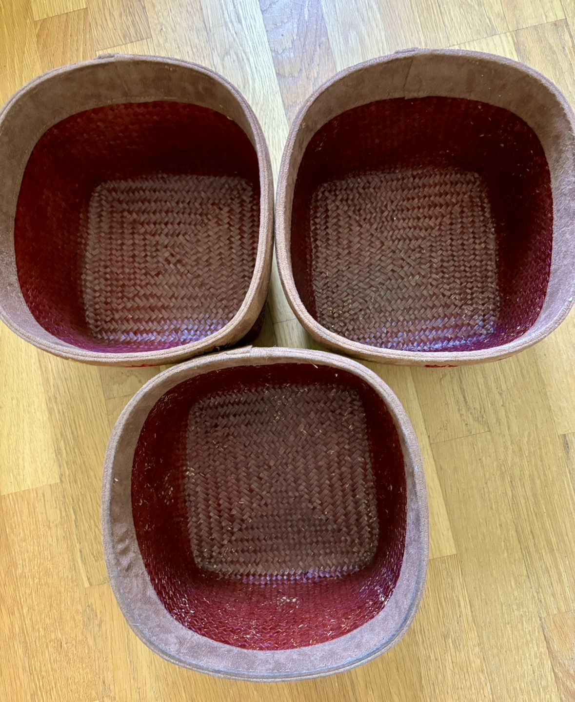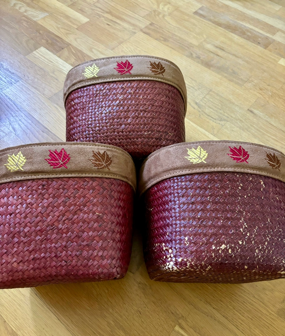 Woven storage baskets with an embroidered autumn leaf design. Each basket has a suede trim. Each 24cm D, 24cm W, 18cm H.