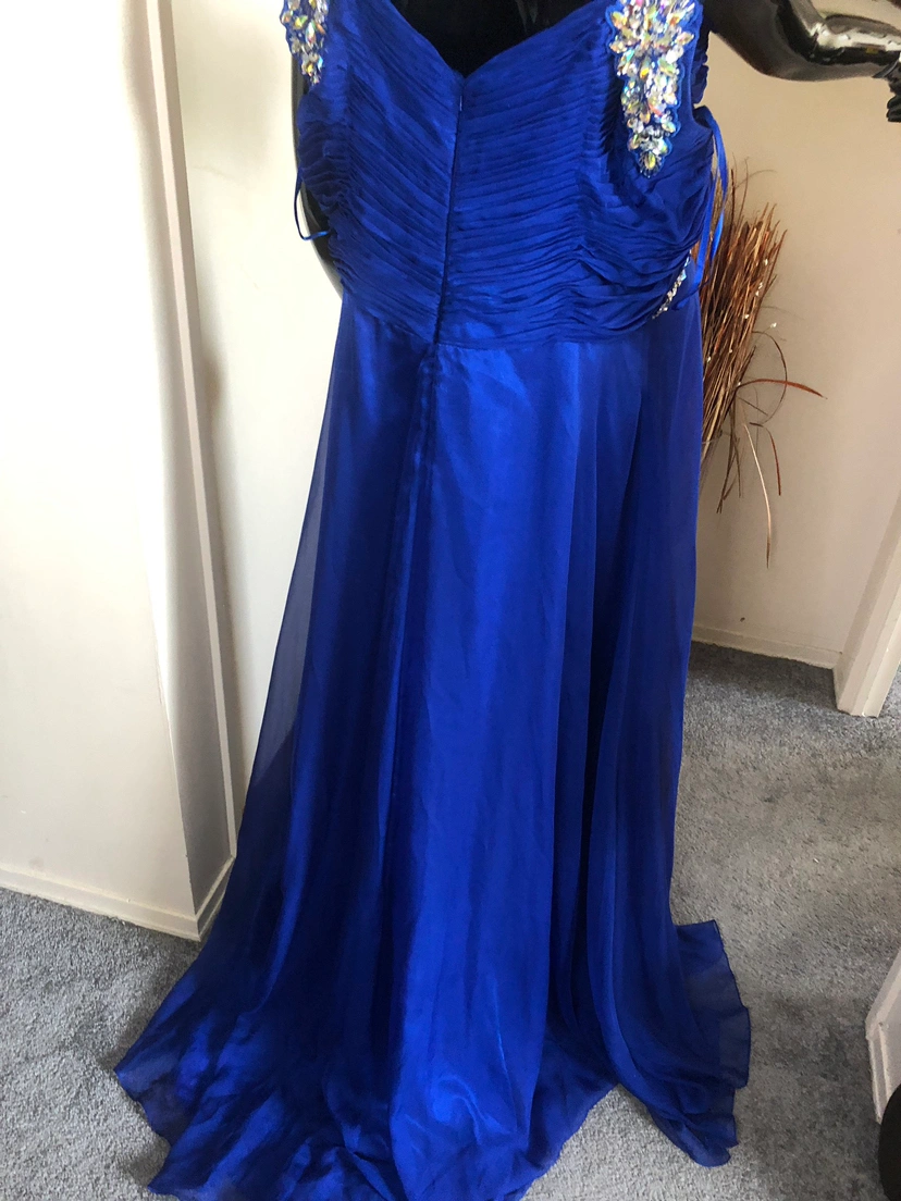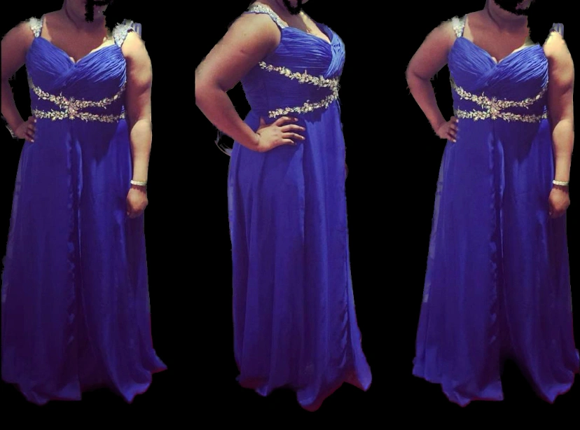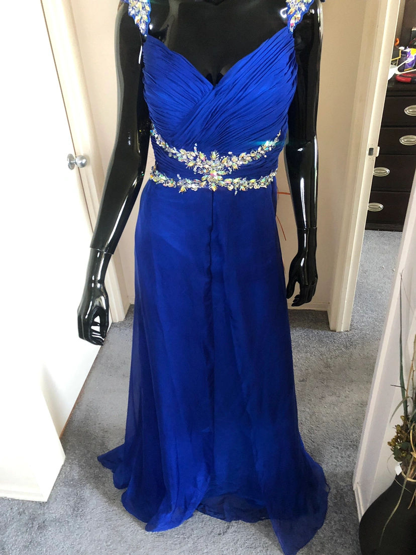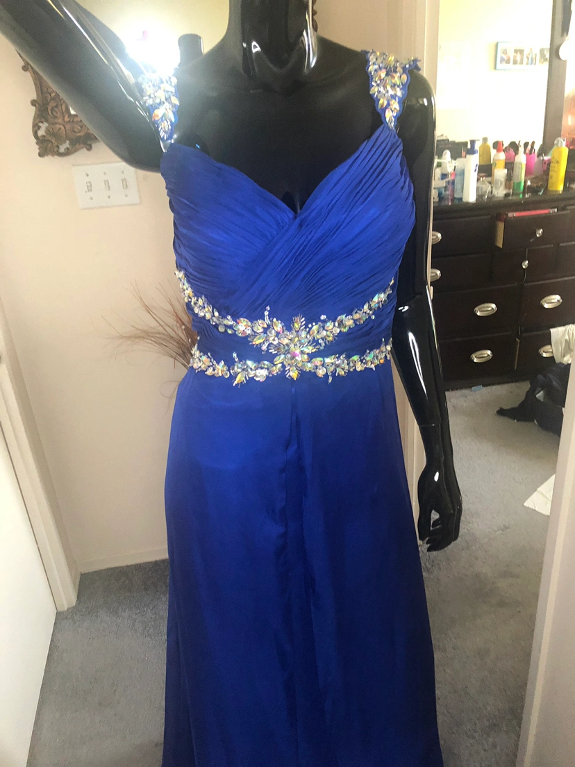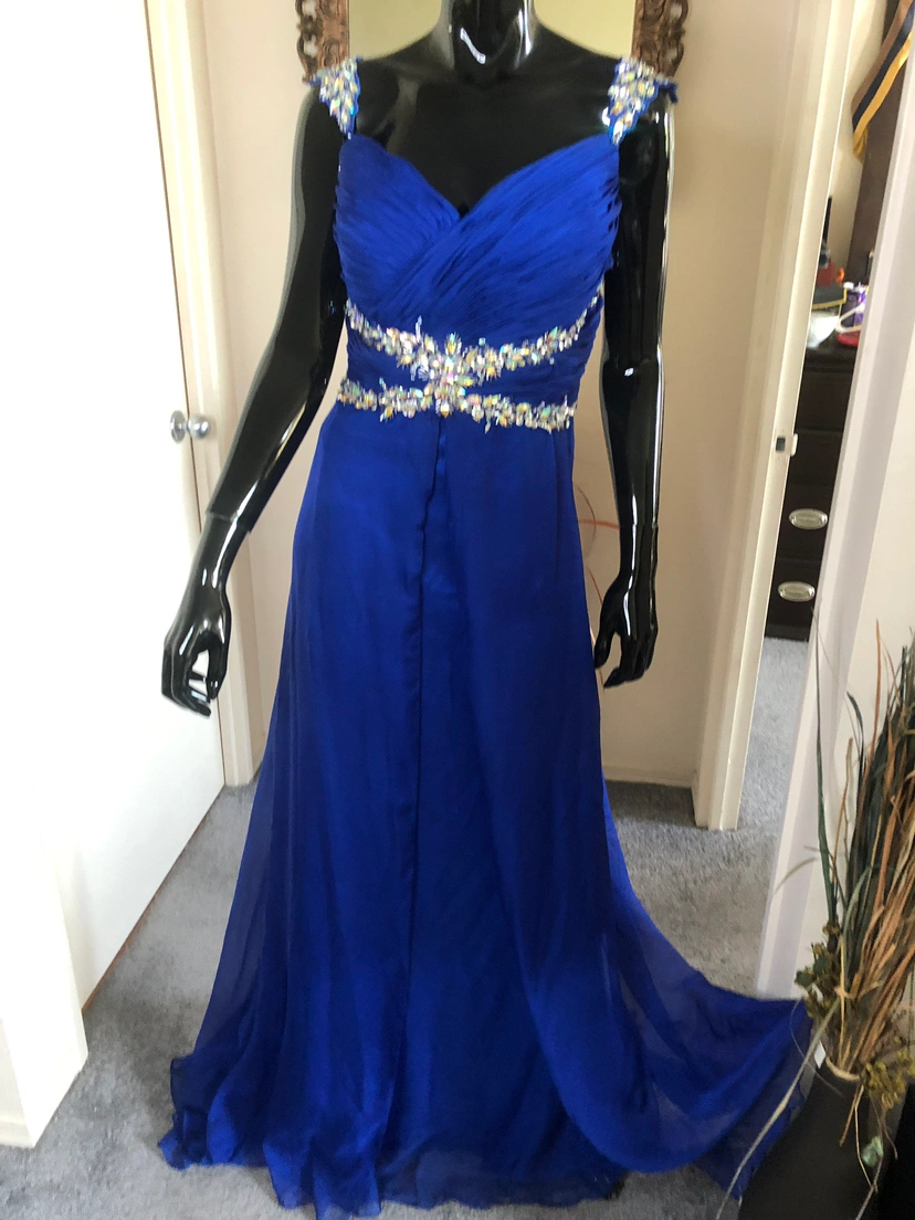 beautiful embellished fit & flare gown only worn once or twice with a mini train. it will need trimming hem as i am 5:7 n wore it with heels. The straps where adjusted but instead of being cut off we just made them attached them lower to the back of the dress for a nice bust fit.
