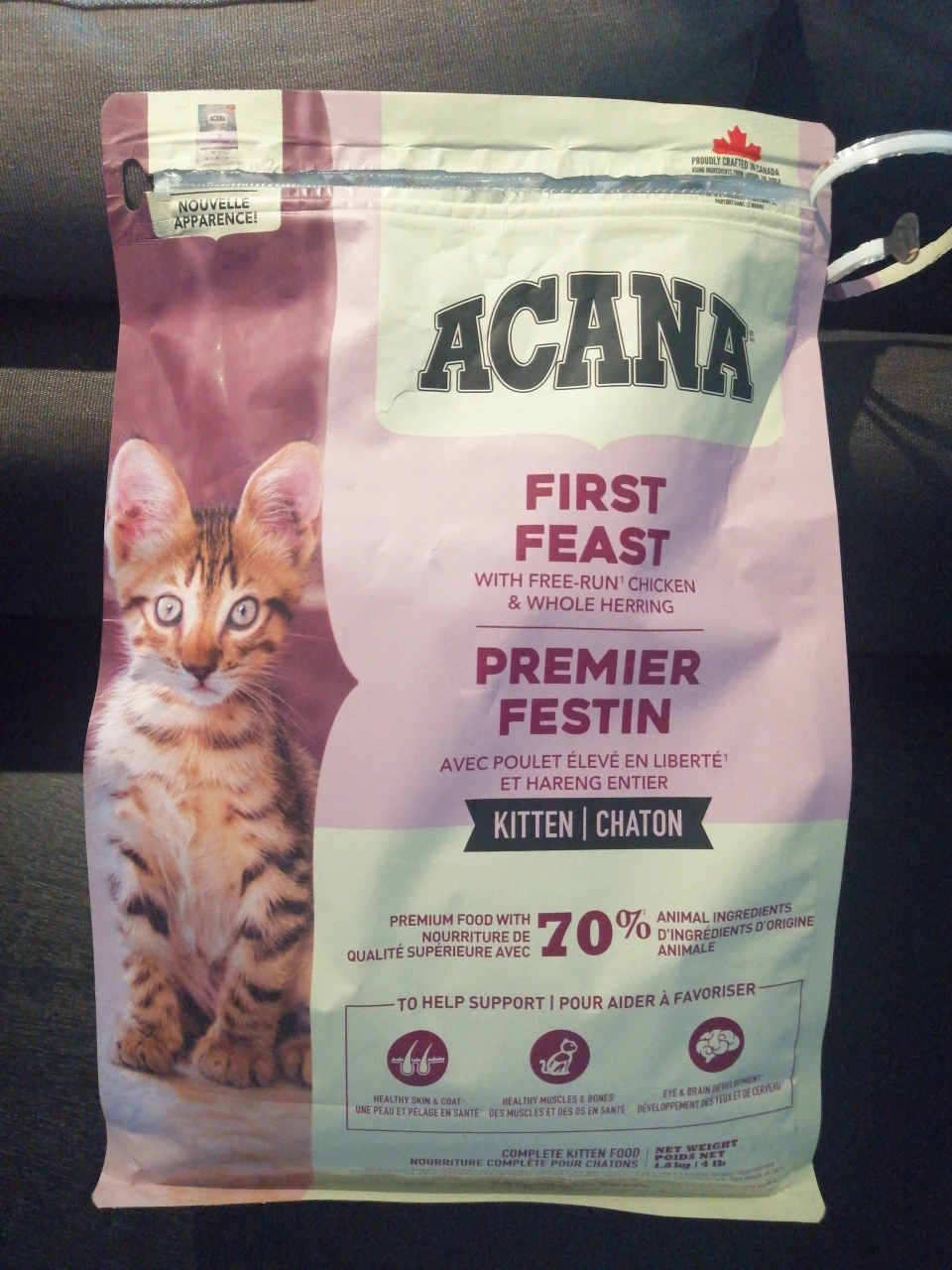 More than half a bag of kitten food.