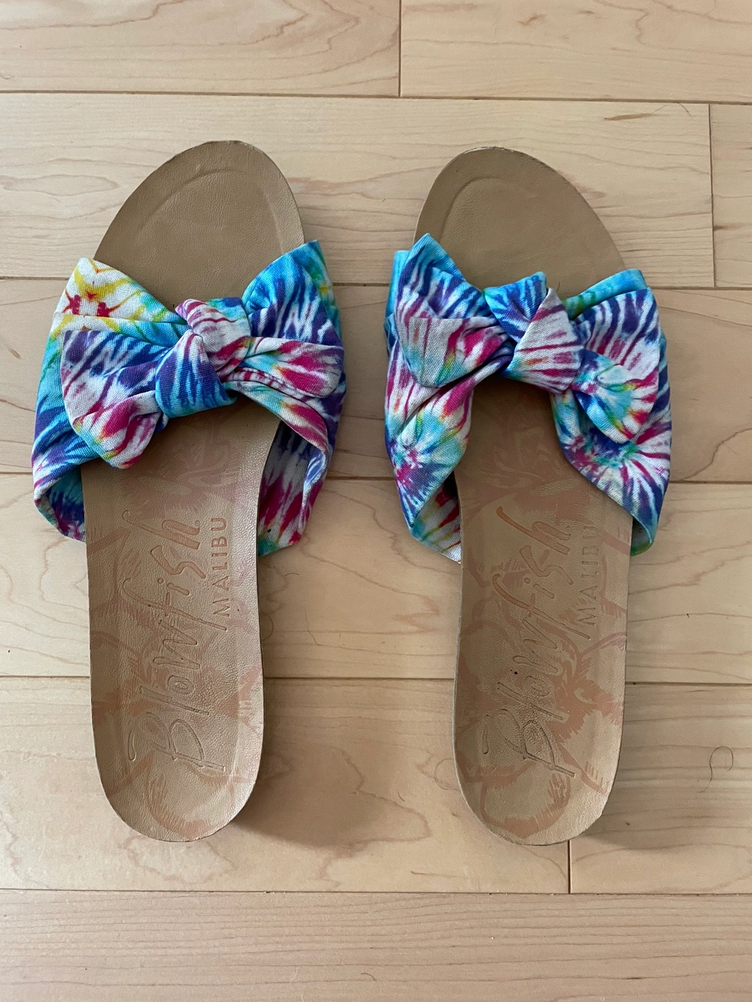 Women’s sandal - lightly used. Fits a 9.5 shoe size. Cork base and colourful tie dyed fabric. These are flat (no heel) and are super comfy. Decluttering my shoe closet.