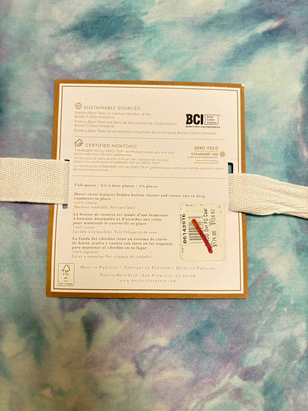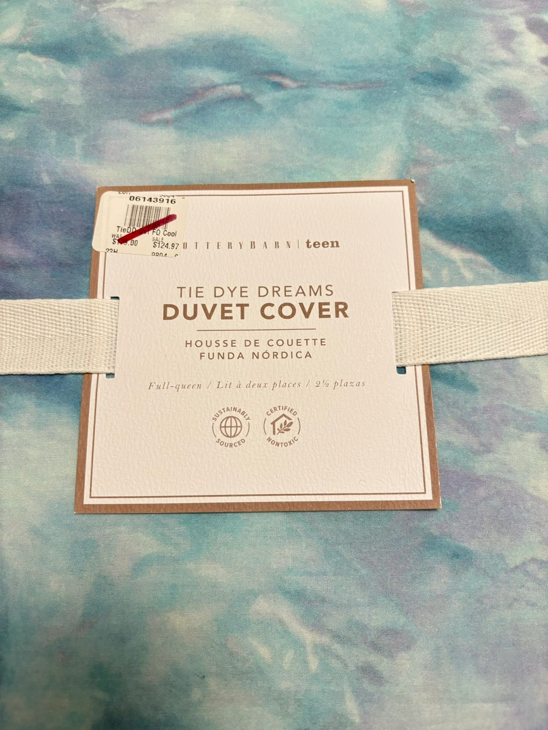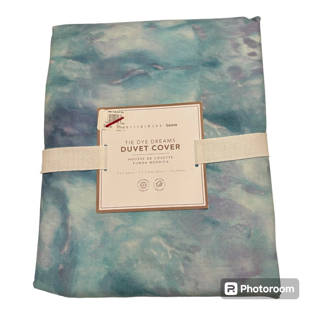 Full Queen size duvet cover with corner ties and hidden button closure. 100% cotton, certified non toxic. Tie dye colour. Brand New unopened. Just changed my mind after purchase.