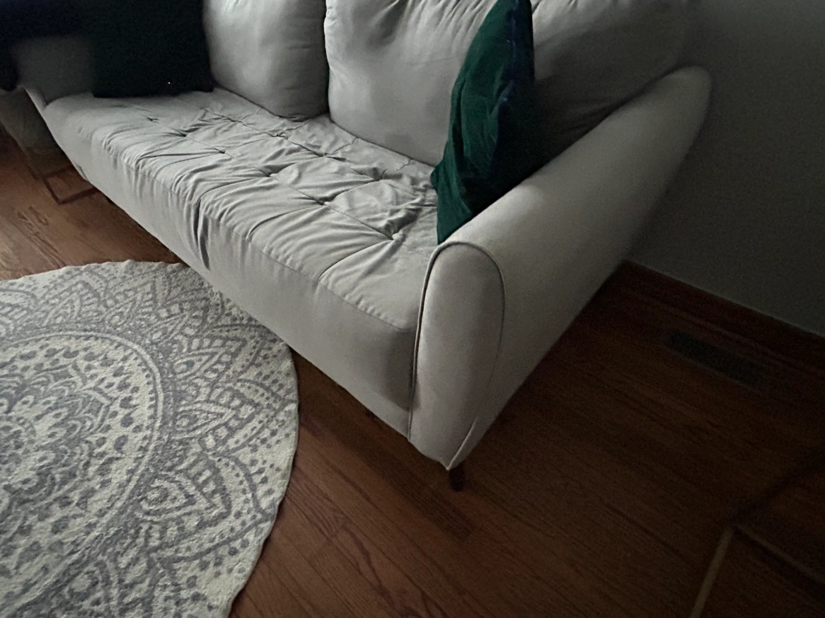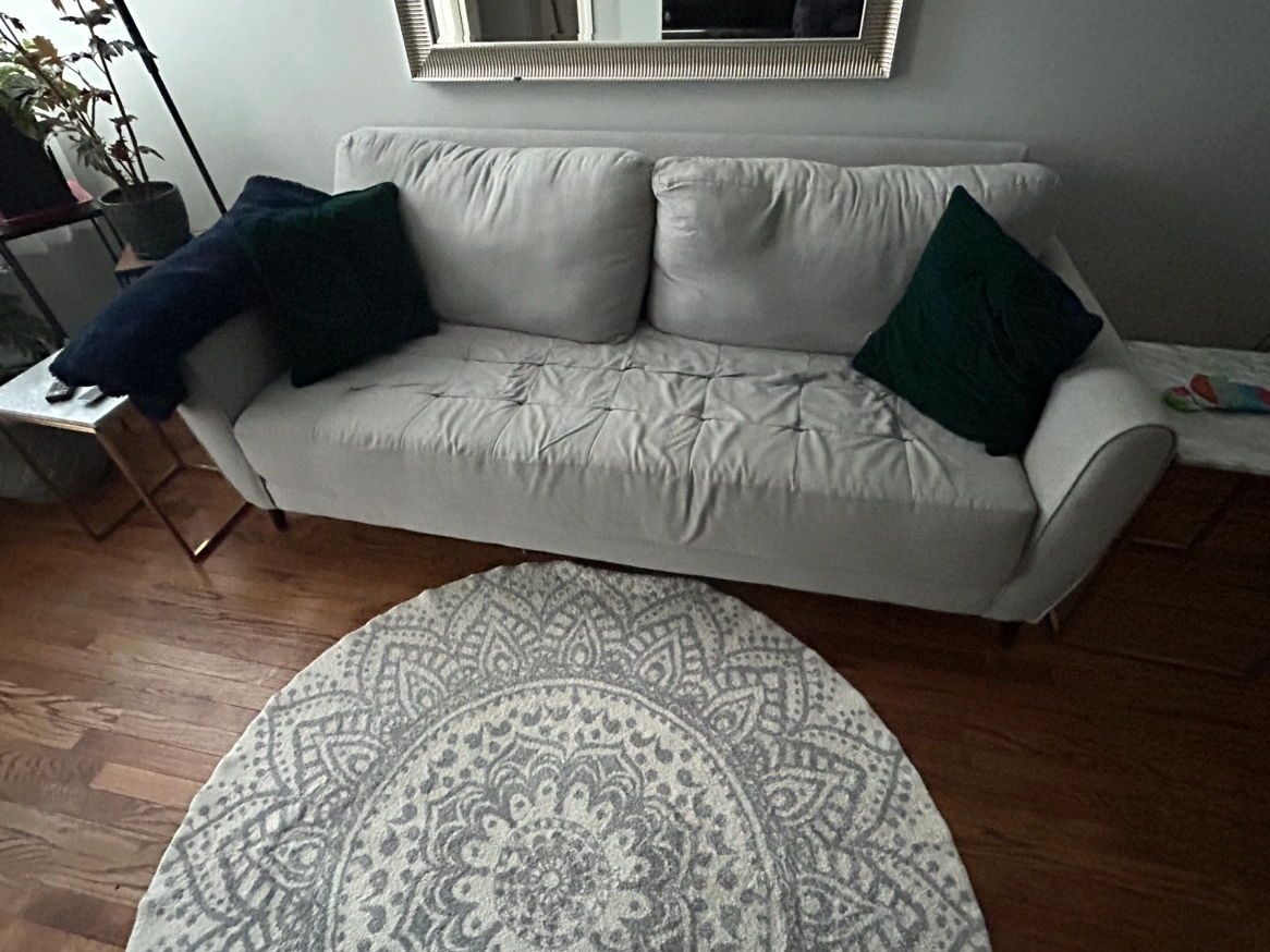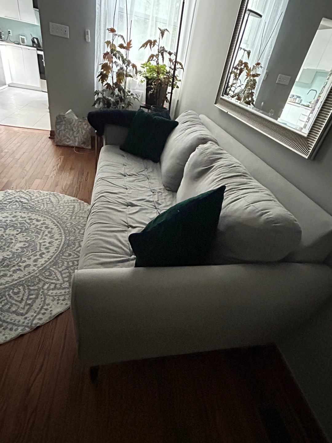 Grey couch selling due to move - good condition - pick up only - has professional scotchguard. We’ll include the green throw cushions also!