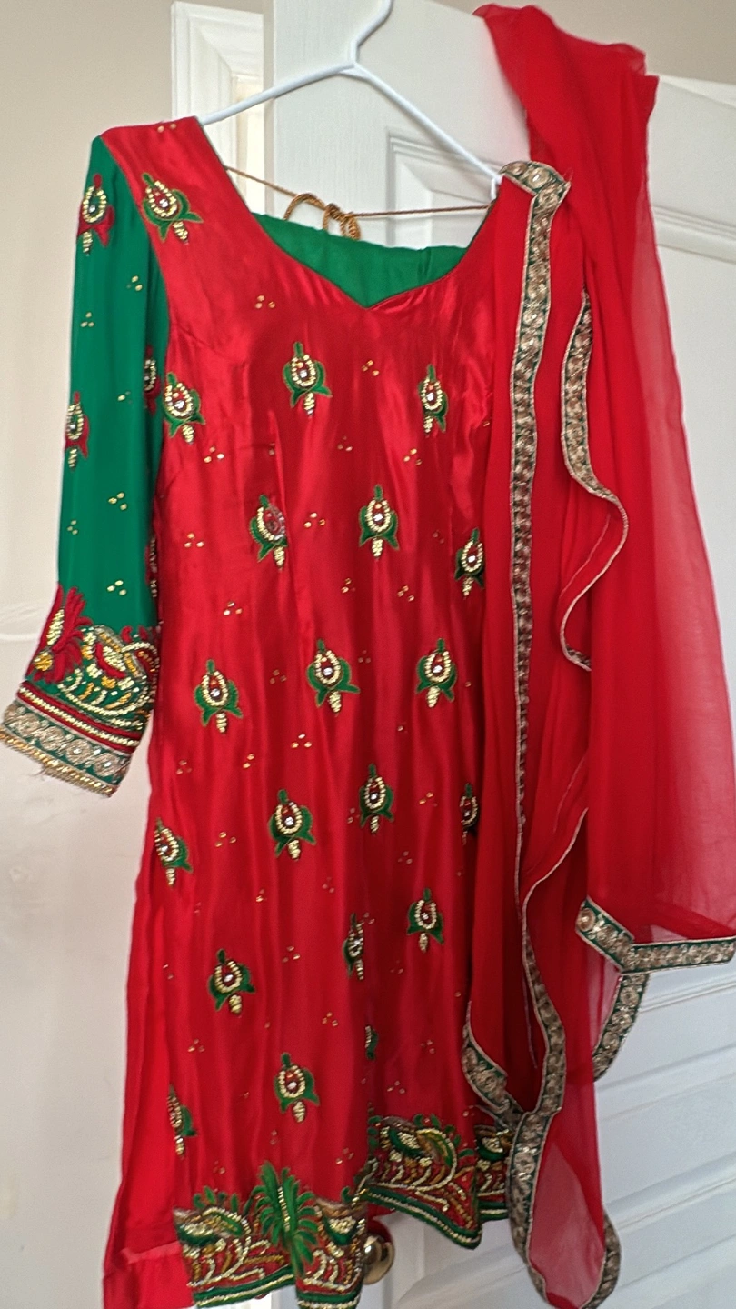 Green and red with rhinestone crystal and thread zari work throughout the top and the salwar is plain green. Duputta stole in red with crystal work along all 4 sides of the duputta. As shown in the pictures!