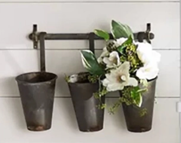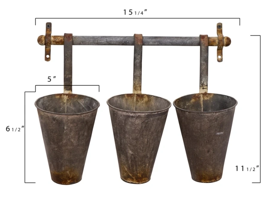 1000+BRAND NEW WITH TAGS Retails for $85.00 with tax on Wayfair 🔗Link for your reference https://www.wayfair.ca/decor-pillows/pdp/gracie-oaks-antiqued-metal-wall-rack-with-3-hanging-cone-pots-c004184338.html Note: Flowers are not included. We’re pretty sure every kitchen has those odds and ends that never seem to have a permanent home. From random pens and pencils to business cards and coupons, there’s always something that could use a permanent spot to make finding it a little easier! That’s where this galvanized, rustic metal wall rack comes in. With three small buckets for storage, it’s a great item to hang on the wall near a desk with tools for taking notes, as a place to tuck away recipes, or simply dress it up with some silk flowers for some year round beauty. Its rustic charm will make it a favorite piece of décor in your home. Perfect rustic home decor for a modern farmhouse touch to your home. Also sold on Antique Farmhouse website.