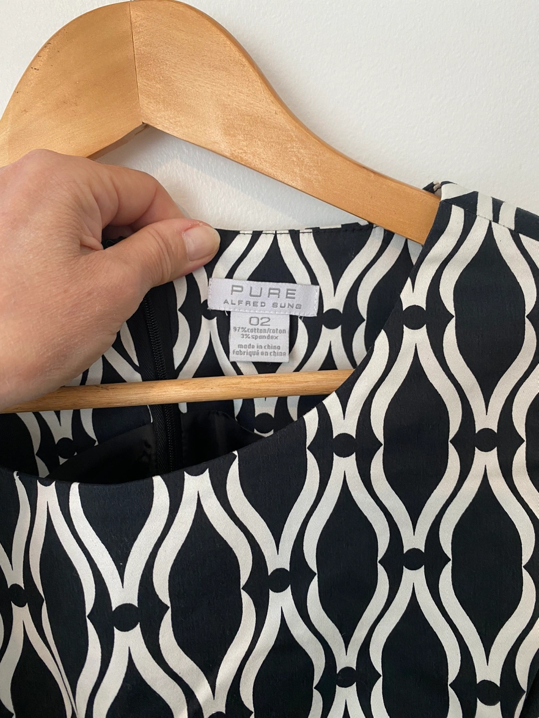 Alfred Sung Dress: • PURE line of the Alfred Sung brand • Lovely fitted dress • Size 02 • Black and white in colour • Hand wash cold with like colours • Hang to dry • Light iron if needed • I have a bathroom to try the dress on if needed. Pick up ONLY in East End Toronto (Gerrard St East and Jones Ave area)