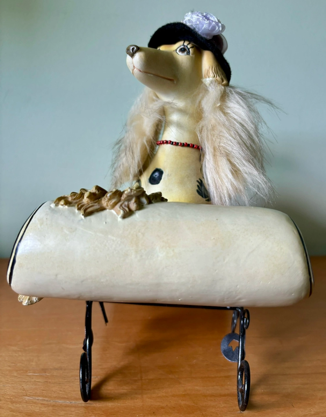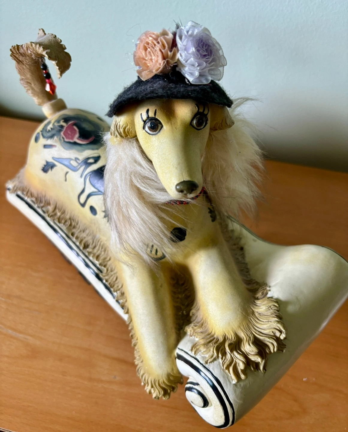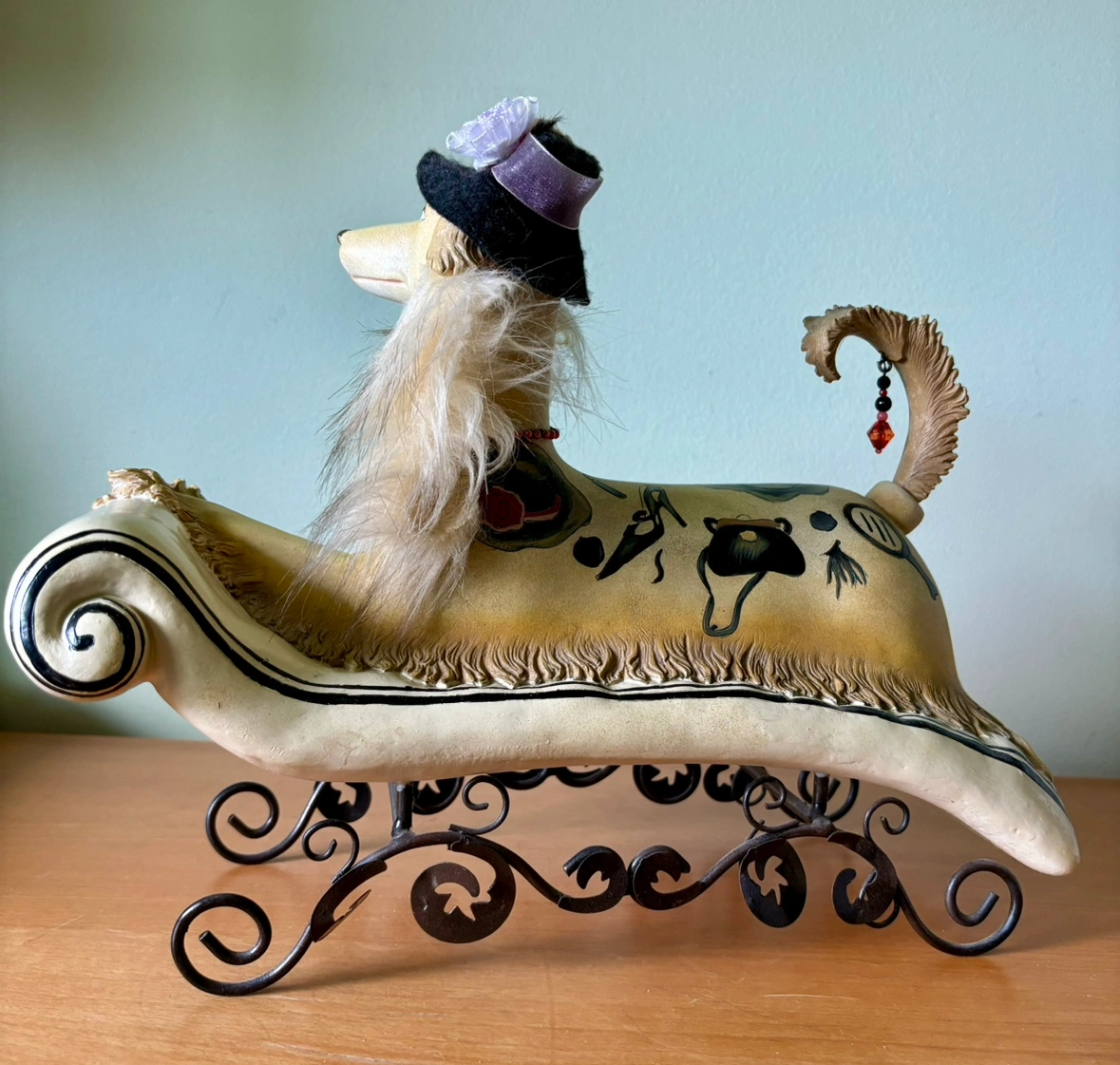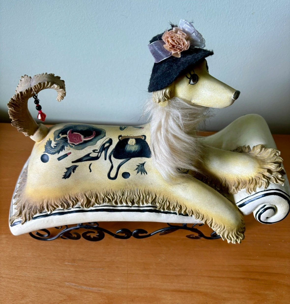 A rare find! The Vintage afghan hound on chaise lounge is a solid art piece and in mint condition, I believe metal framed, 13” L, 5”D.