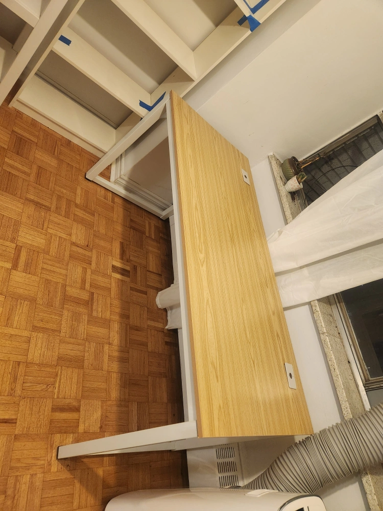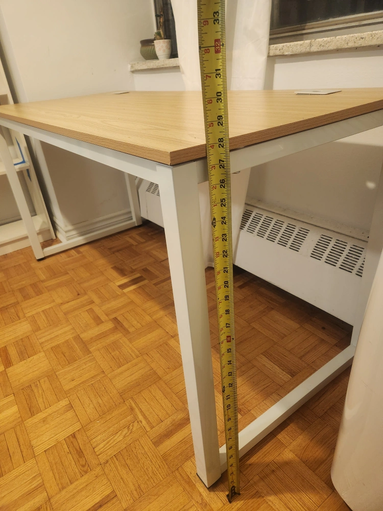 Sturdy aluminum and wood veneer desk. Two cable holes. Comes with Allen key for disassembly and assembly.
