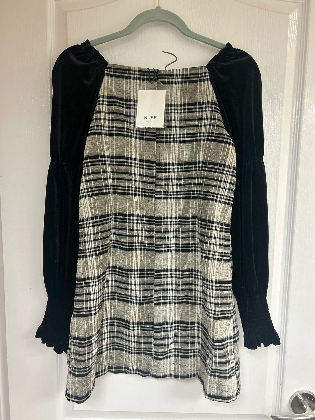 Perfect for a chic, vintage-inspired look. The dress features a plaid pattern with elegant velvet sleeves.