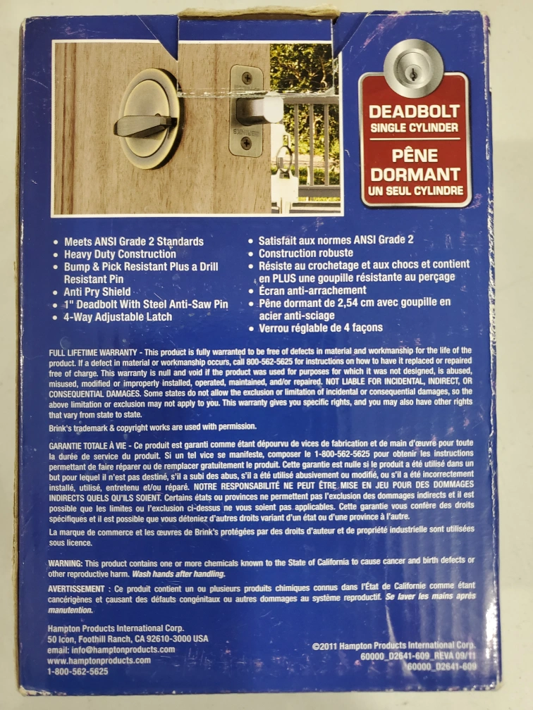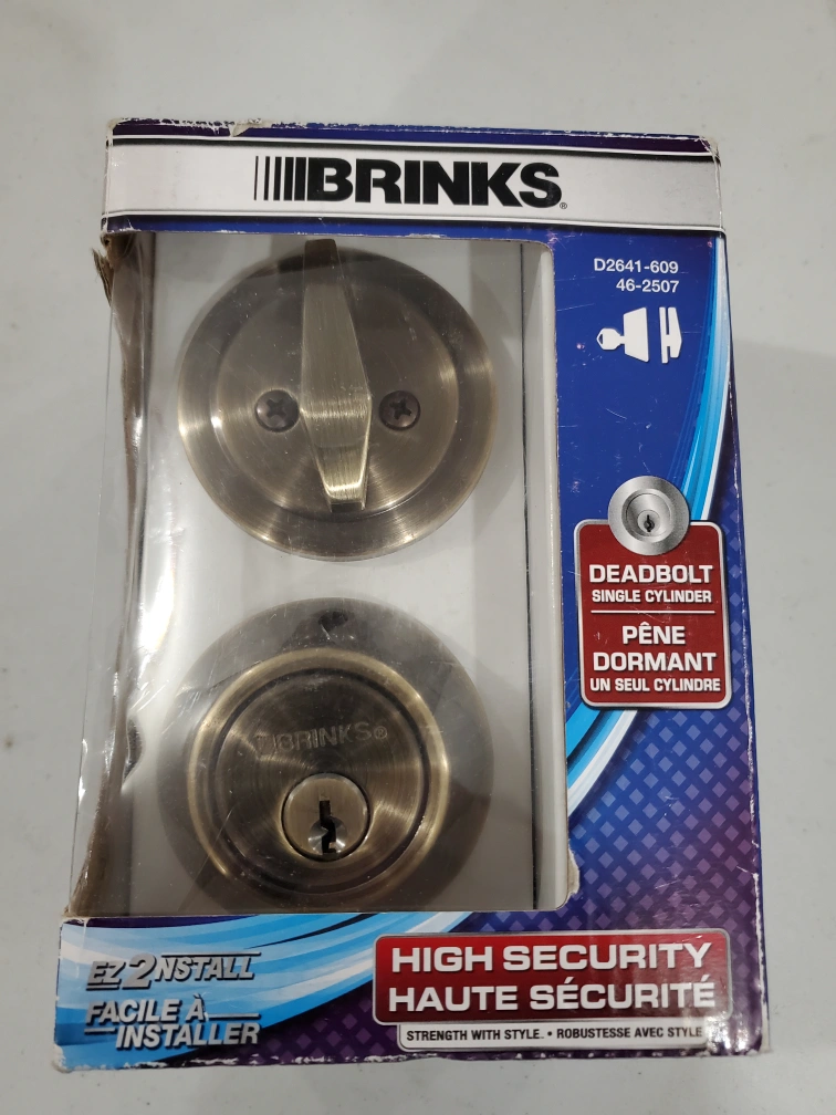 Brinks single- cylinder deadbolt lock with keyed entry.