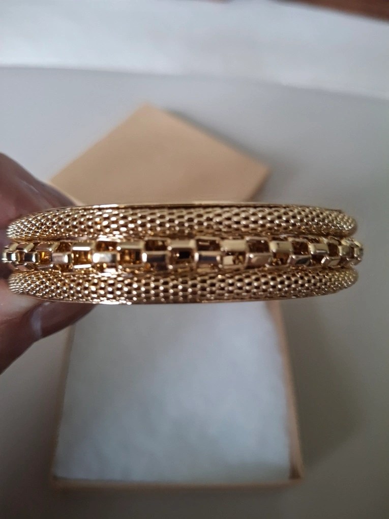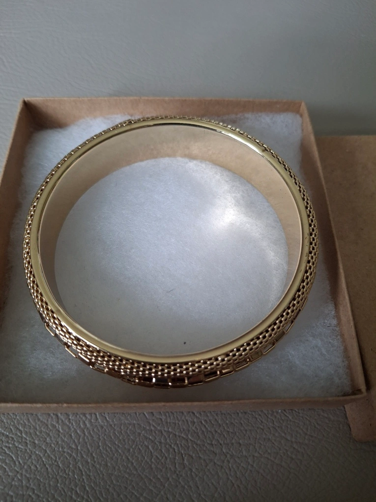 Shiny and detailed gold bangle (unmarked/costume jewellery). Perfect condition, never worn. Outer measurement is 3” and inner measurement is 2.5”.