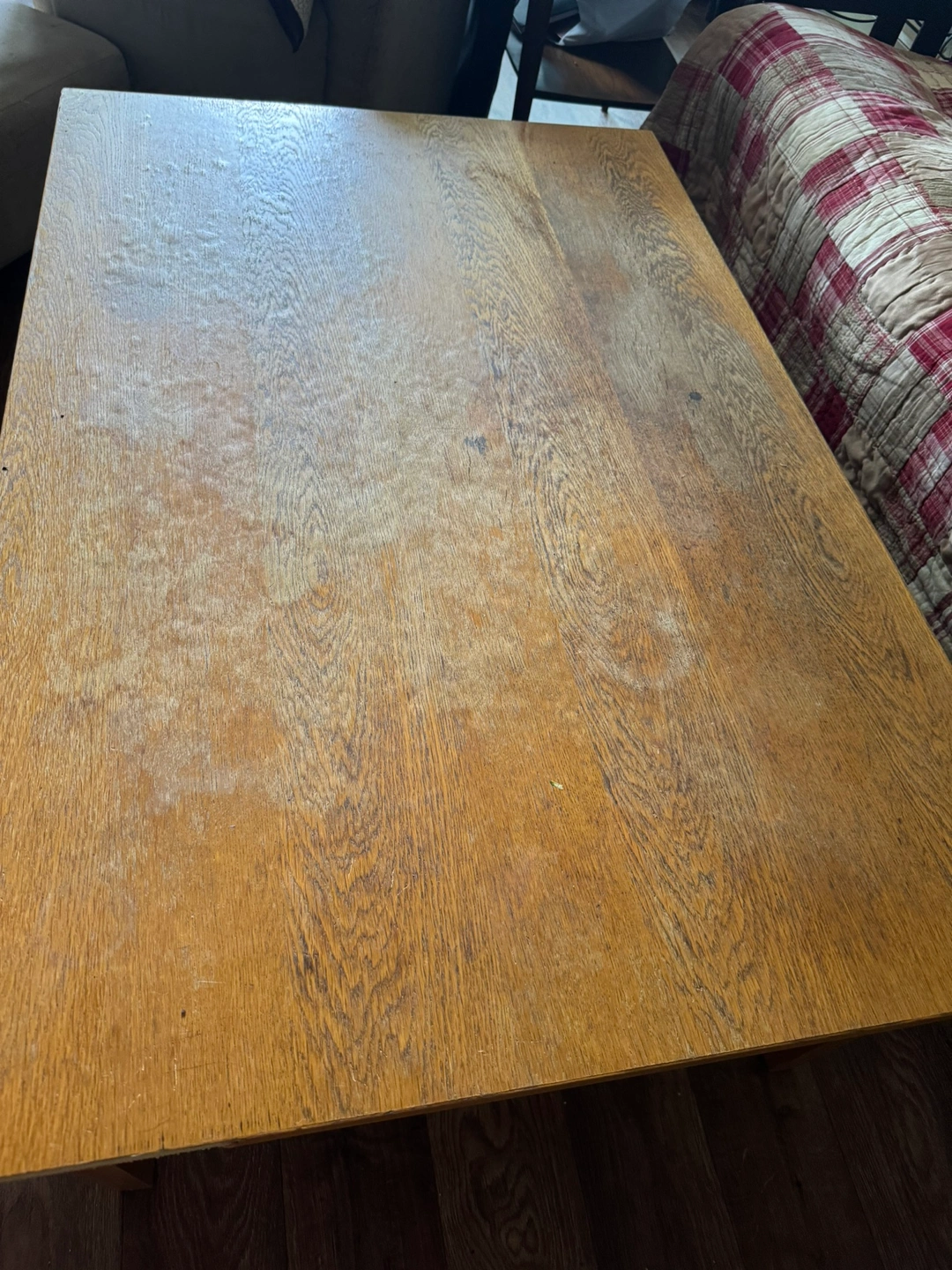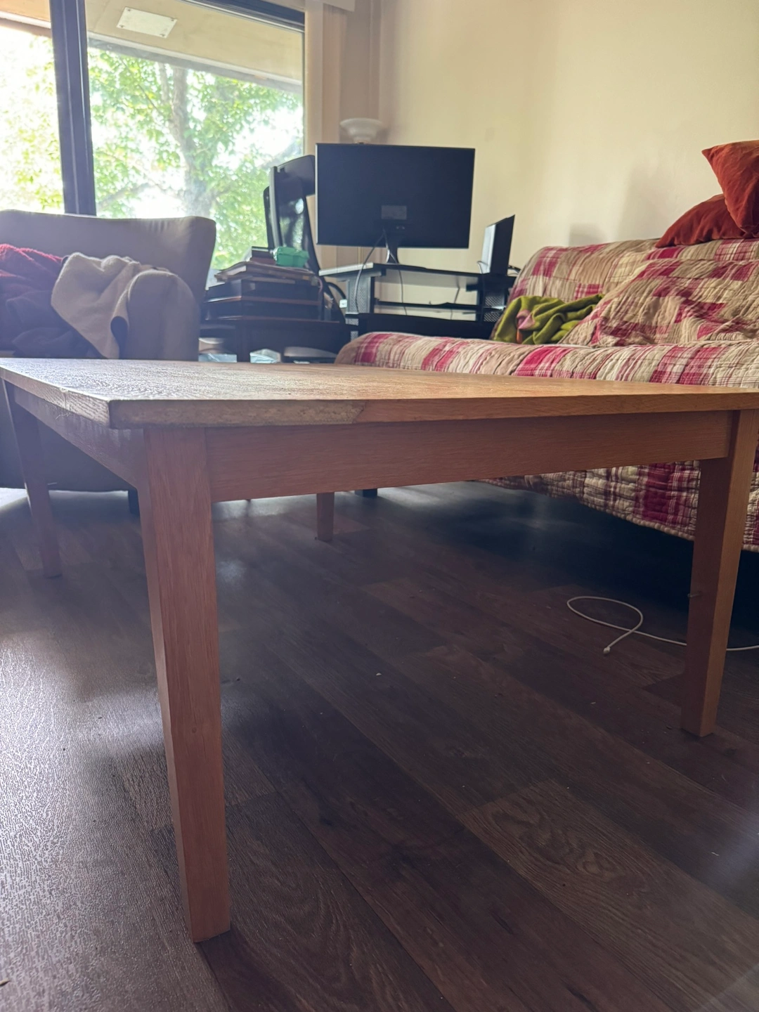 Selling a sturdy wooden coffee table in good condition. The table has a rustic charm and shows some signs of wear, which adds to its character. It can be a perfect project piece for those who enjoy refinishing furniture or can be used as is for a vintage look.