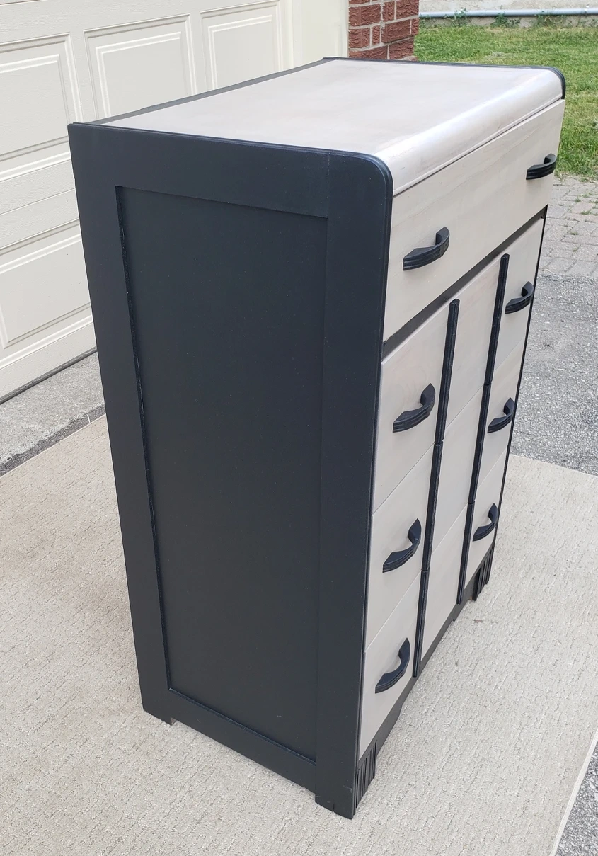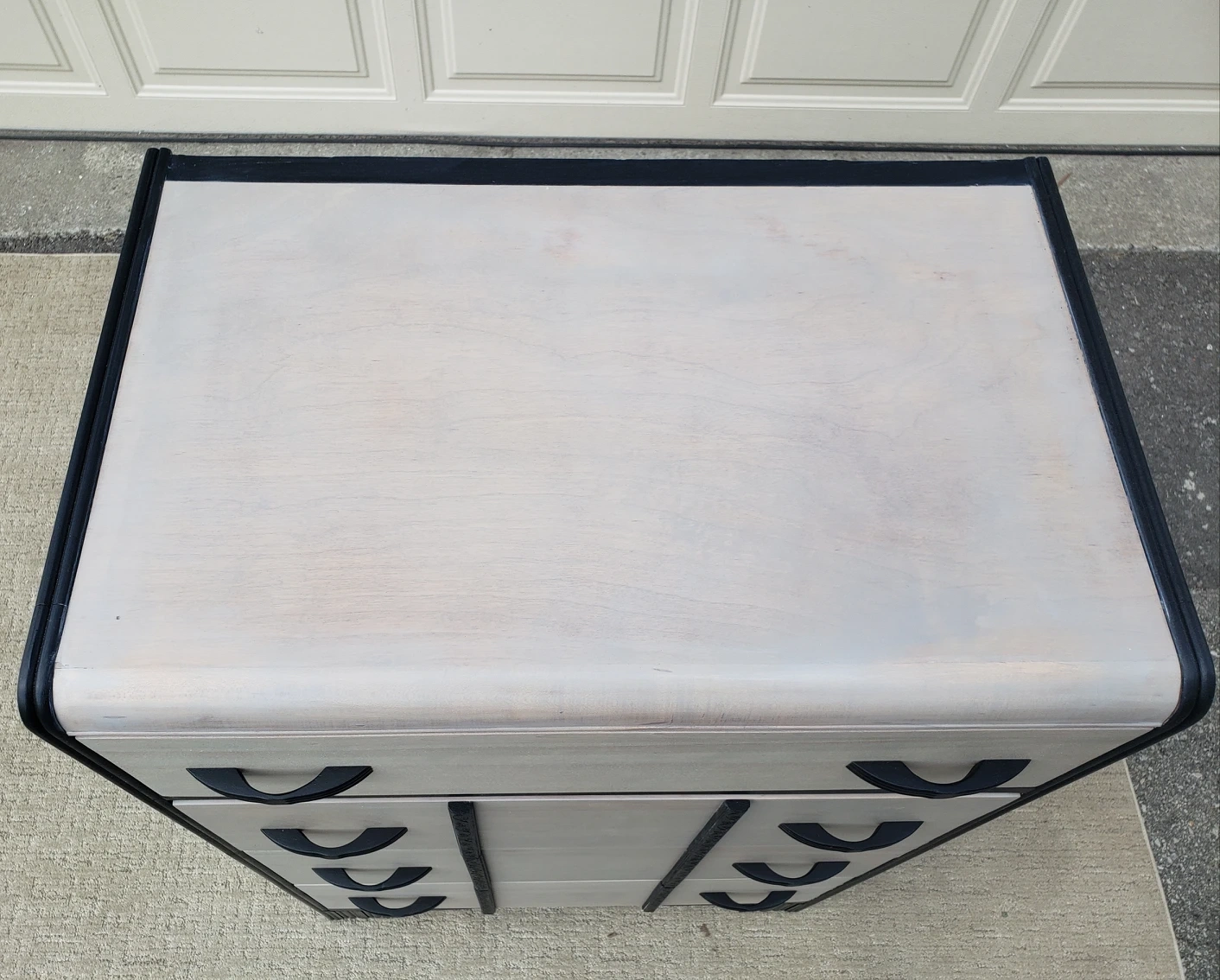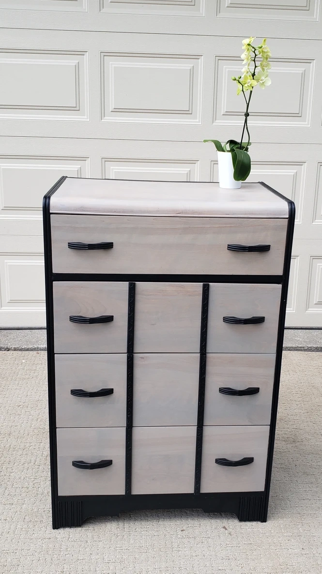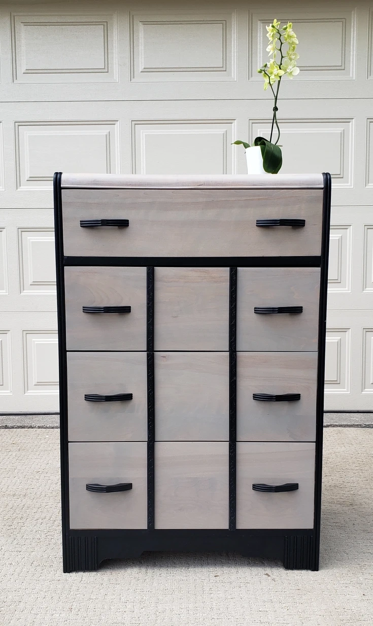 Stunning refinished waterfall dresser! Original veneer on the top was salvaged from this previous tired, sad vintage piece.