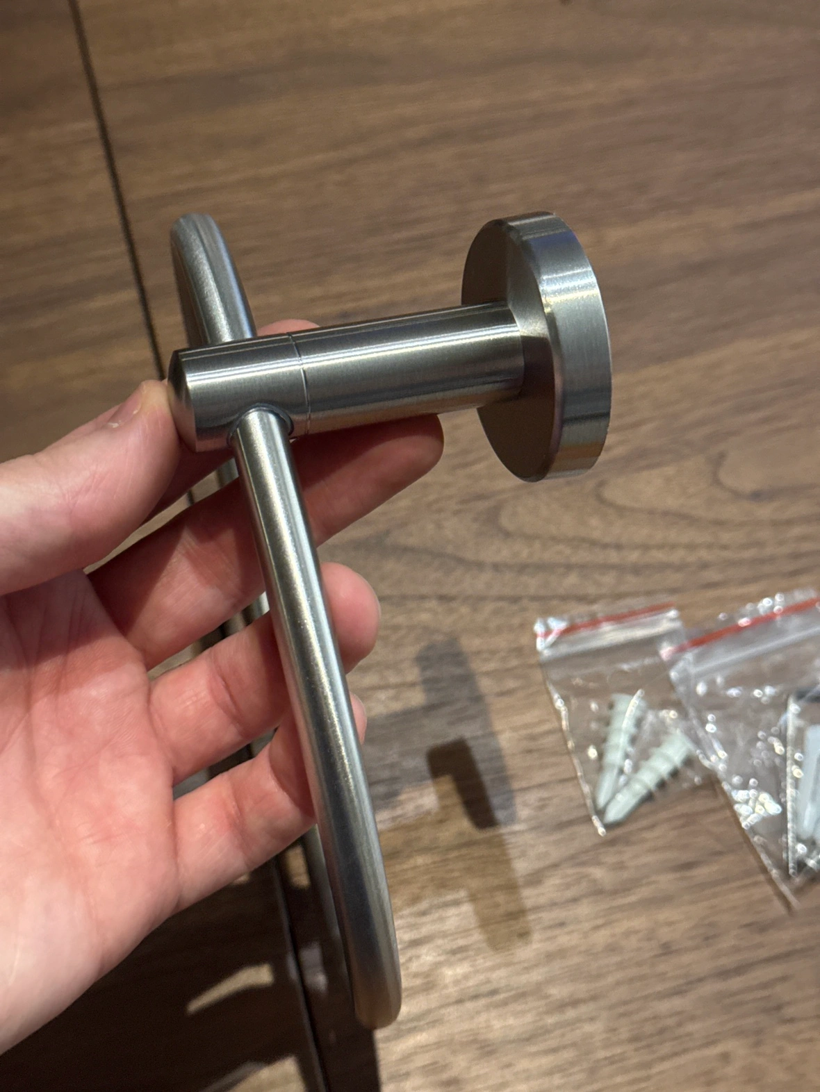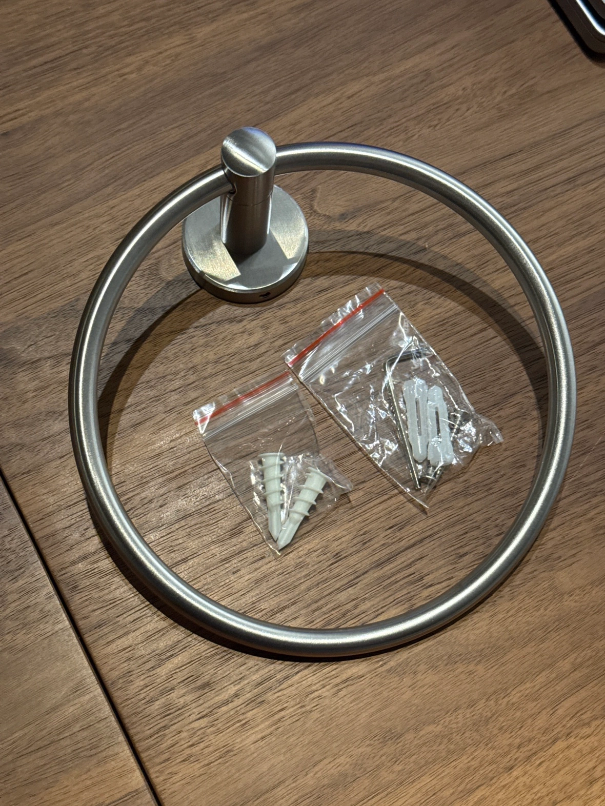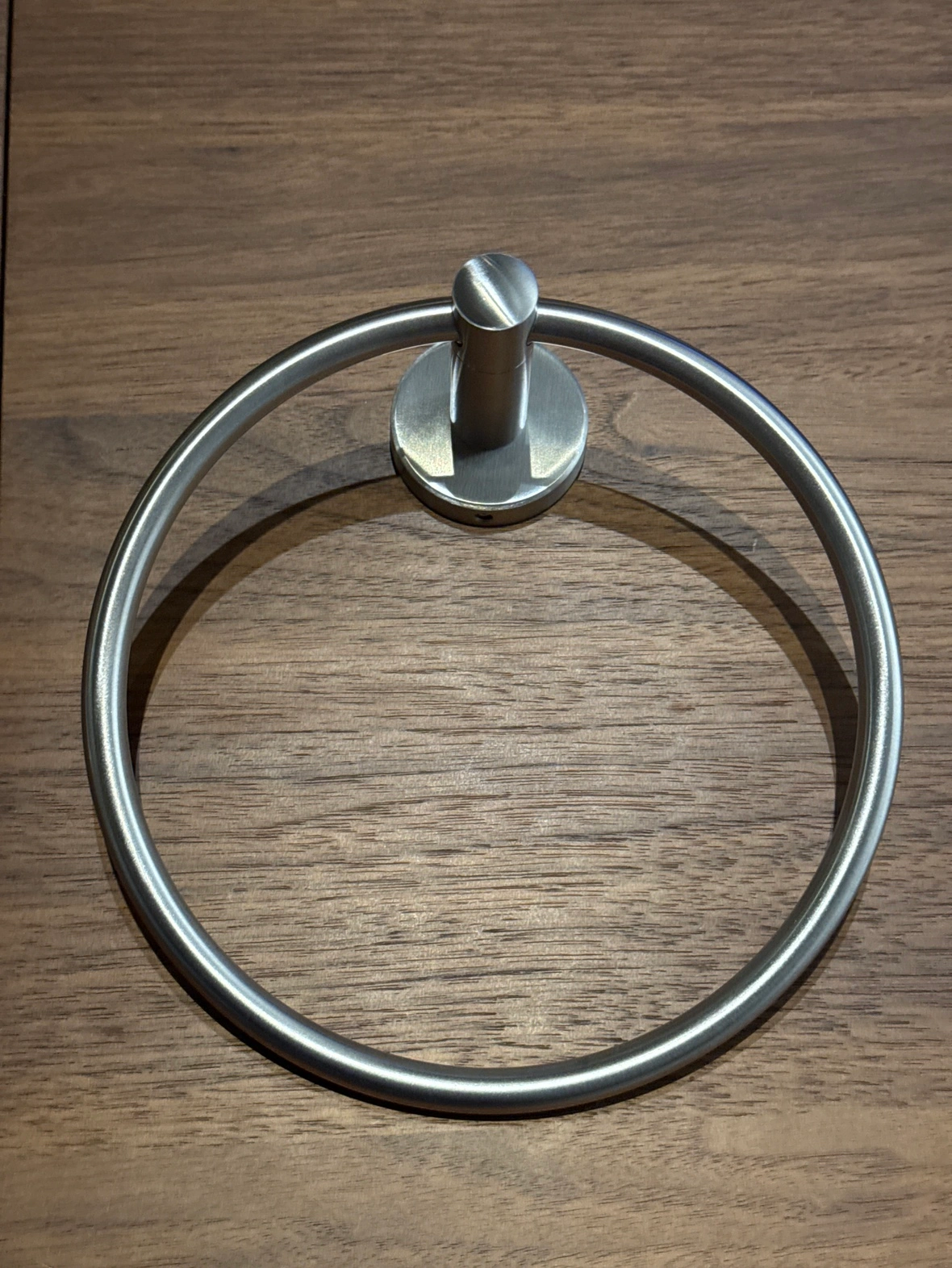 Brand new brushed stainless steel bathroom hand towel ring. Comes with two different types of wall anchors.