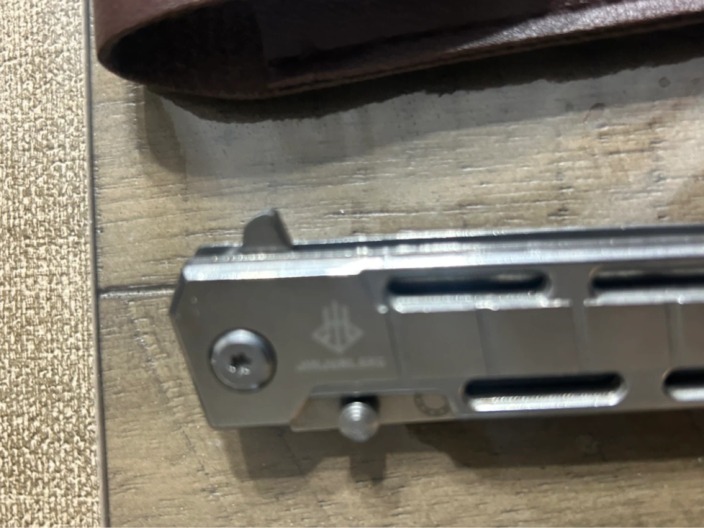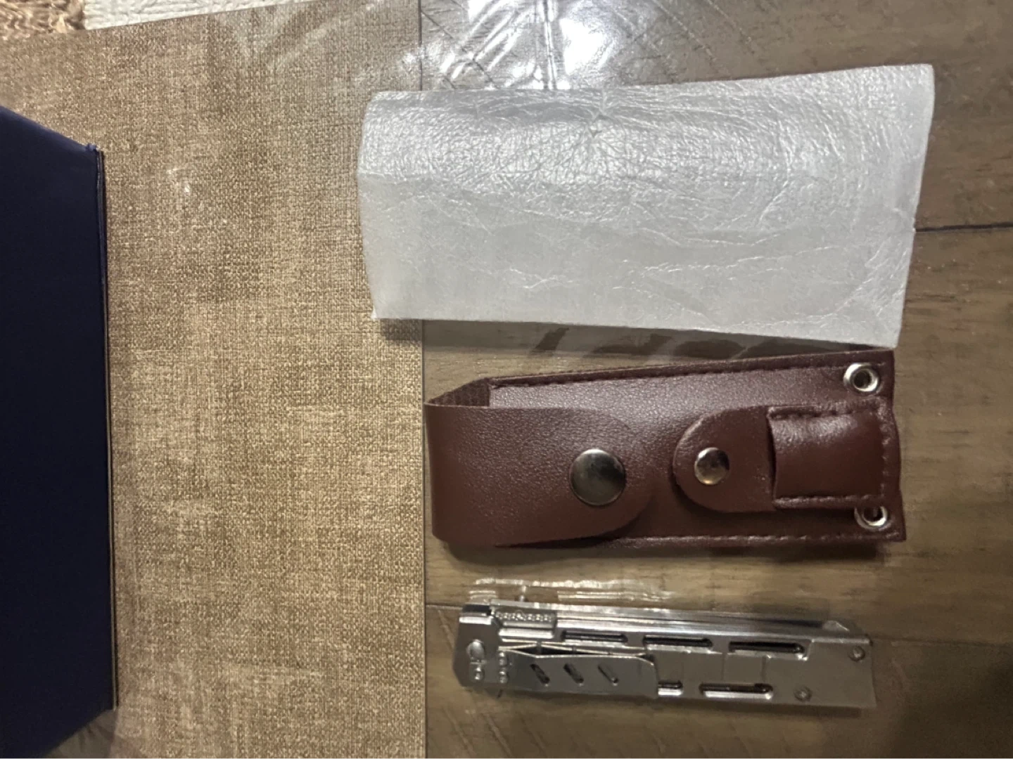 Silver butterfly knife trainer made of metal. It comes with a brown leather sheath and original packaging. Perfect for practicing flips and tricks safely!