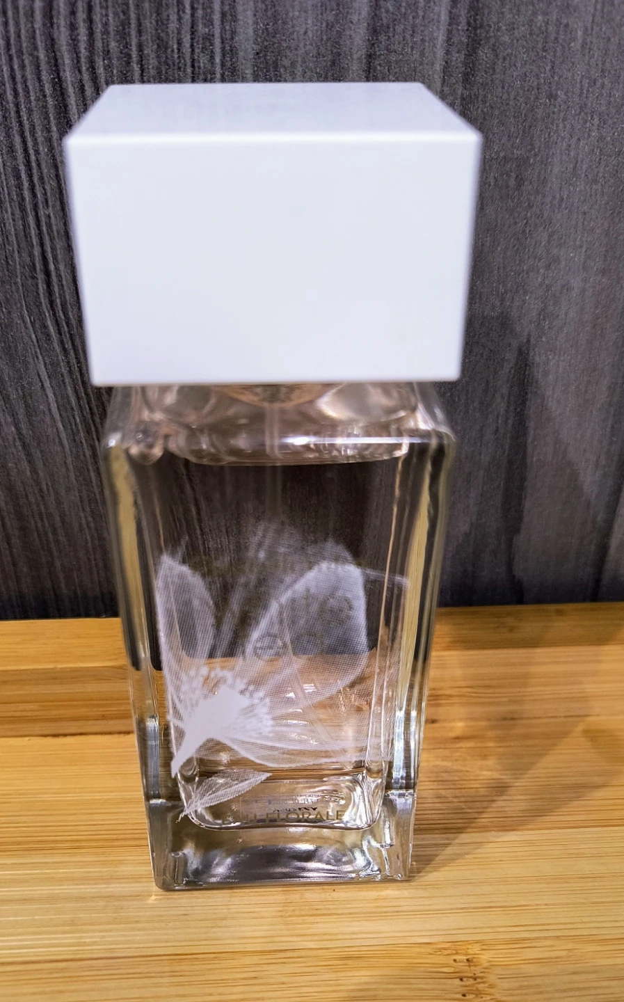 This is a Elizabeth Arden White Tea Eau Florale Eau de Toilette 50ml perfume. It comes in a clear glass bottle with a white cap. The bottle has a delicate feather design etched on the front.