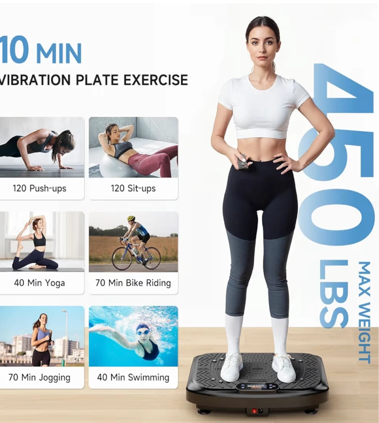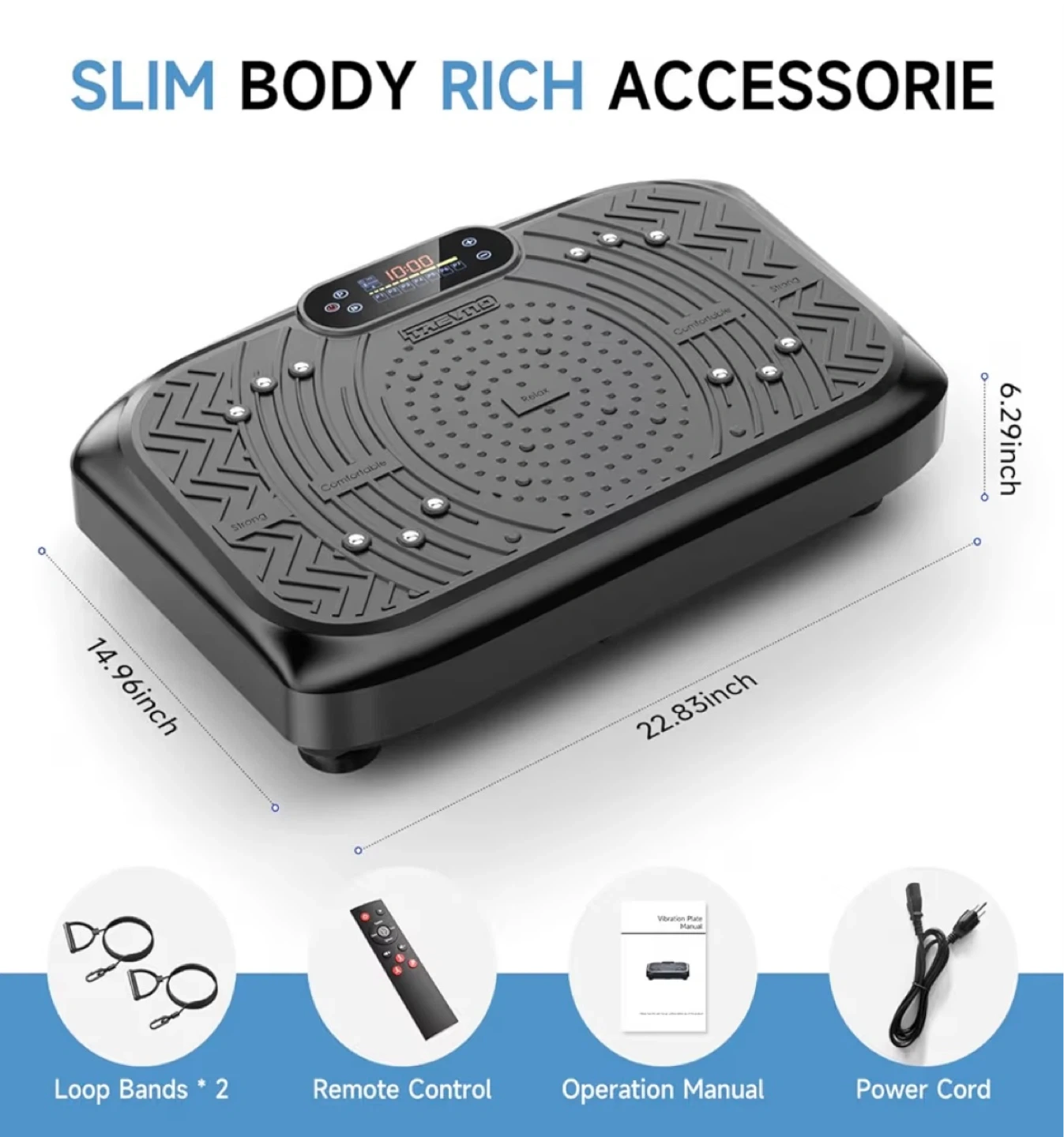 T This Taejro vibration plate exercise machine offers adjustable speed from 1 to 199. It features 7 pre-set programs, Bluetooth speakers, and an LED touch display. A remote control is also included for convenience.