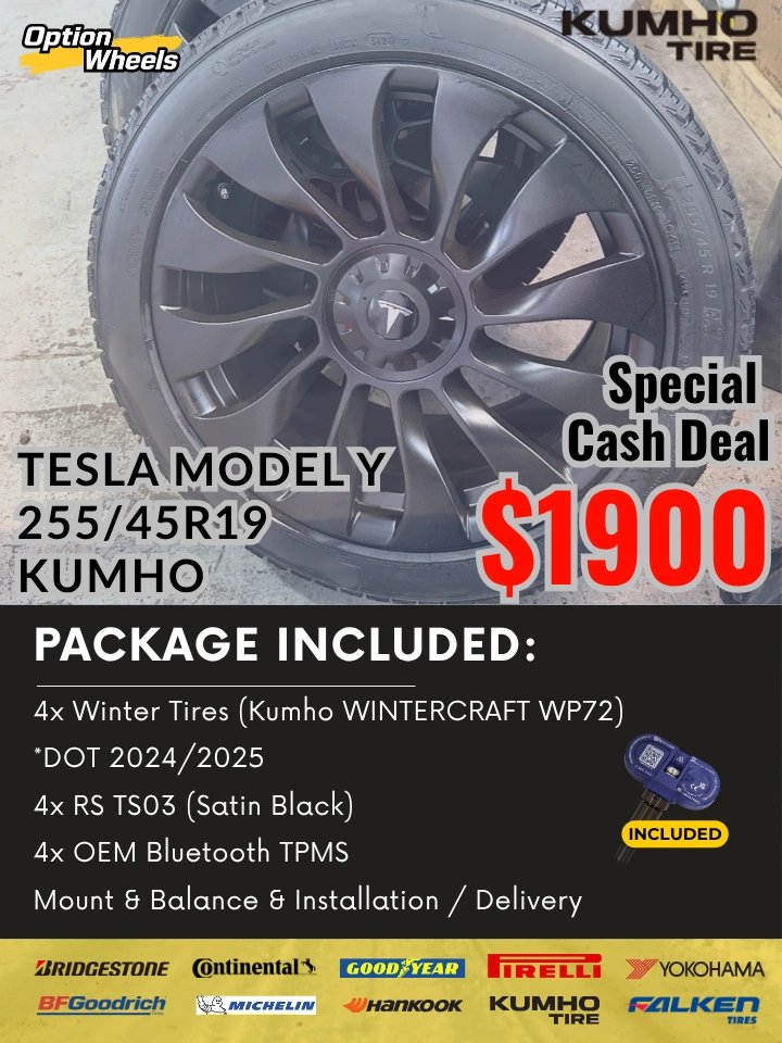 Weโve got the ultimate setup for your KUMHO Tesla Model Y in super good cash deal . ๐ฐ Cash Price: $1900 โ๏ธ 4x Winter Tires (Kumho Wintercraft WP72) โ๏ธ 4x RS TS03 Wheels (Satin Black) โ๏ธ 4x OEM Bluetooth TPMS โ๏ธ Mount & Balance โ๏ธ Installation OR Delivery ๐ Option Wheels โ Oakville ๐ฒ DM us @optionwheels_ now~