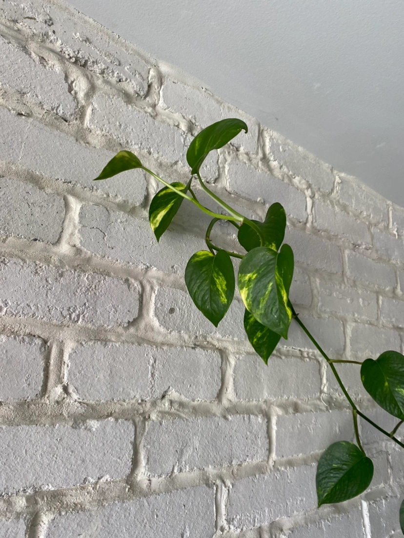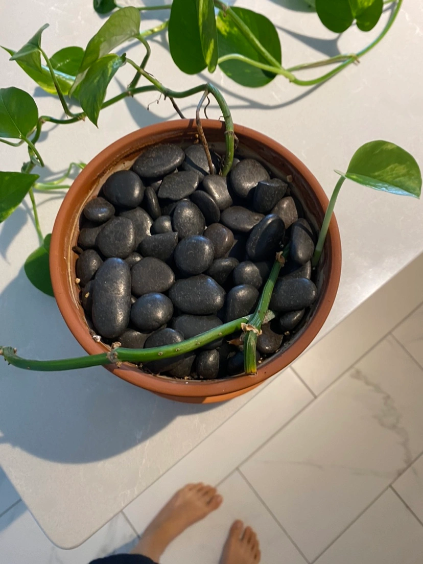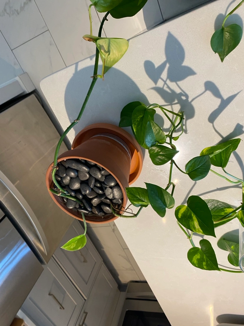 Beautiful healthy pothos plant, the longest branch is about 6feet long. In terracotta pot with saucer included and washed black riverstones on top. Has another 2 stems growing! A few yellowed leaves from lack of light. Might be a golden pothos from the variation in the new growth, but not sure!