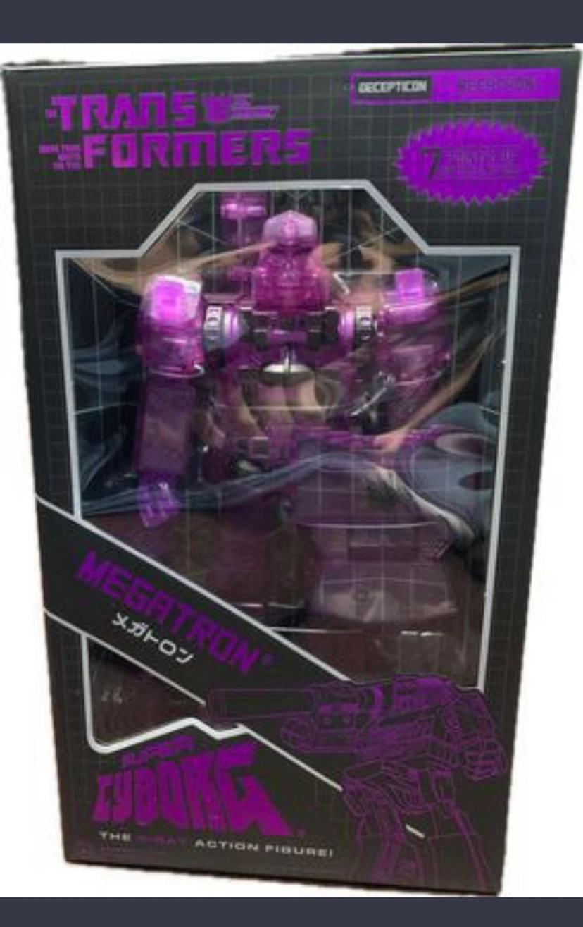 The Transformers Super Cyborg Megatron continues his villainous campaign of peace through tyranny at New York Comic Con 2019! The evil leader of the Decepticons is a Generation One Cartoon-Accurate 12" poseable action figure with fusion cannon and removable chest plate, showcasing his robotic innards. This X-Ray edition Super Cyborg Megatron is cast in clear purple plastic with painted inner torso, and packaged in a deluxe window box.
