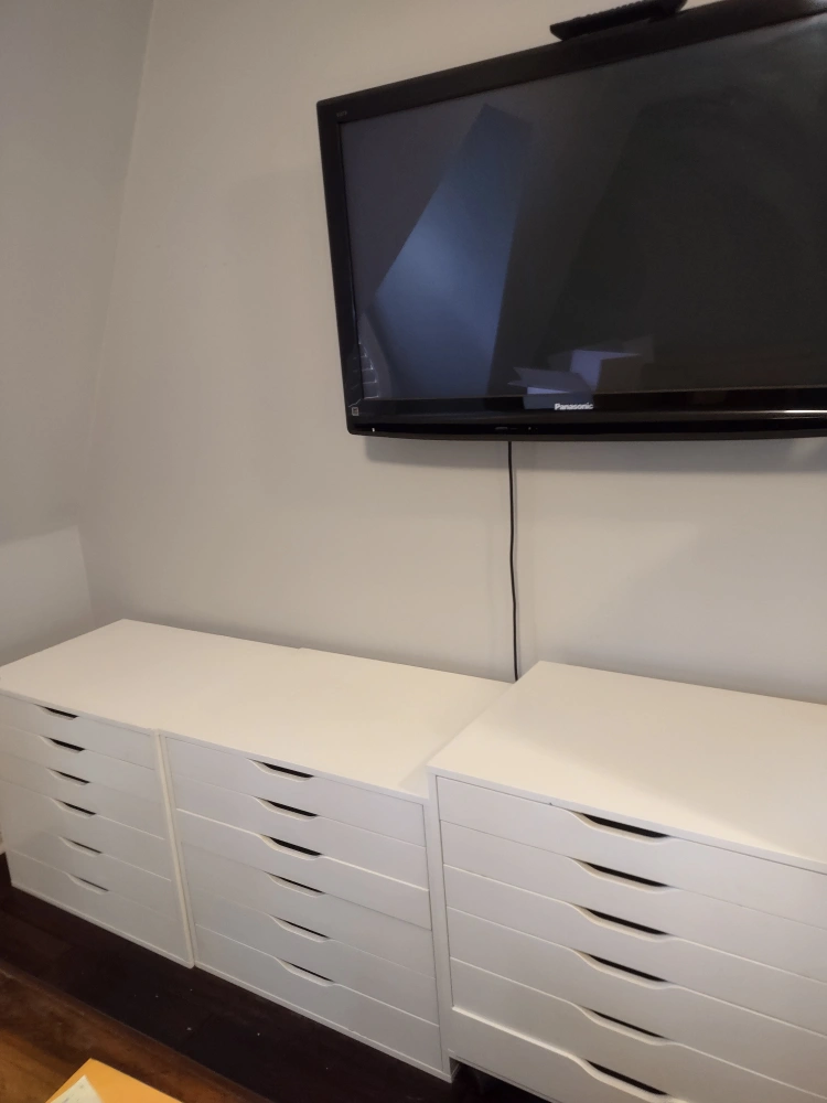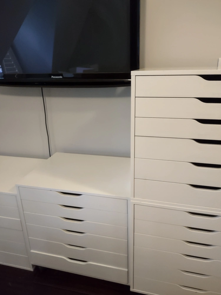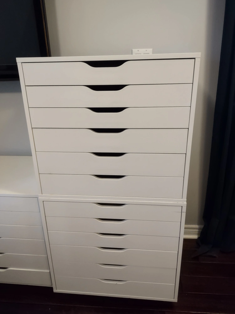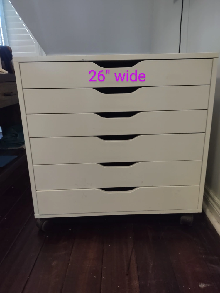 used for clothing - skinny drawers great for underwear, bras, socks and the bottom 3 are deeper. This is so cheap because tone of the wheels is missing. I put a dog ball in its place to keep it stable.