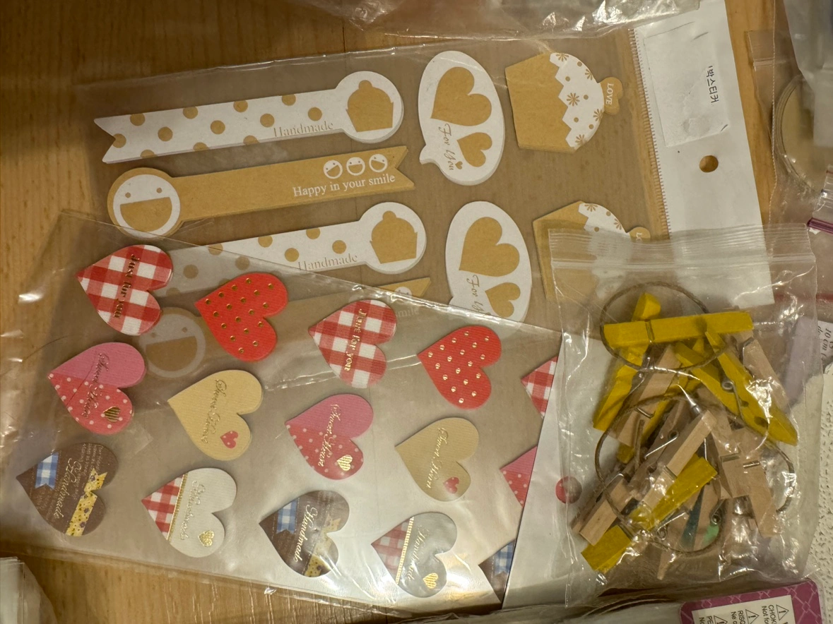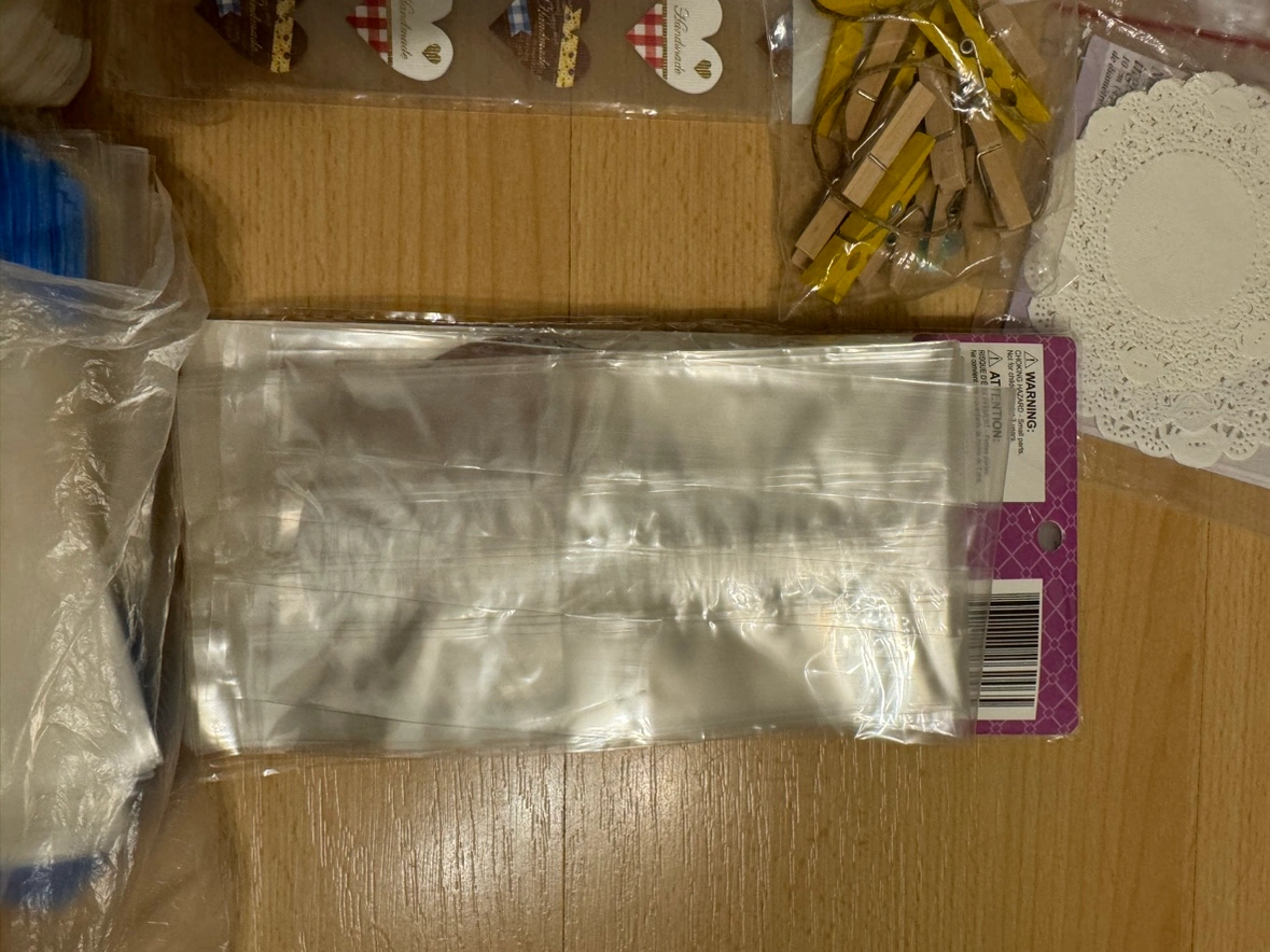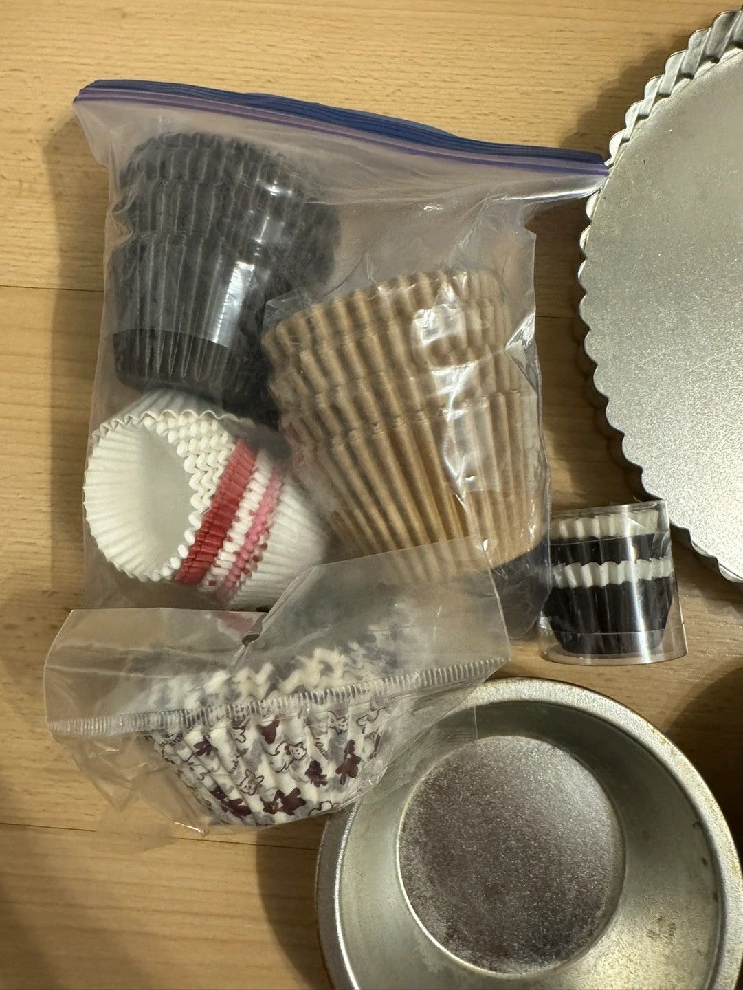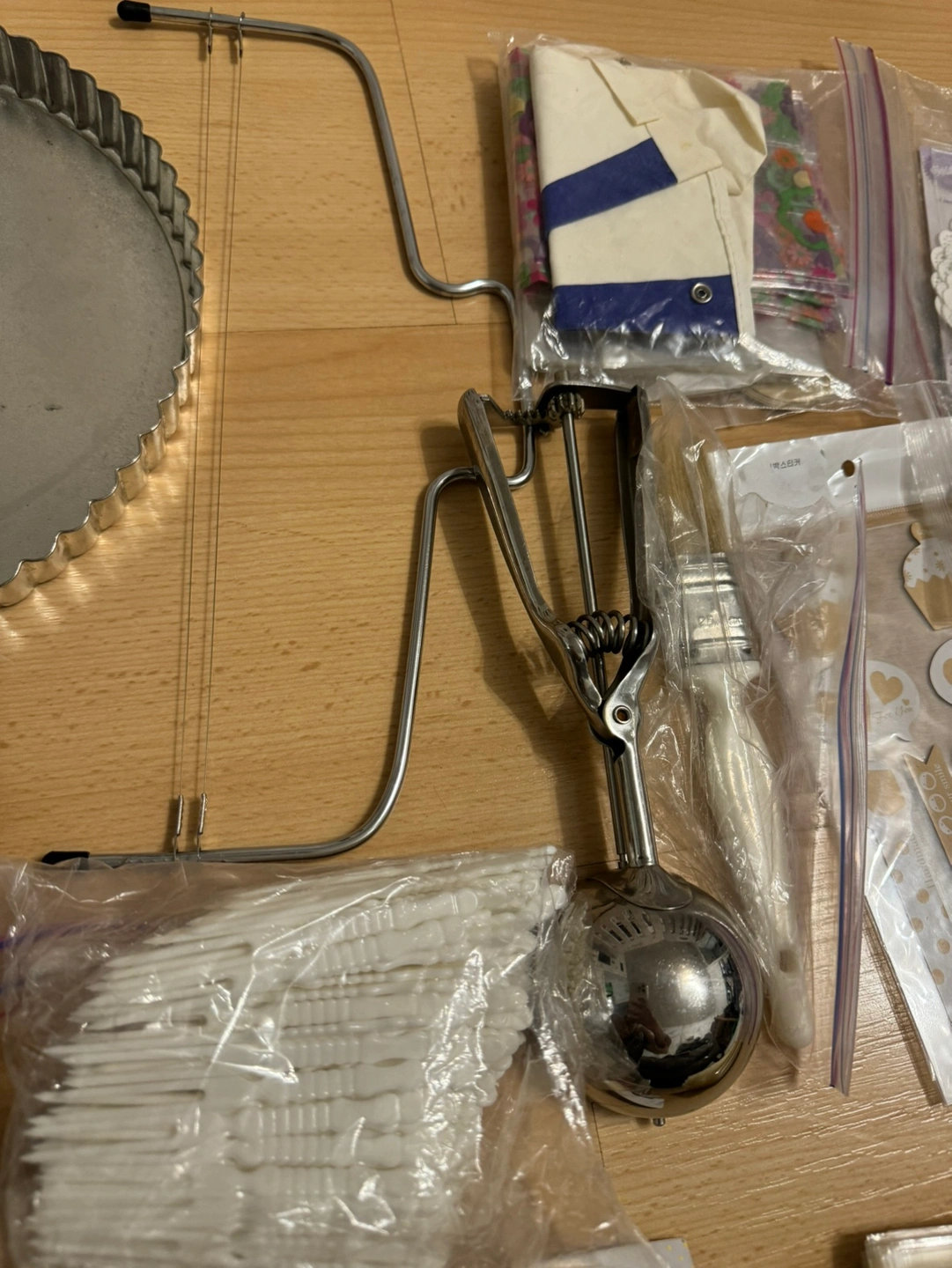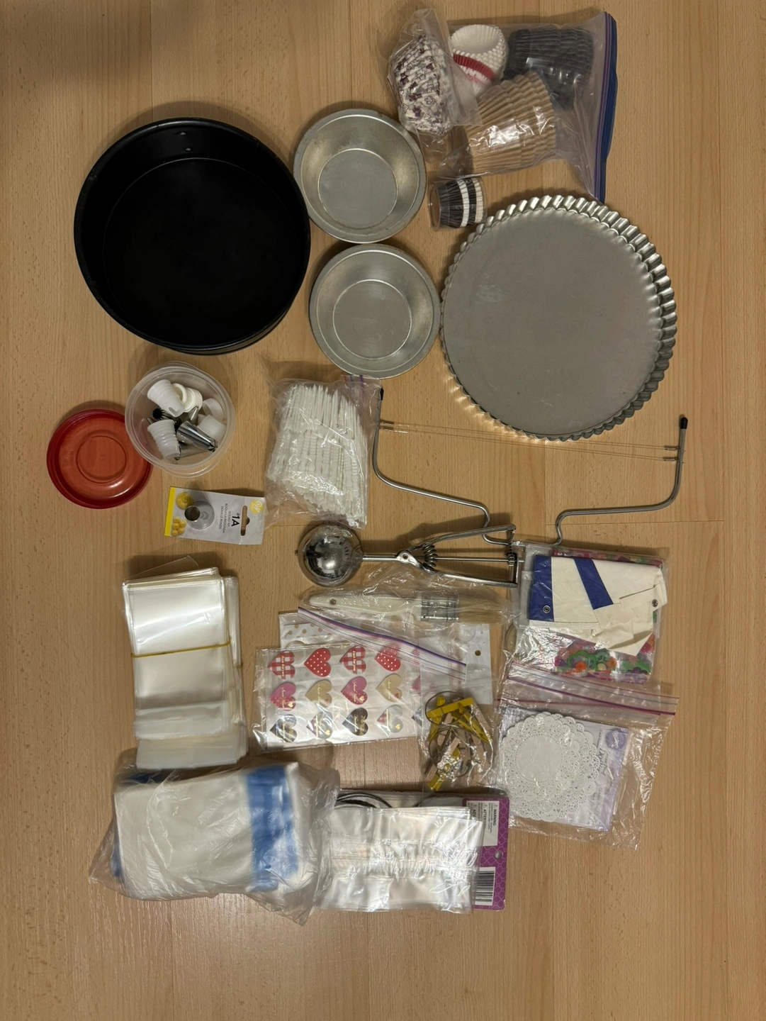 Includes everything in the photo. -9” pie pan -8” cake pan -piping tips -cupcake liners -cake cutter -ice cream scoop -doilies -clear bags for cookie wrapping -stickers -brush -plastic picks -wood clips Cash and pick up only. Pet free and smoke free home.