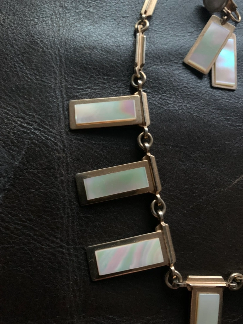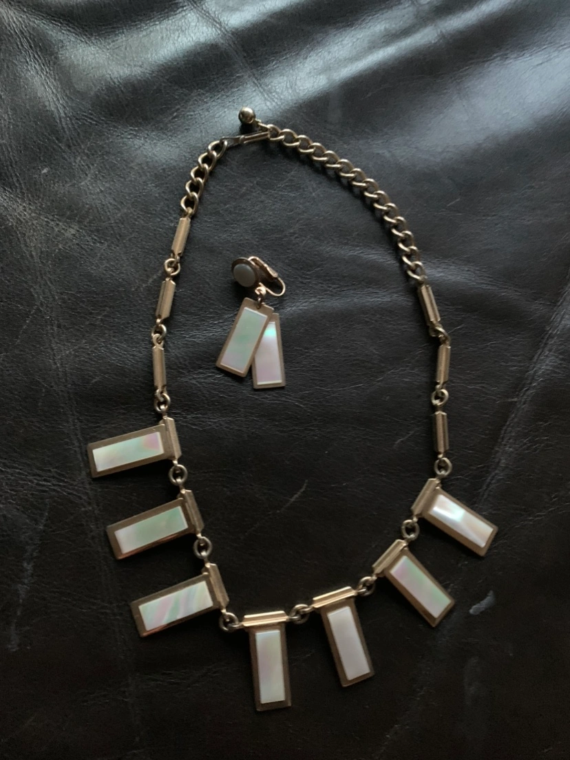 1000+Vintage costume jewelry necklace with “abalone” rectangles. Comes with one matching clip on earring.