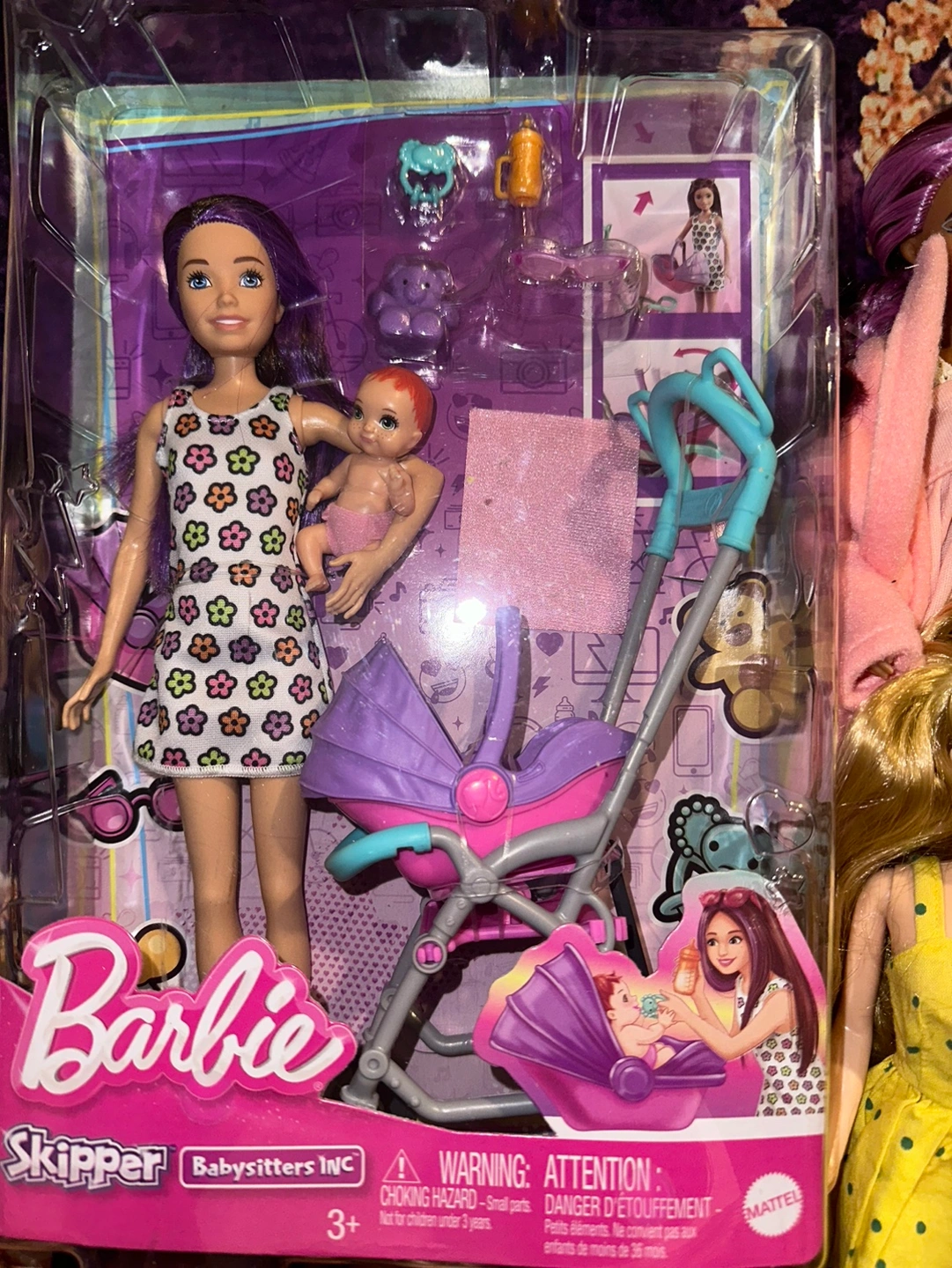 Includes skipper, doll, baby stroller, redhead baby in pink diaper with accessories