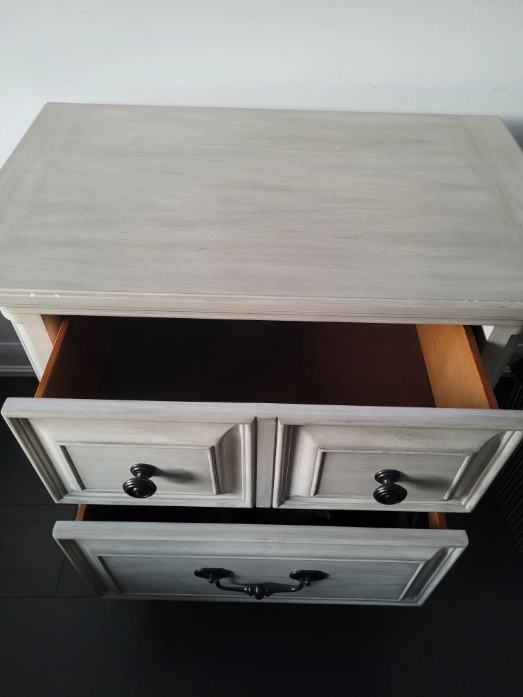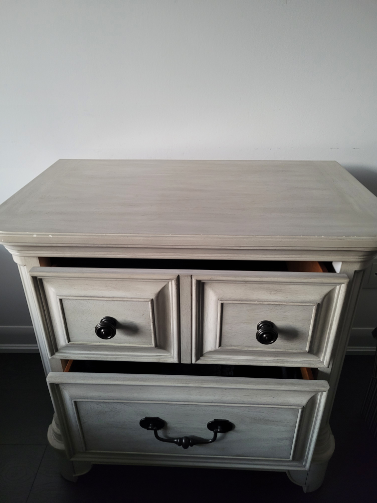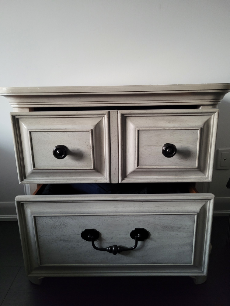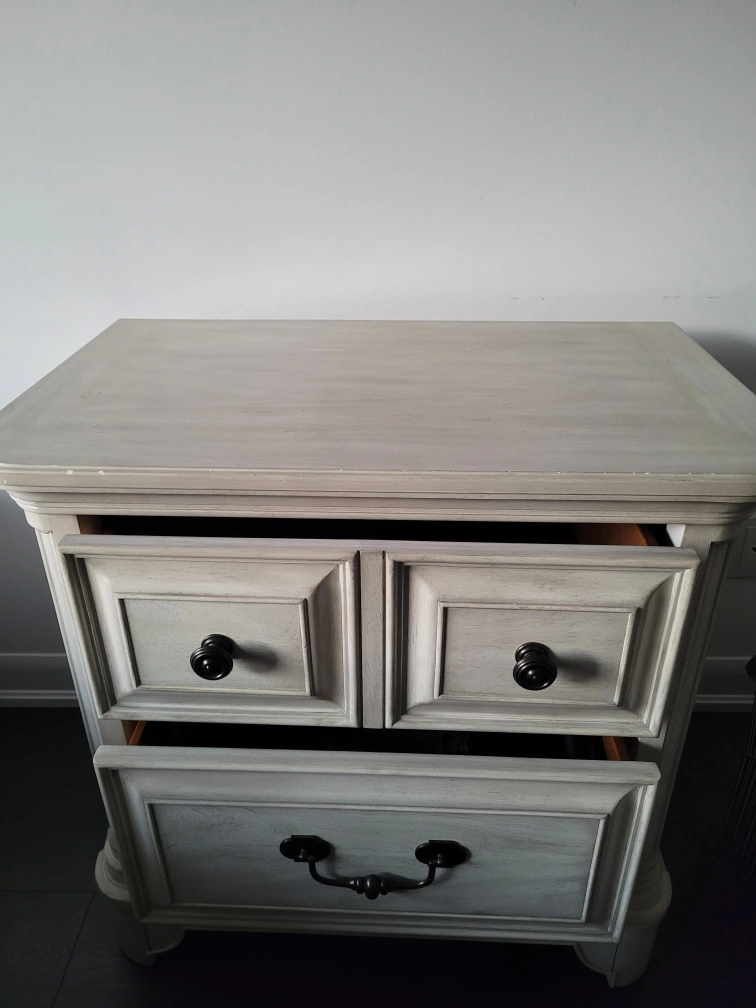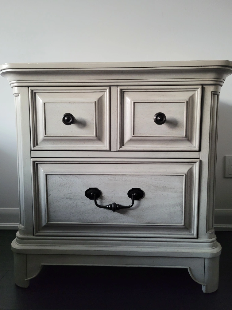 A cream distressed nightstand with drawers on the top and bottom. The top features black knobs, and the bottom has a black pull handle. Ideal for bedroom or living room storage.