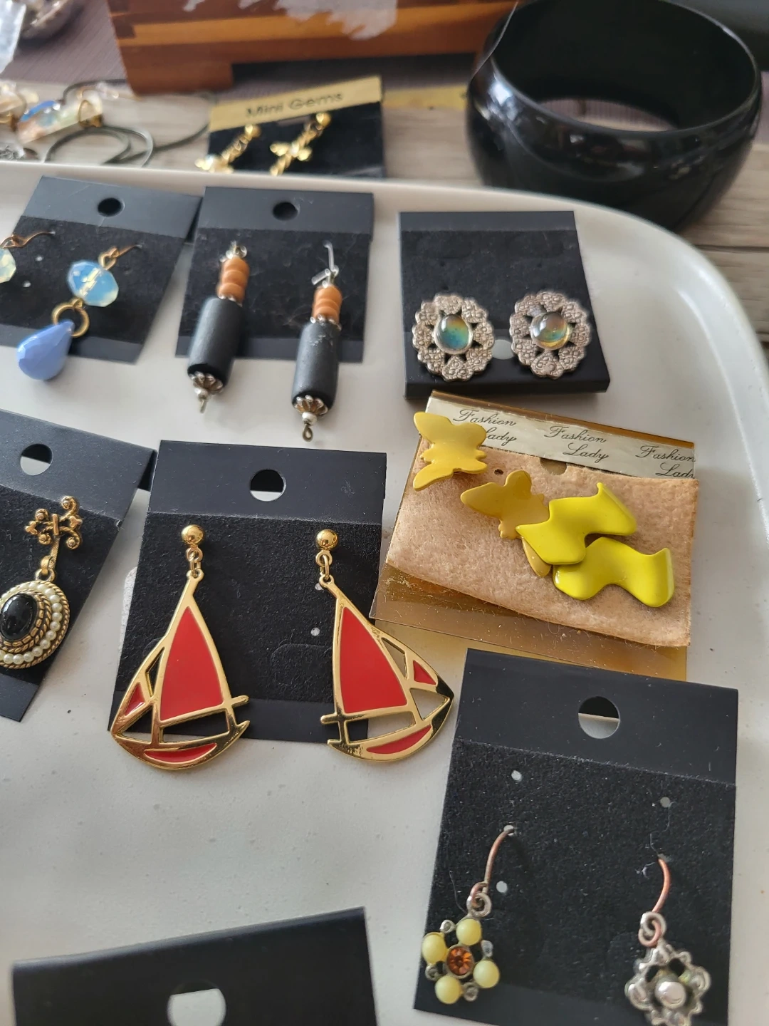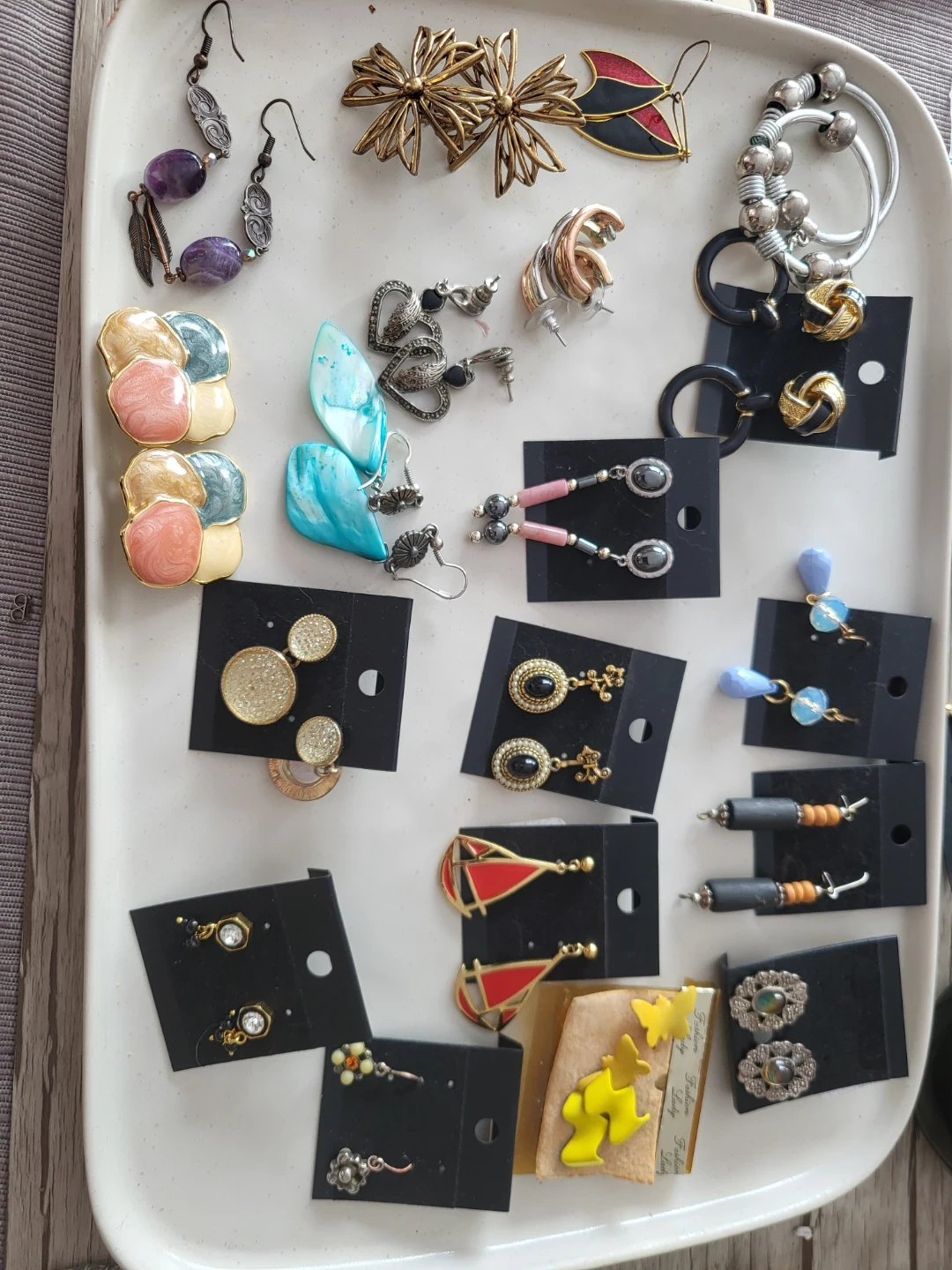 A collection of various earrings with different styles and materials. Includes dangling earrings, stud earrings, hoop earrings, and shell earrings. Most earrings come on display cards.