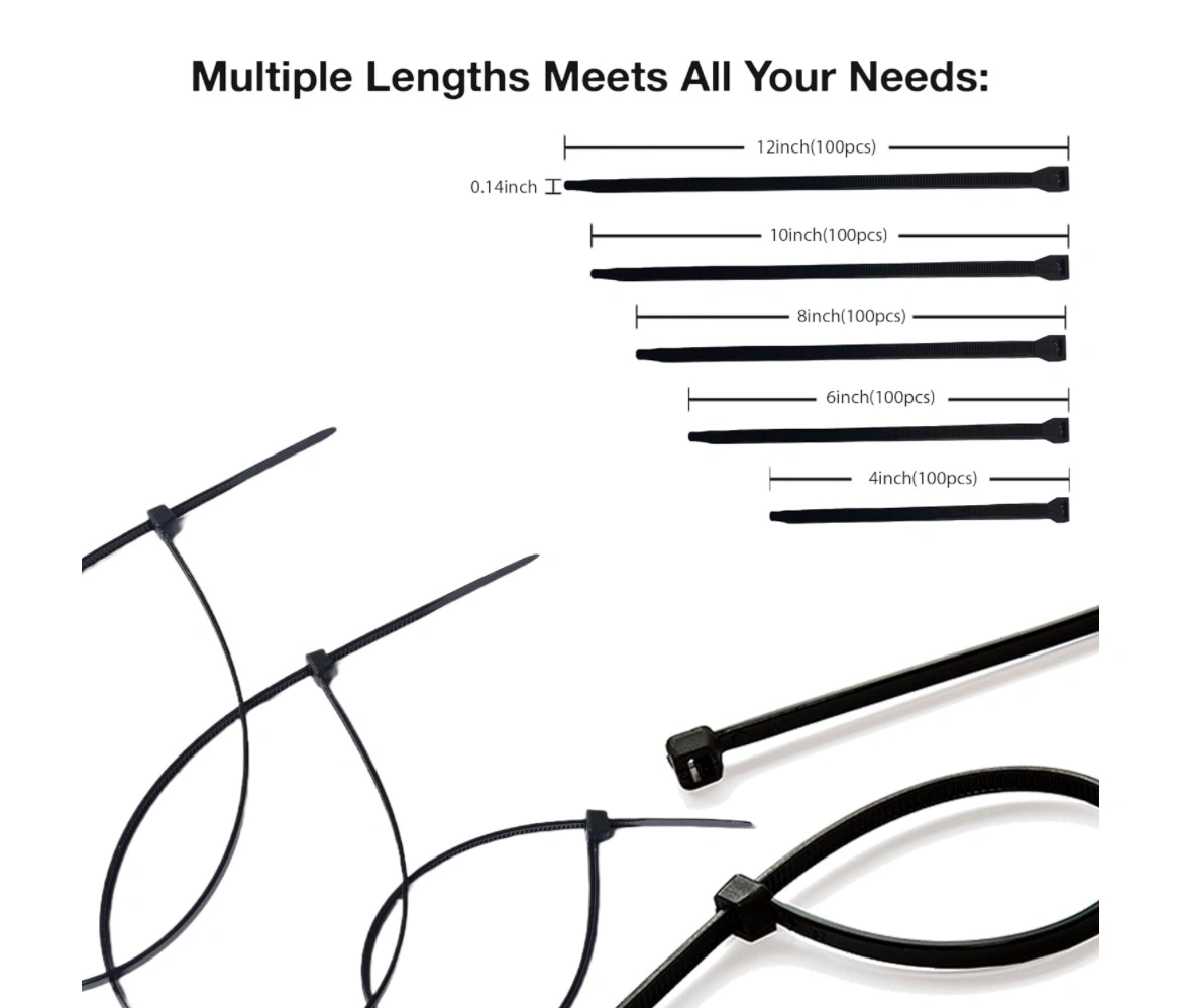 Multi-purpose for cables, wires, pipes, and more. Includes 600 black zip ties in 6 sizes (4" to 14"). Ideal for commercial & personal use.