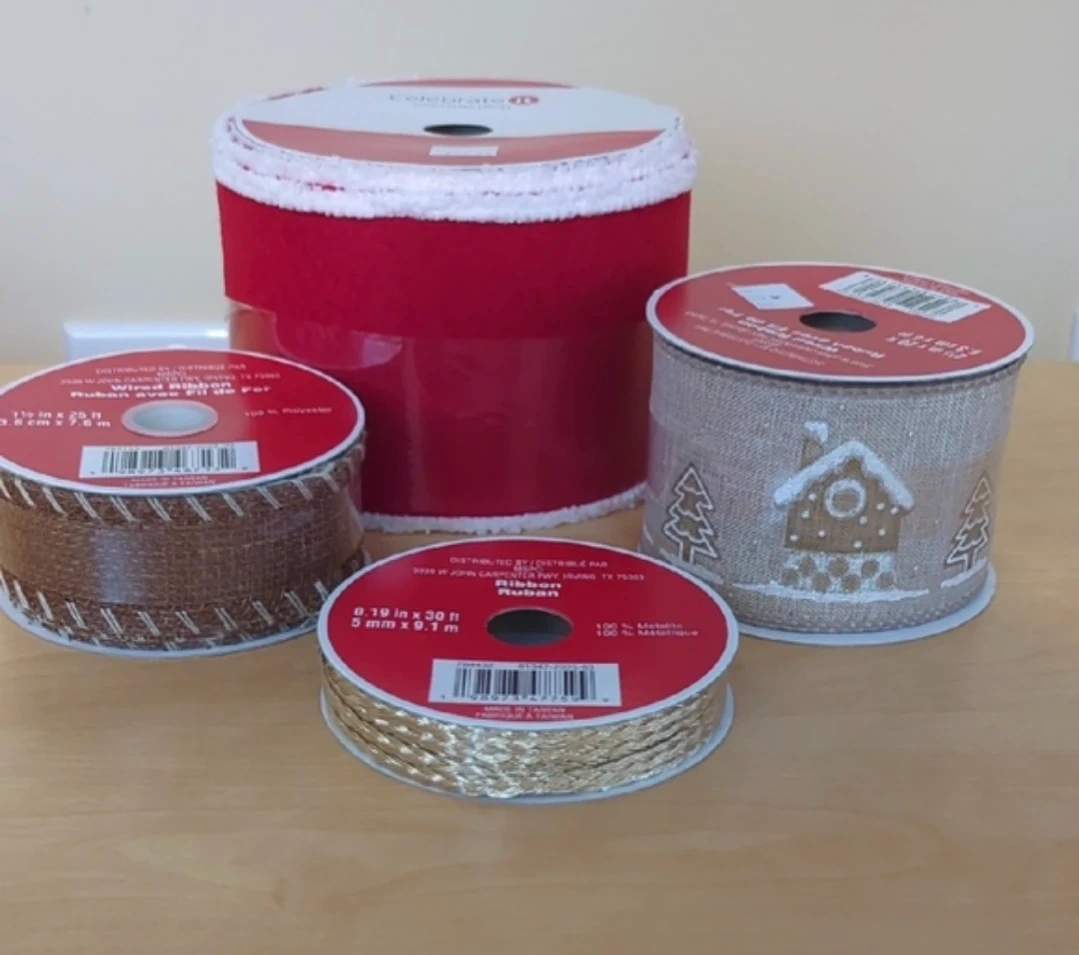 This lot includes four spools of Christmas ribbon. One large red spool with a white fuzzy trim, a burlap spool with a gingerbread house and trees design, a brown spool with a stitched pattern, and a gold metallic spool. All ribbons are 100% polyester.