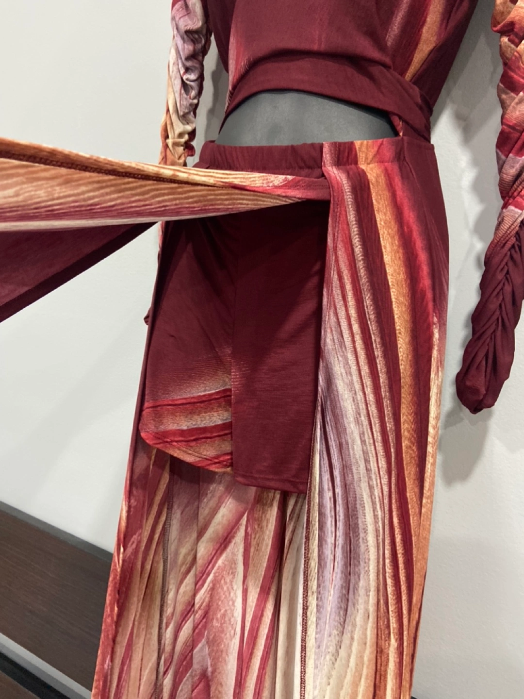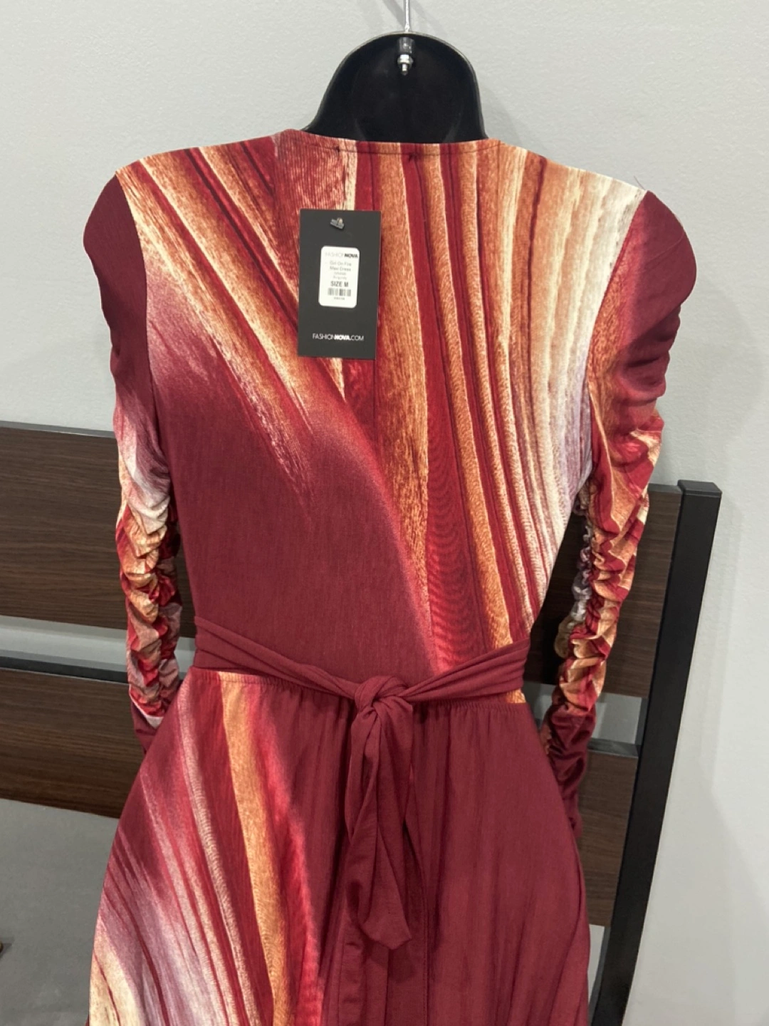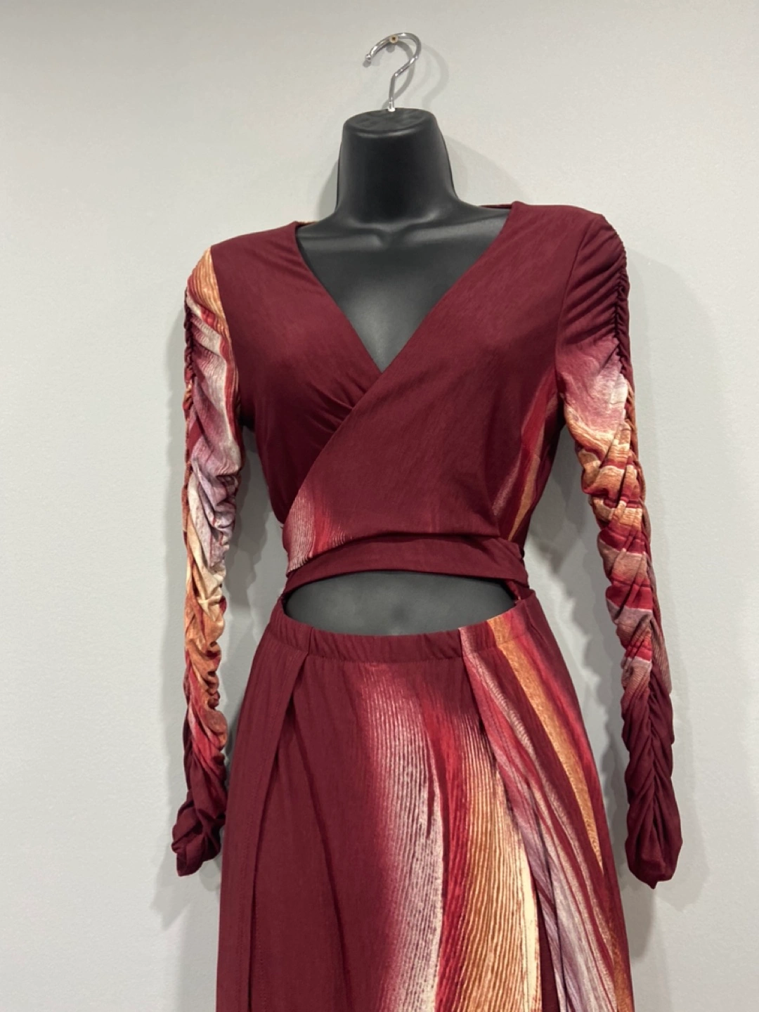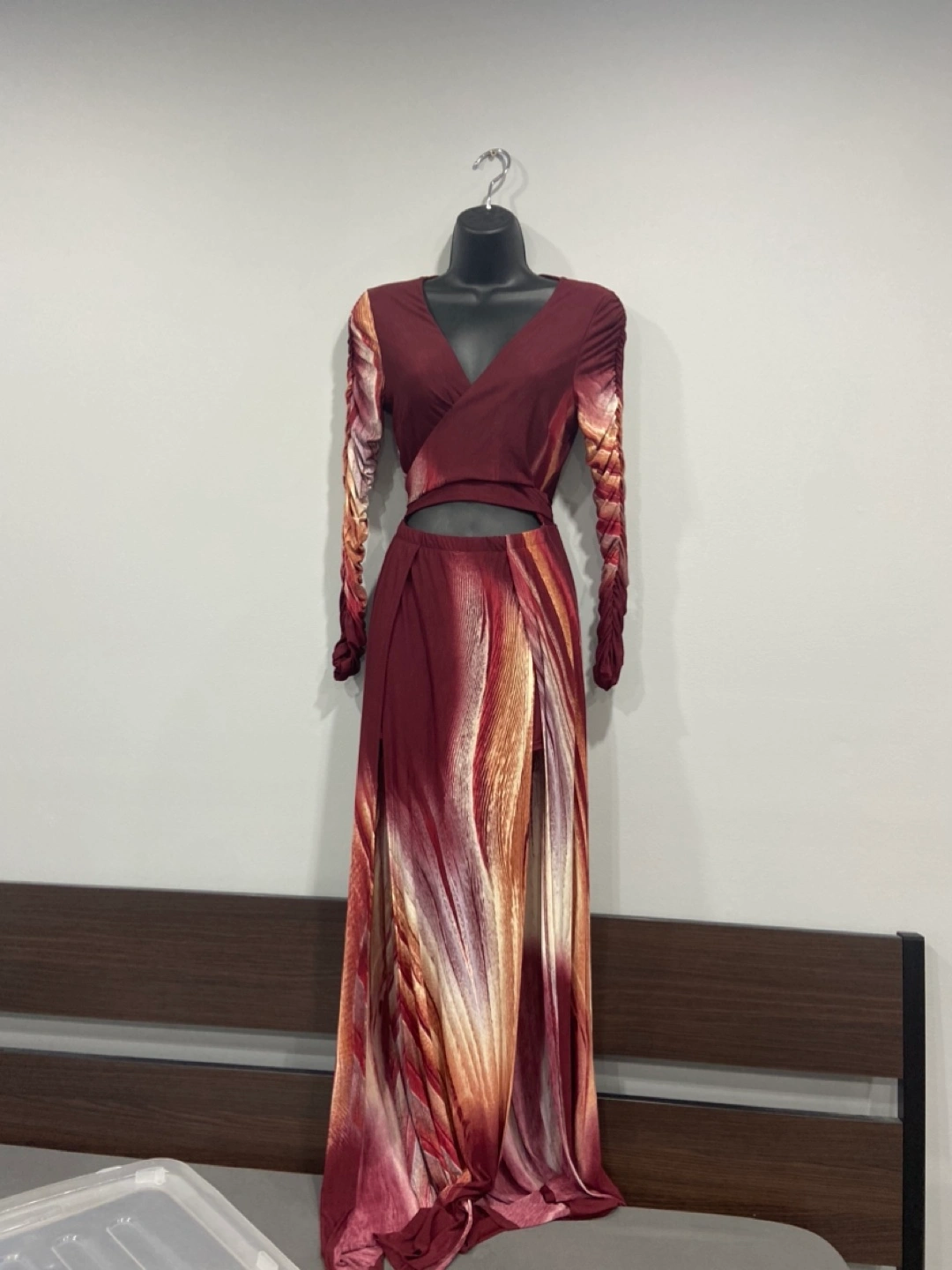 Brand new with tags attached in a size medium. Maxi dress (could be worn as a sun dress or a formal event) It has built in shorts and high leg slits but that’s what the shorts are for. Super chic look, dress is very flowy and beautiful burgundy color. Bodice is a wrap top and hence you will adjust it. Sleeves are a bit tight. 96% polyester and 4% spandex. Dress fits like a S/M