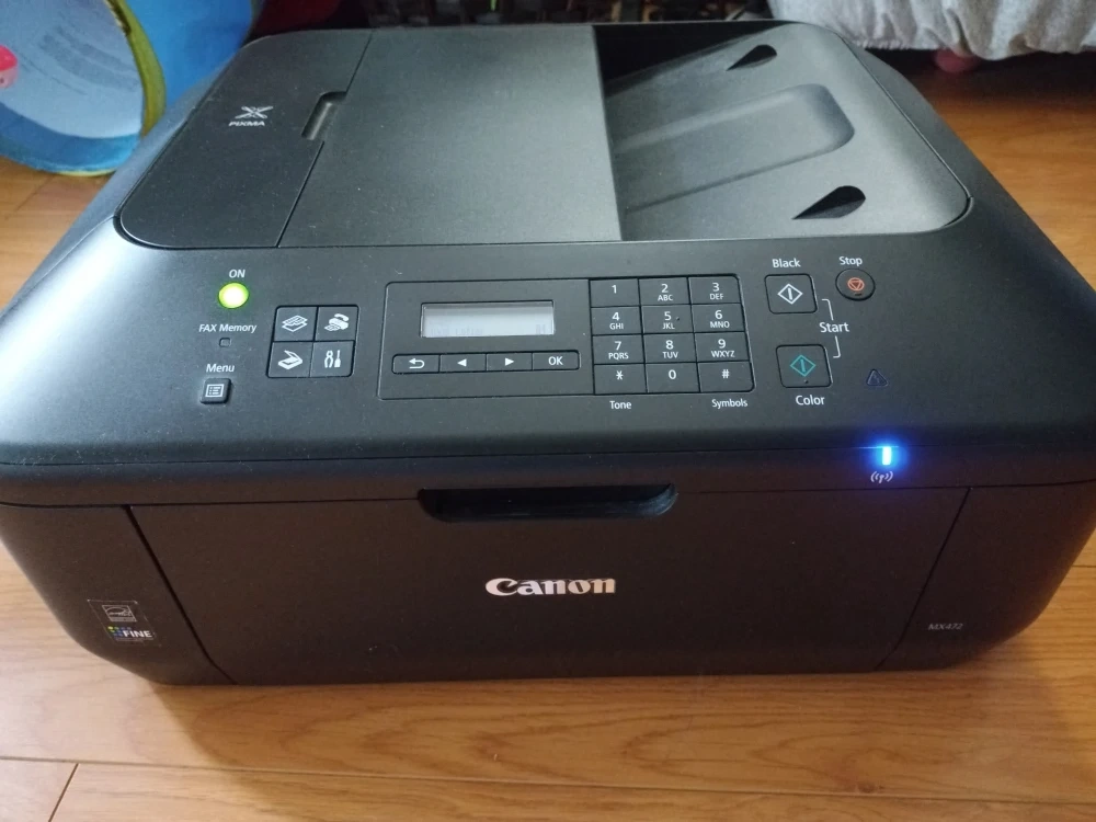 working condition with 90% full black ink and about 25% colour ink left. Model mx472. Has copying, print, fax and scan modes. you'll need a printer cable for hardwire connection or use wifi/lan.