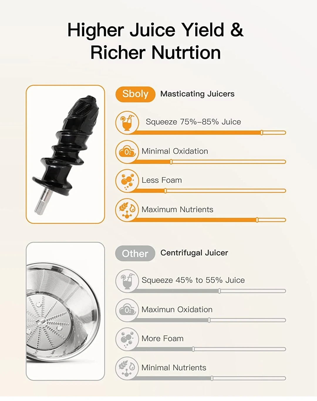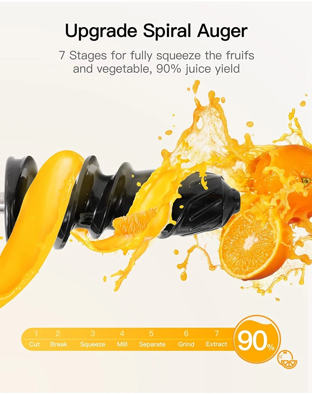 Slow extraction technology for maximum nutrition - Juicer Extractor has an upgraded spiral auger that uses a PMMA material offering 7 Stage extraction to maximize juicing. This juicer perfectly separates the pulp from the juice while delivering maximum nutritional value. Your juice will retain 90% more of its nutritional value. This machine is guaranteed to retain essential vitamins, enzymes, minerals, trace minerals and nutrients while reducing foaming and clogging.