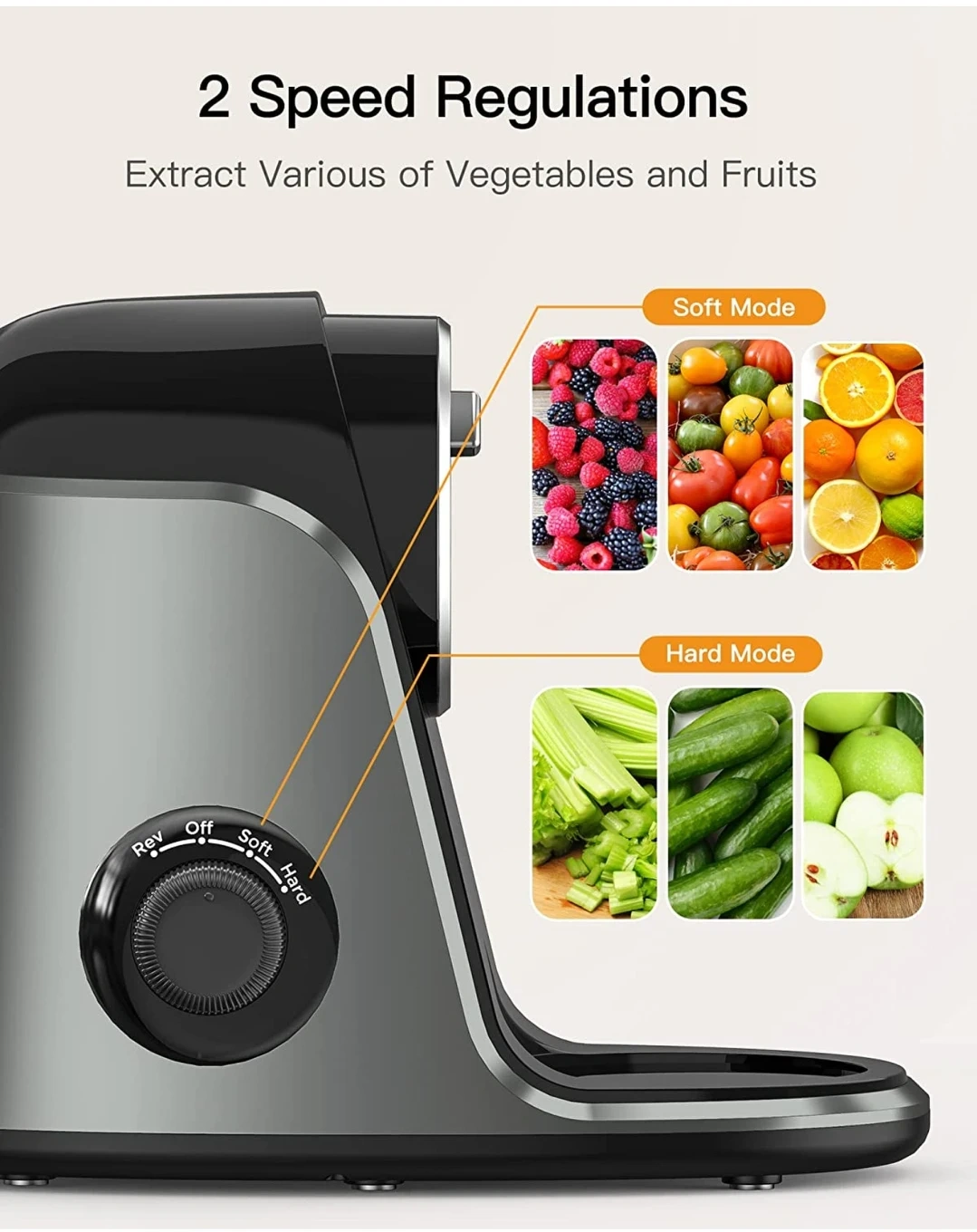 Extracting juice from vegetables and fruit - Our juicer machine has 2 speeds to extract juice from a variety of fruits and vegetables. The Soft mode can be used to extract juice from Kiwi, strawberry and raspberry, oranges, grapes, watermelons etc. The Hard mode can be used to extract juice from celery, apple, carrot, etc.