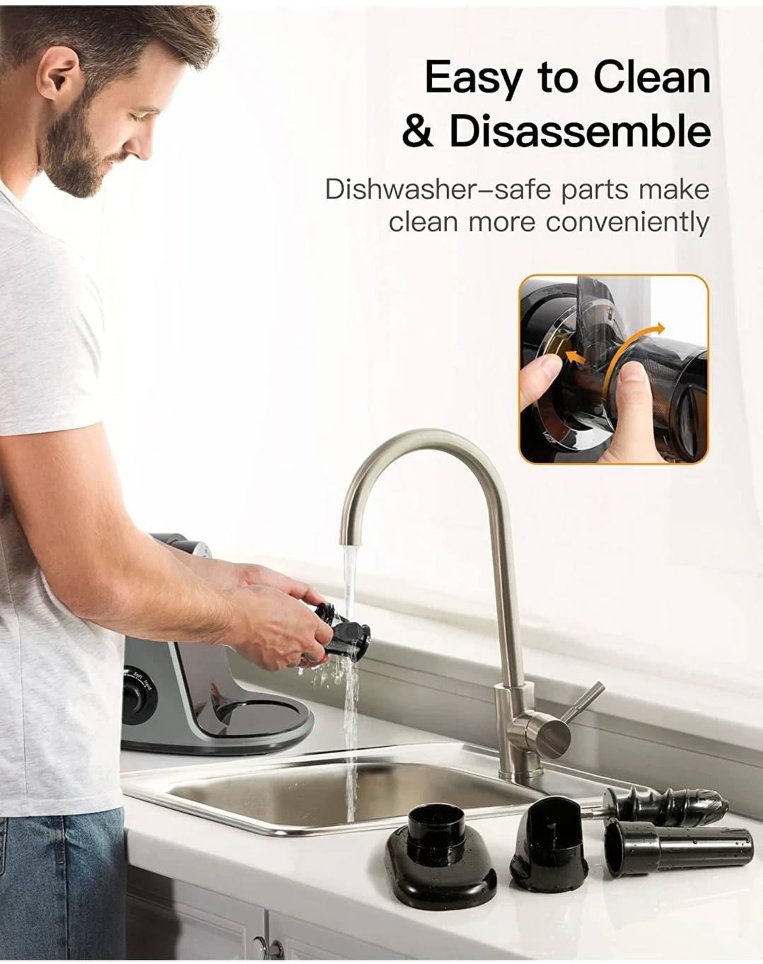 Easy to Clean - The touch button design allows you to take the juicer apart in seconds. The included cleaning brush allows you to clean the entire system in moments. All detachable parts are made of high quality Food Grade material and dishwasher-safe.