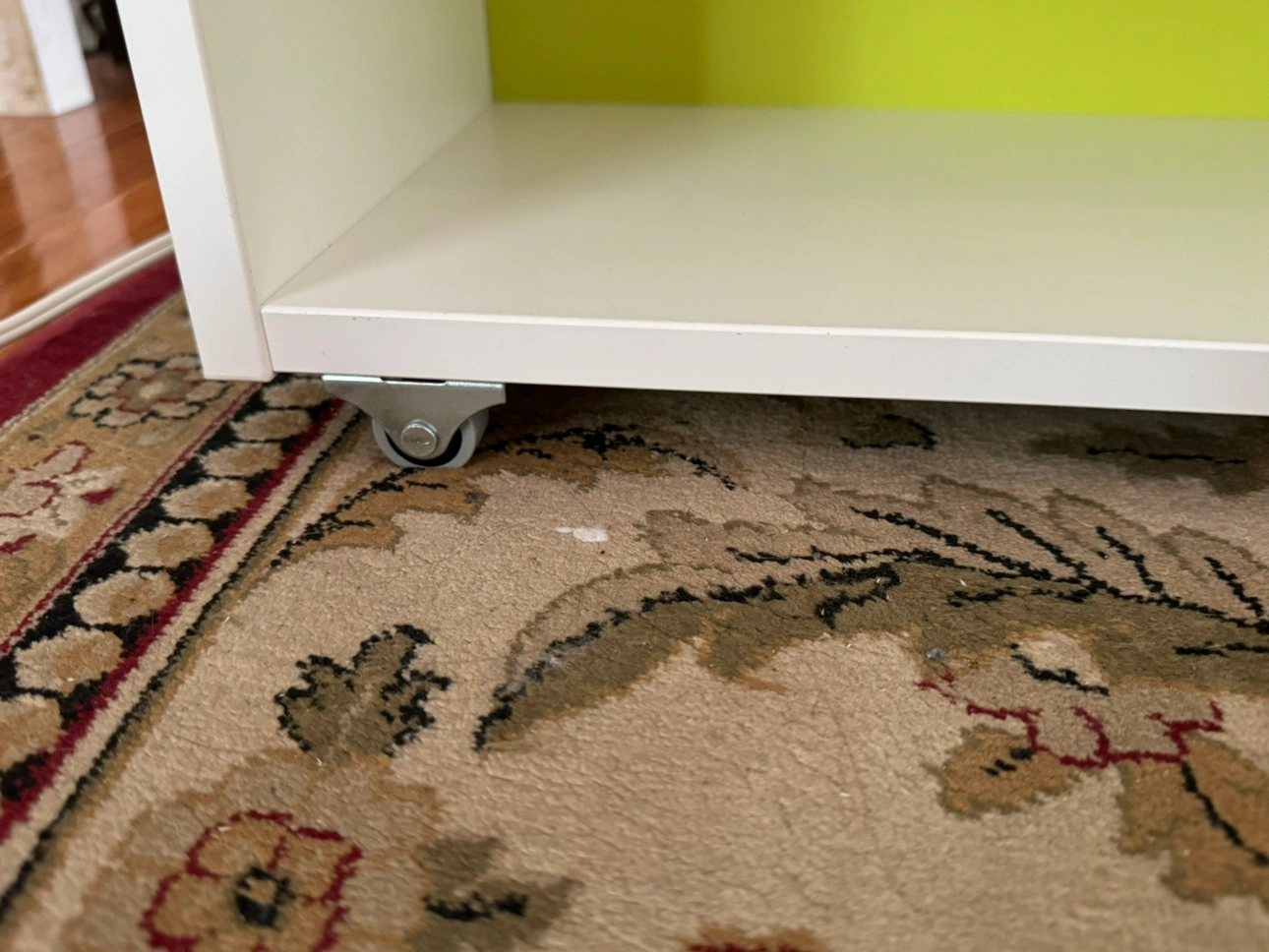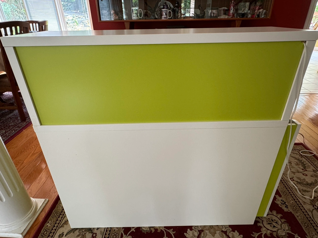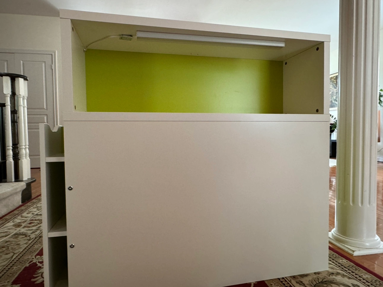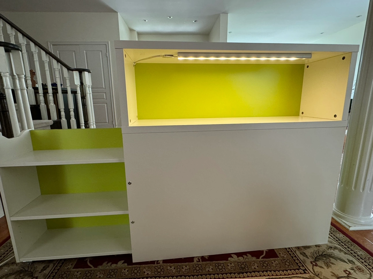 IKEA Flaxa Headboard for a twin bed that has a shelf with light in. The light has a switch to turn on or off in bed. There is a small shelf on wheels that can go into the headboard and is designed to be put on either side of bed. See photos