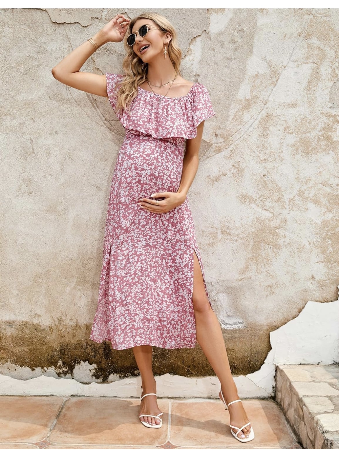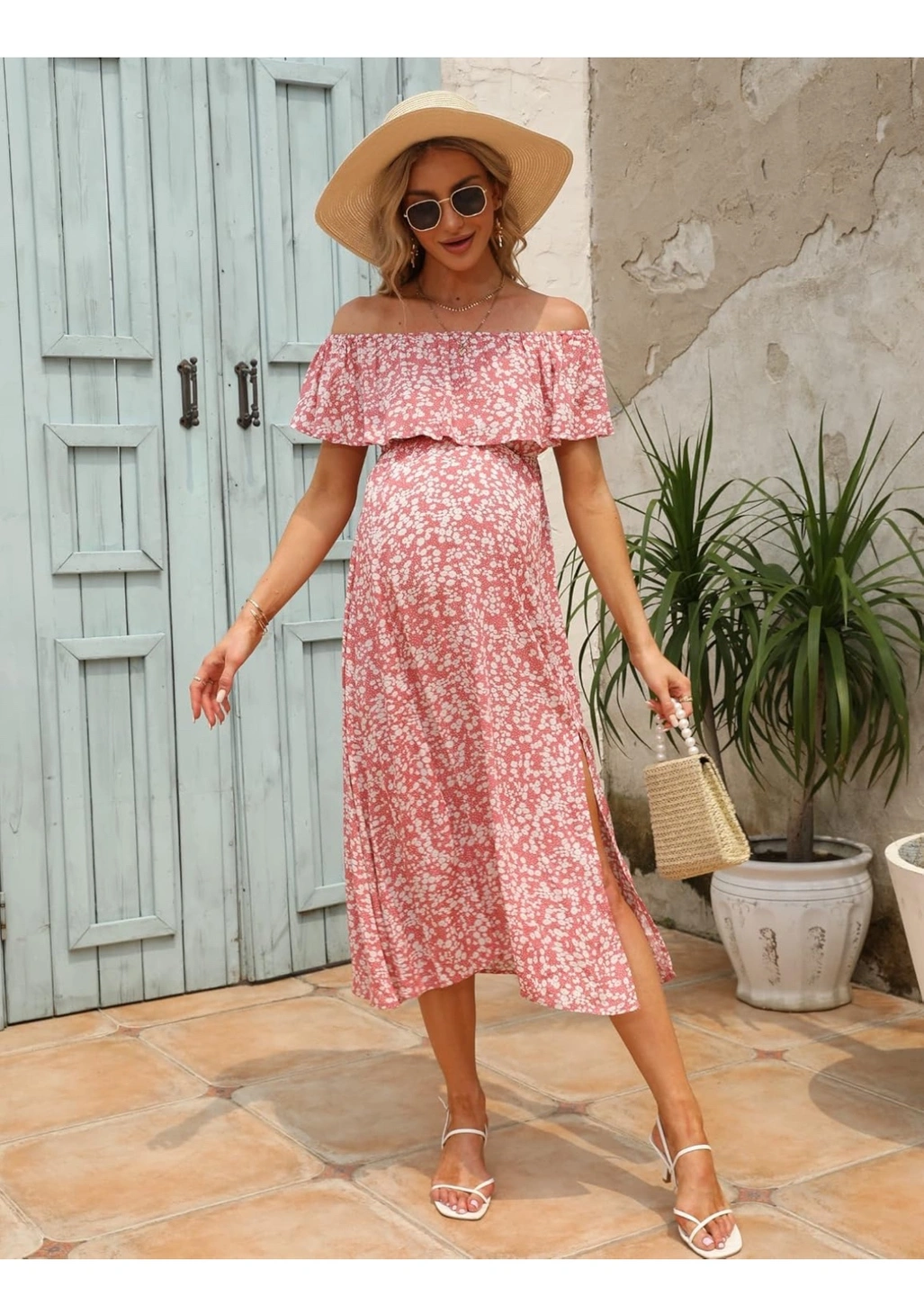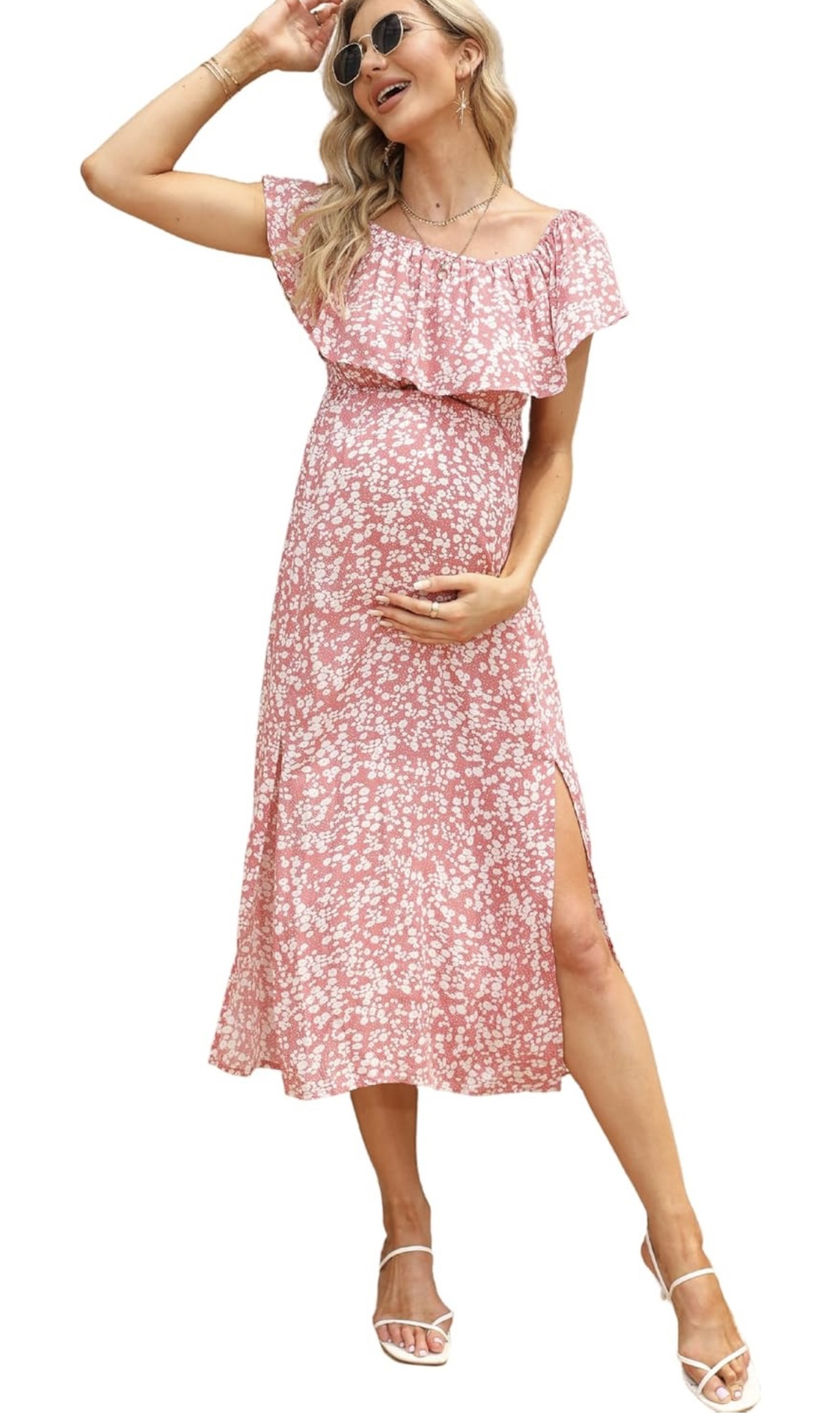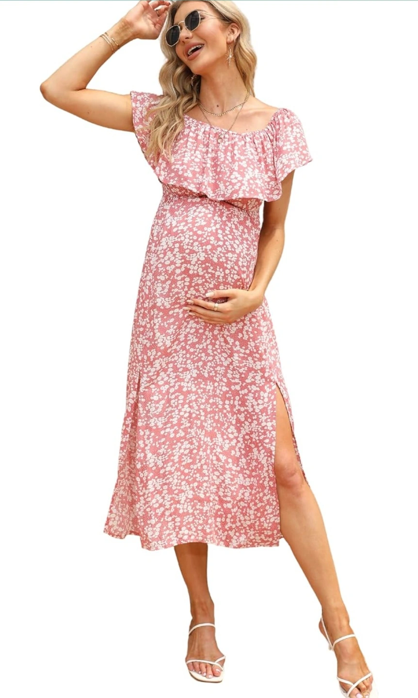 28Women's Maternity Dress Off Shoulder Split Long A Line Dress Casual Maxi Dress Photography Dress Pink