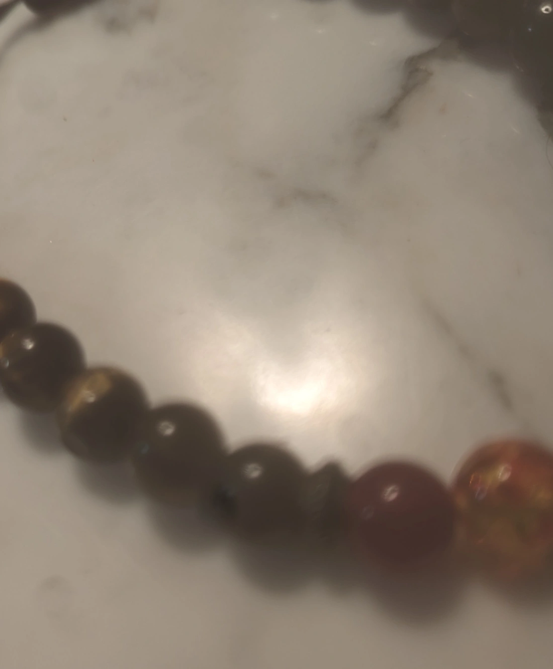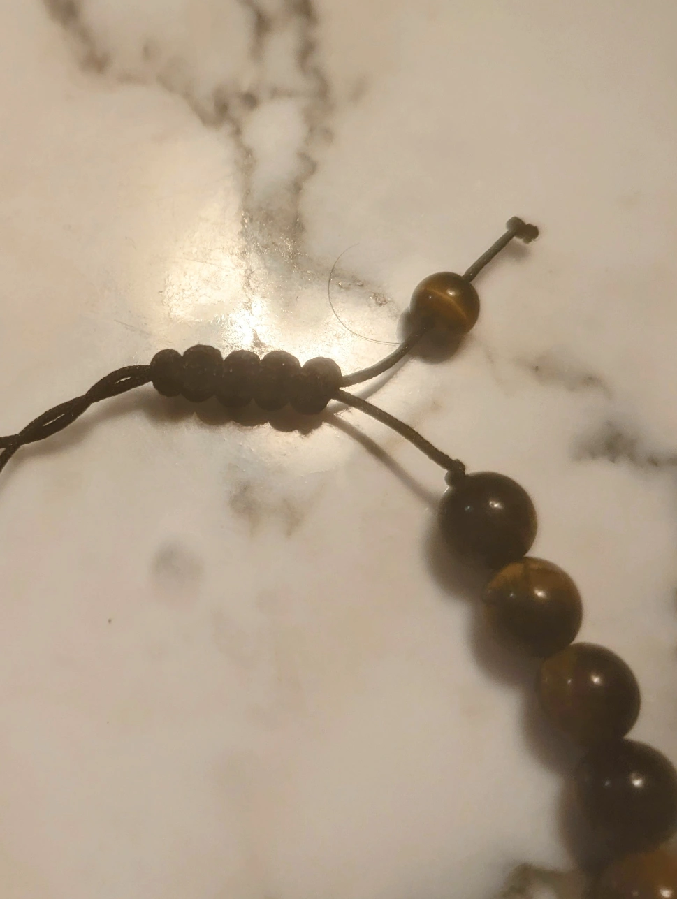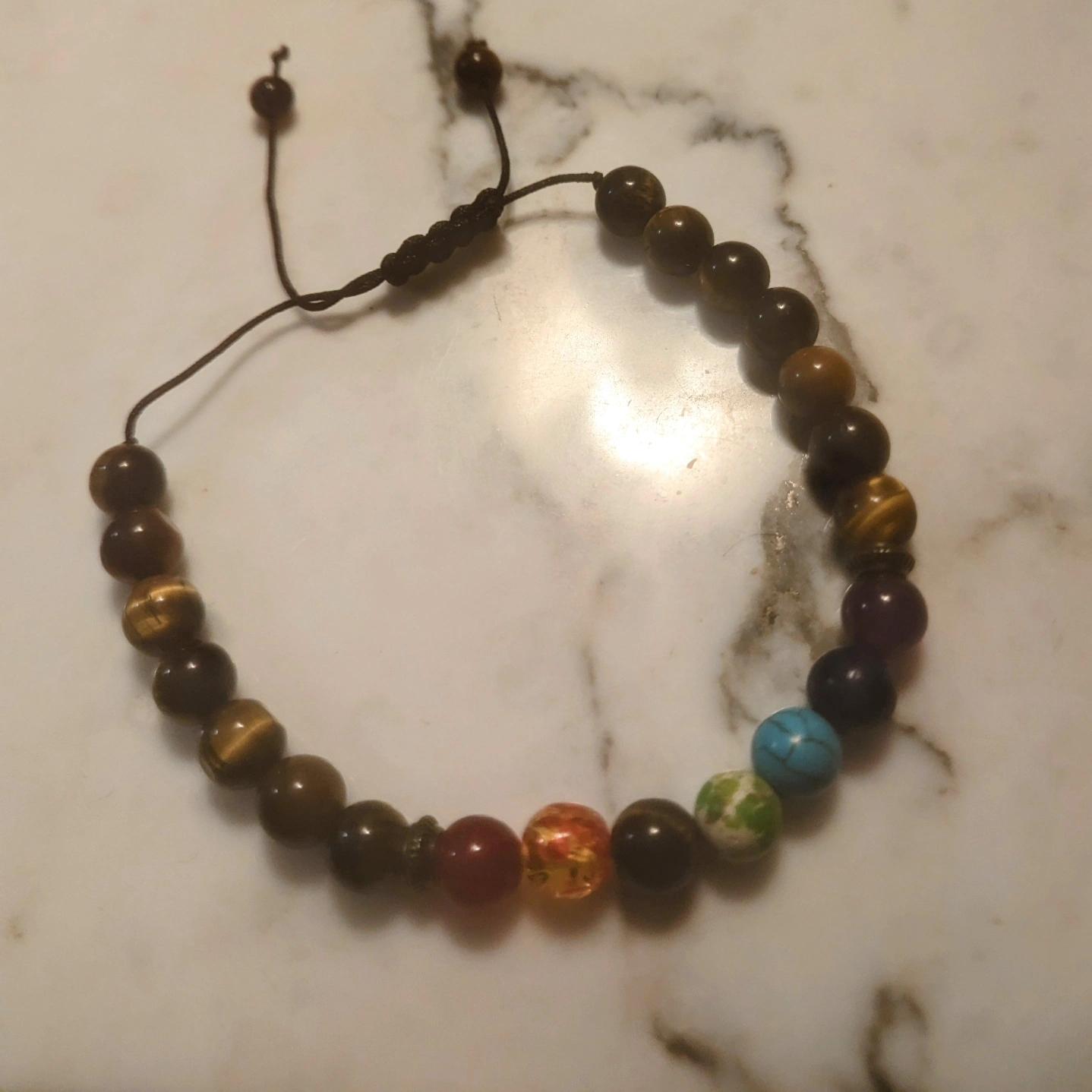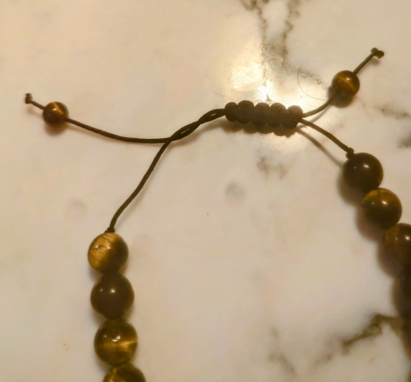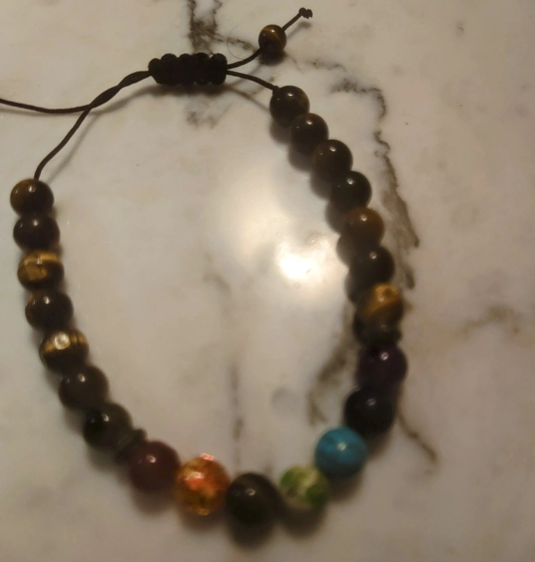 A lovely Bala Bracelet For Free. With Tiger eye beads. And Chakra Beads. 60 mm wide but expands. 6 mm beads 4 mm beads at the expansion ends. I found this in the jewelry drawer. I am not using this item. it was probably an heirloom from a Great Aunt?