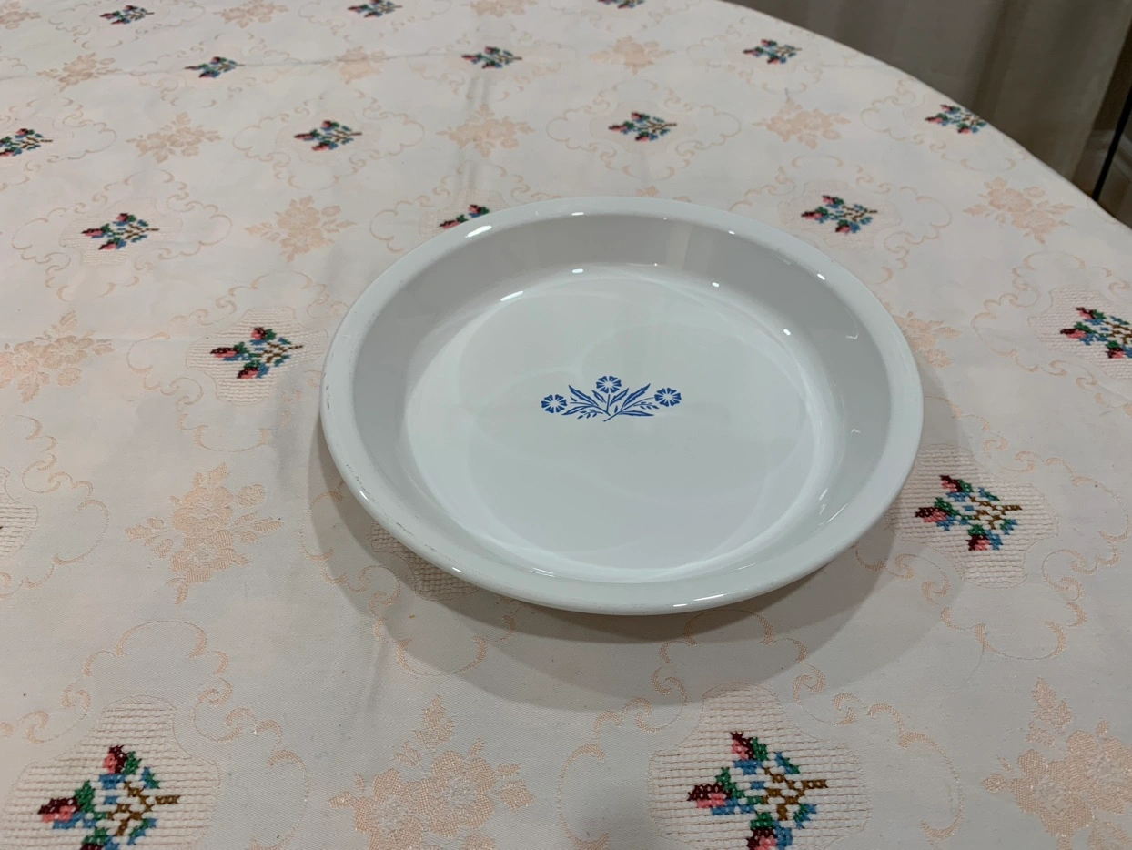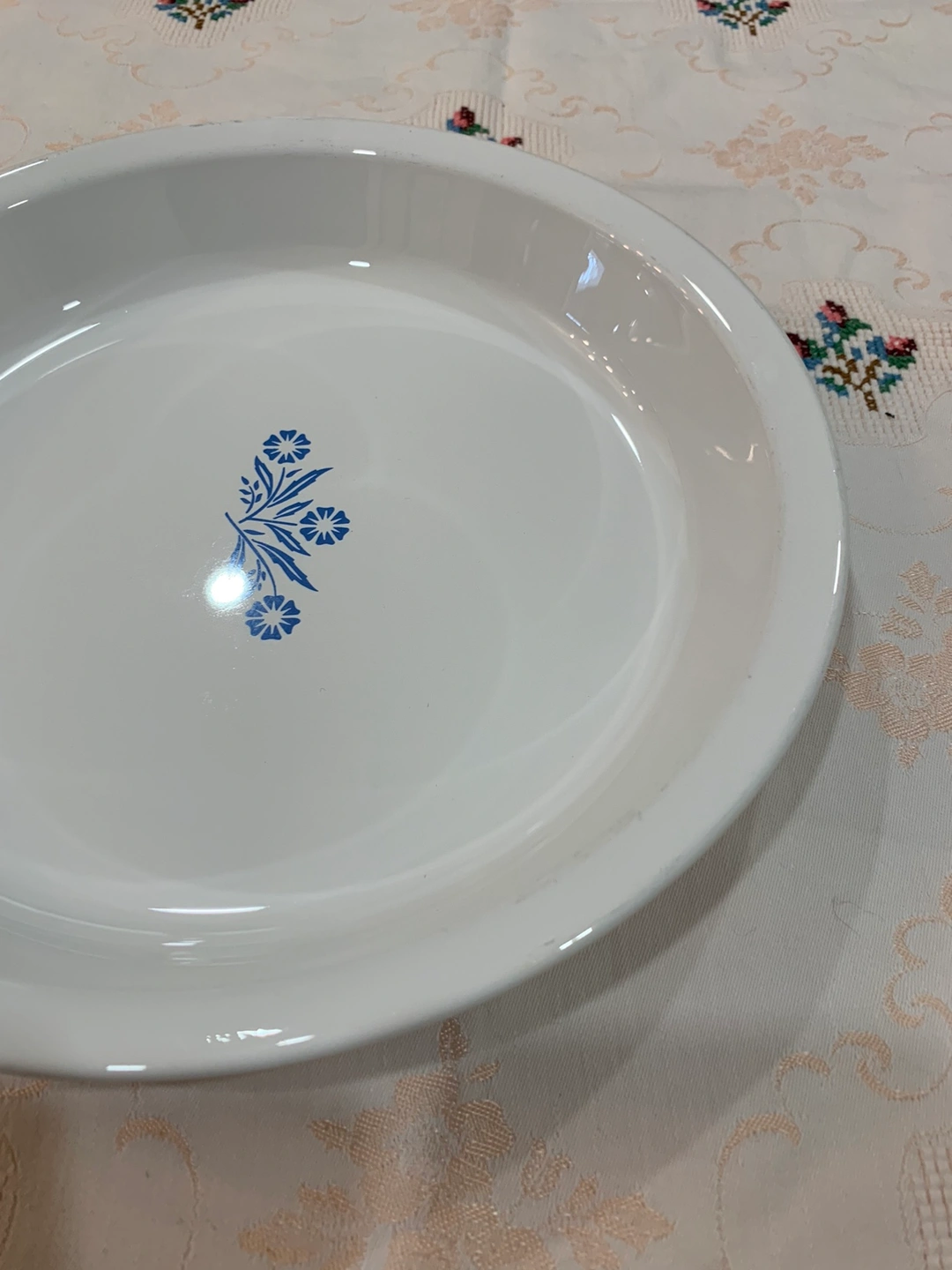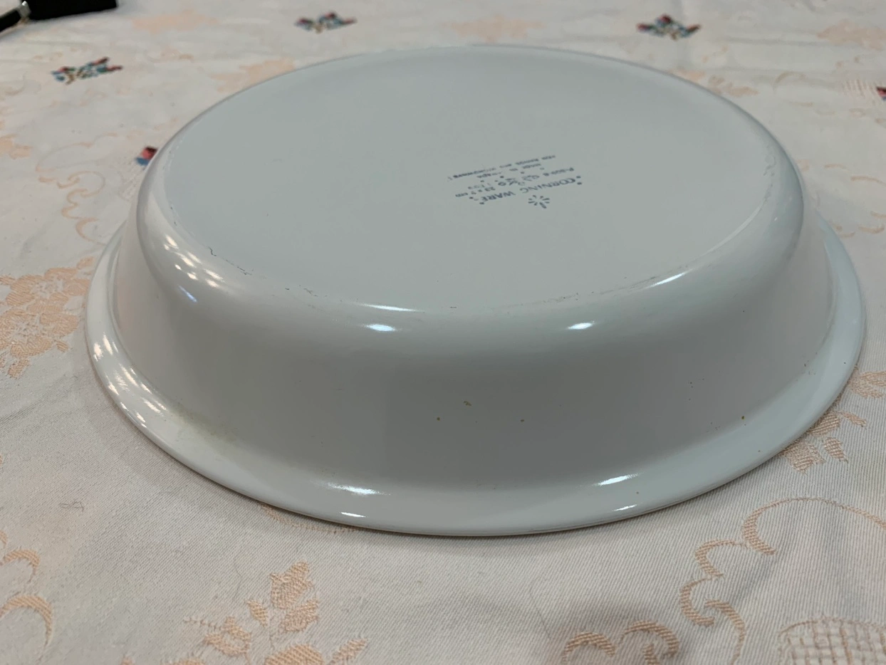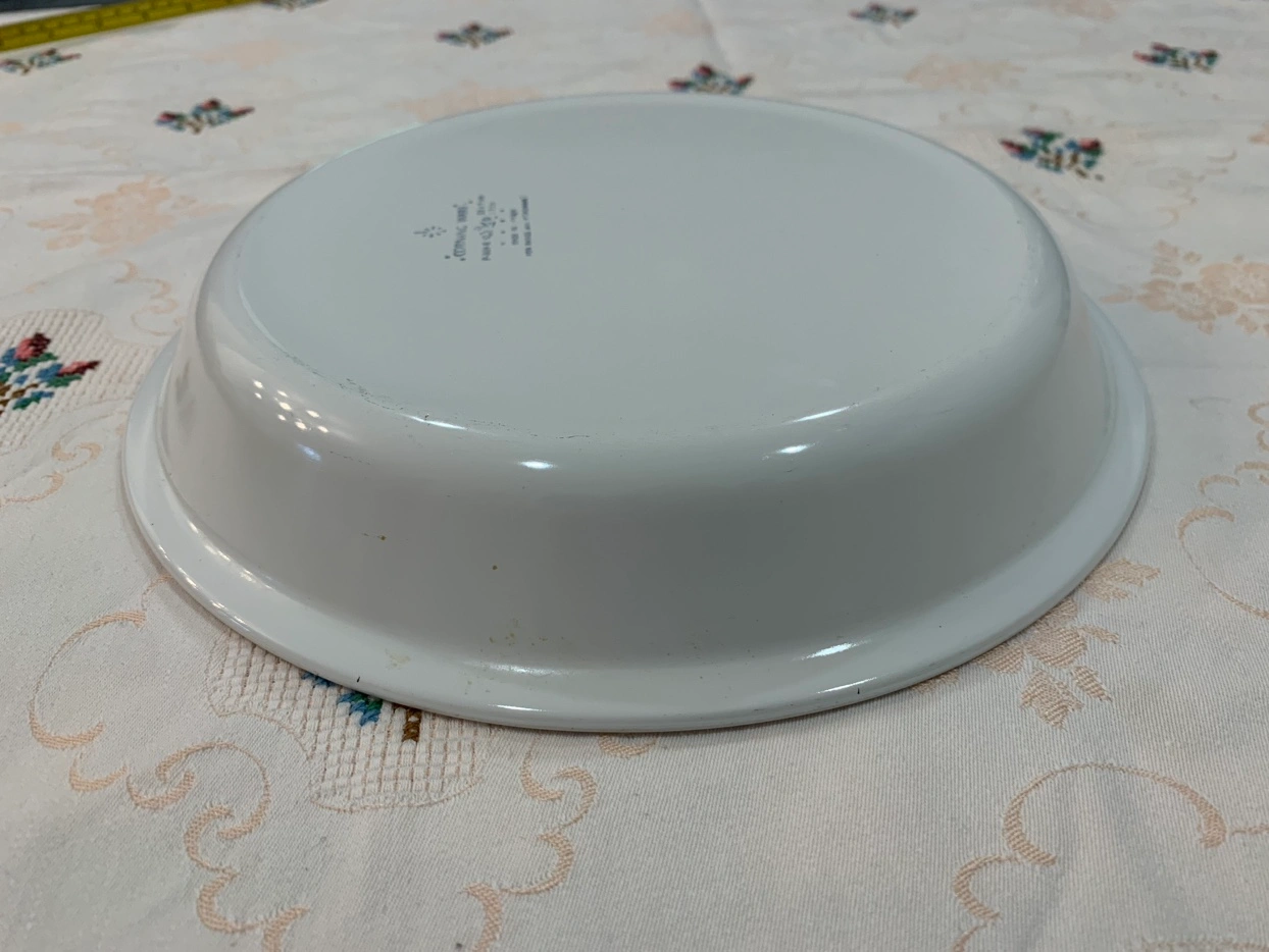 It measures 9 & 7/8” across and 1 & 1/2” deep. It is in really good condition with some light markings on the edge of the plate from use.