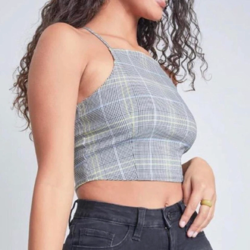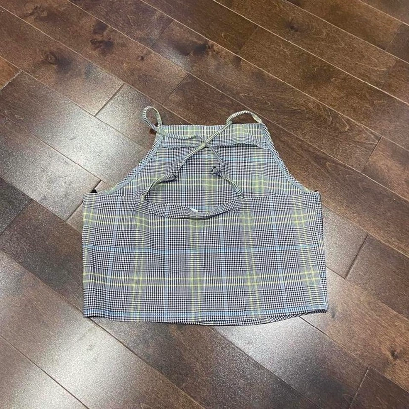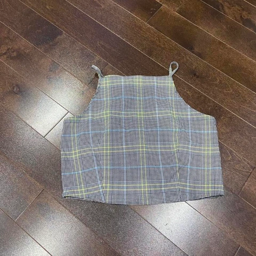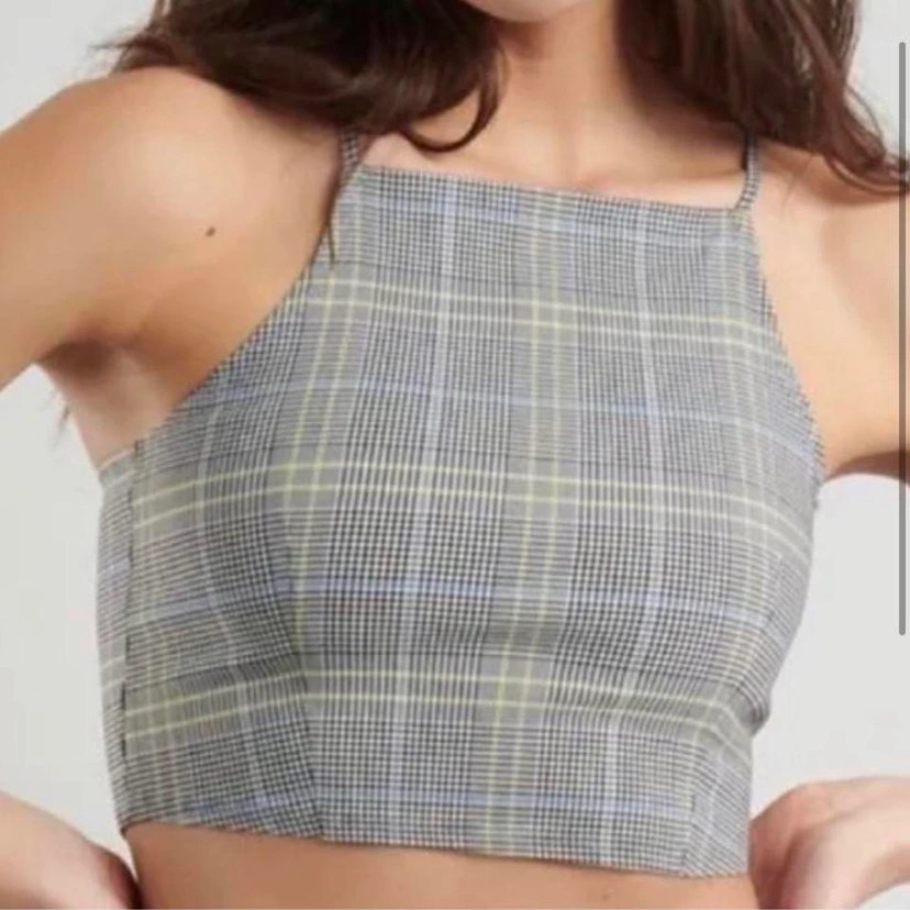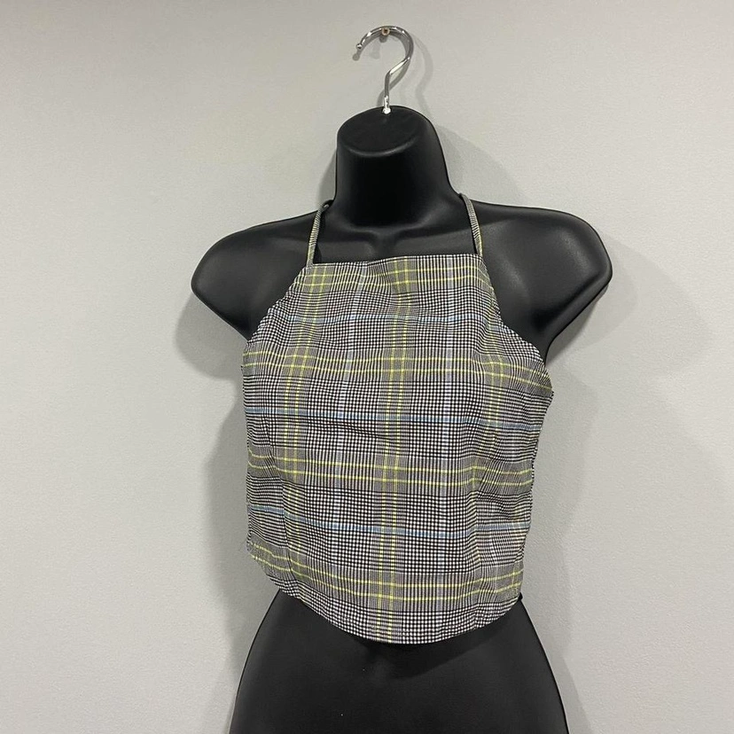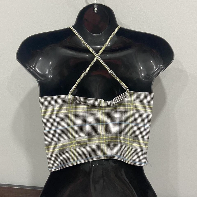 Houndstooth halter crop tank. Brand new without tags. a size medium. halter neckline with adjustable straps that criss cross at the back. Cropped style. pretty stretchy. Houndstooth pattern.