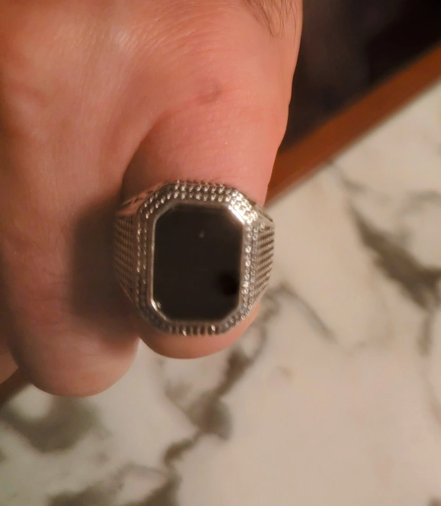 1000+Size 10. Steel base . Silvery tone. 3 mm thick. Plague silver plated. Worn only to show in pictures. Condition : new I was cleaning up my jewelry box and came across this men's / teen's ring. Very stylish . Rather than waste I would rather recycle. Any one need a free ring? Exentuate your hand.? Fingers,?