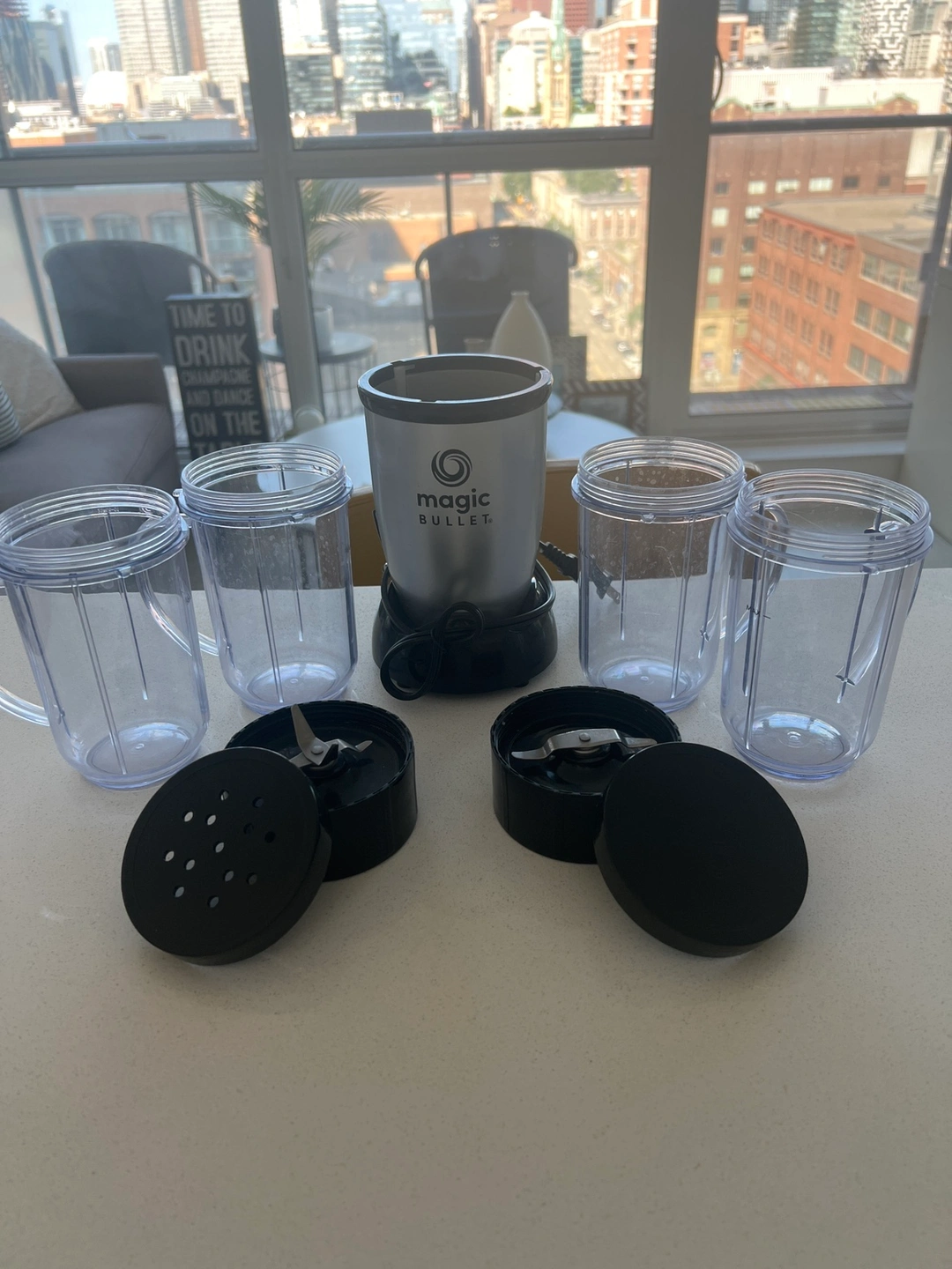 Lightly used Bullet with lid, strainer, 4 cups (with handles) and 2 different blender heads. Too small for me, ended up getting a Vitimix blender instead.