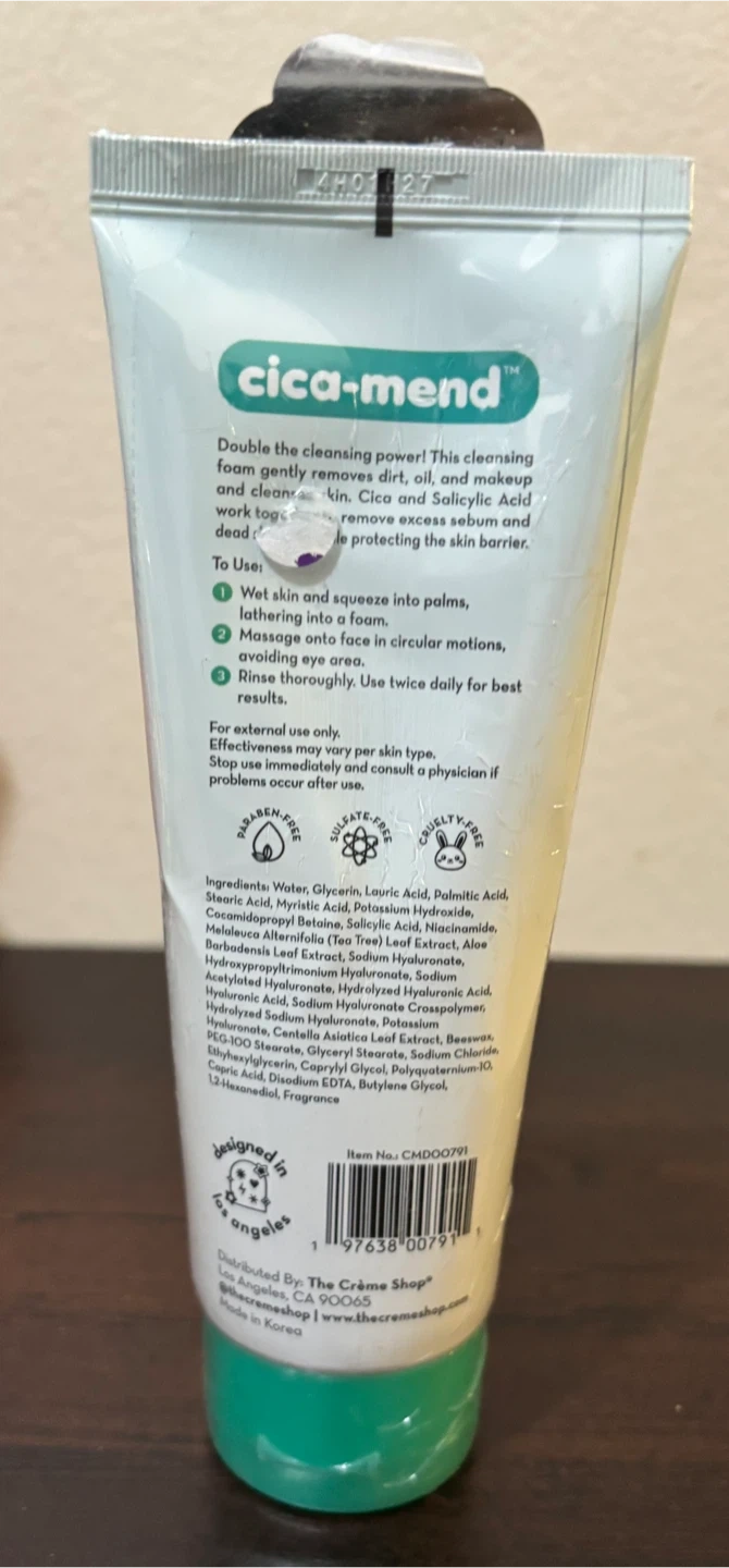 This is cica-mend Blemish Care 2-in-1 Cleansing Foam. It gently cleanses dirt, oil, and makeup. Made in Korea, it's suitable for delicate and blemish-prone skin.