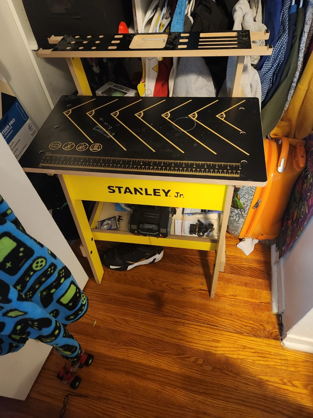 This Stanley Jr. workbench is a great setup for young builders. It has angle guides, a ruler, and a durable construction. Perfect for kids who love to build and create!